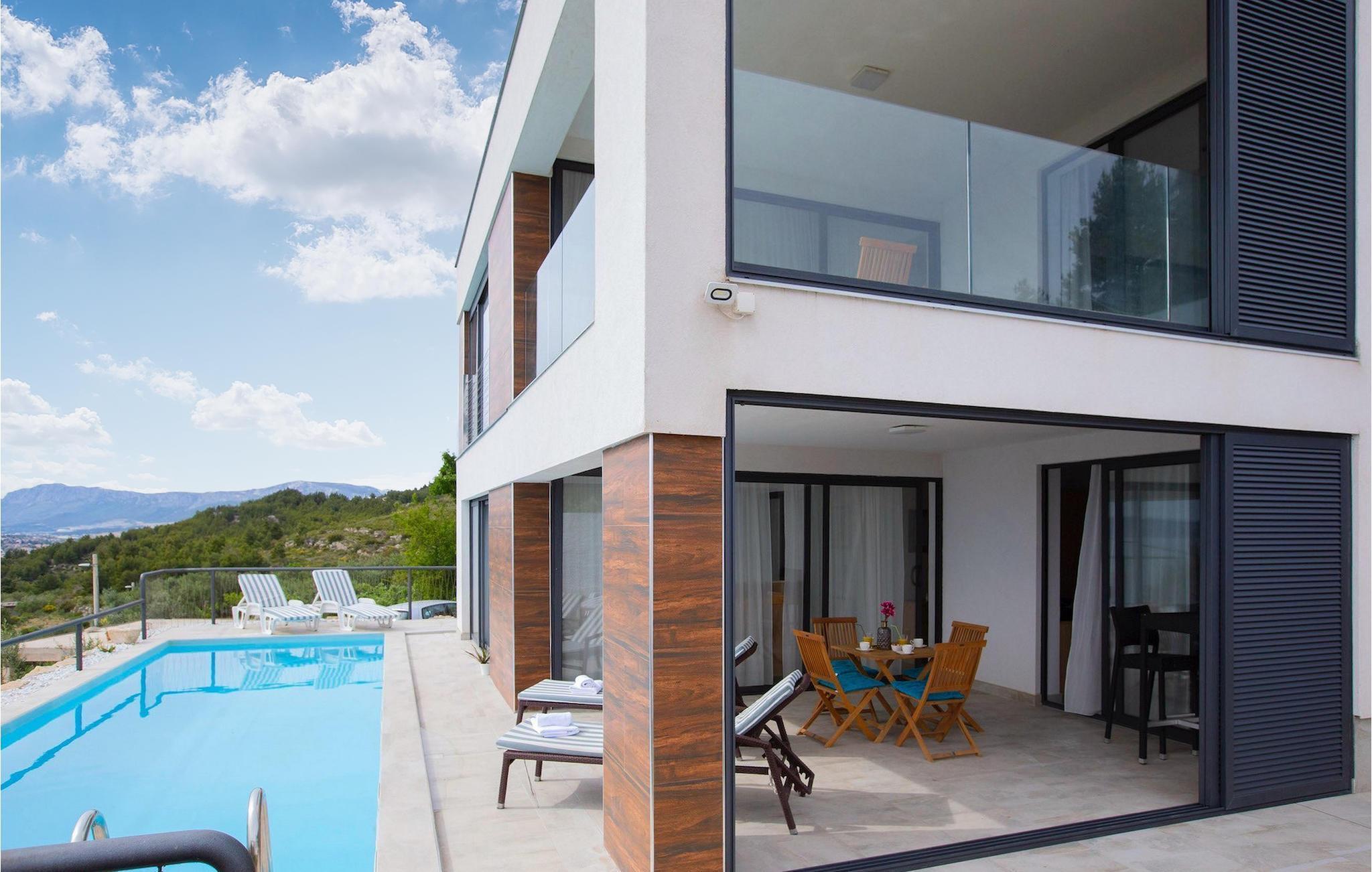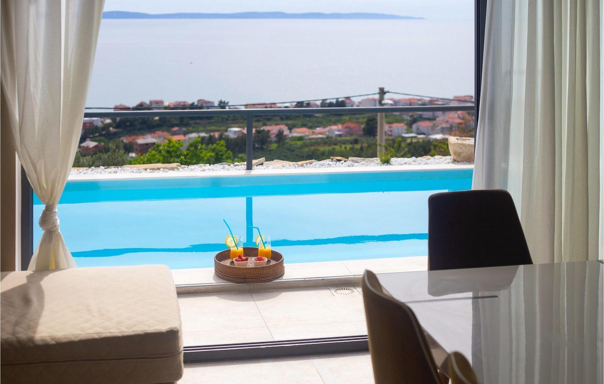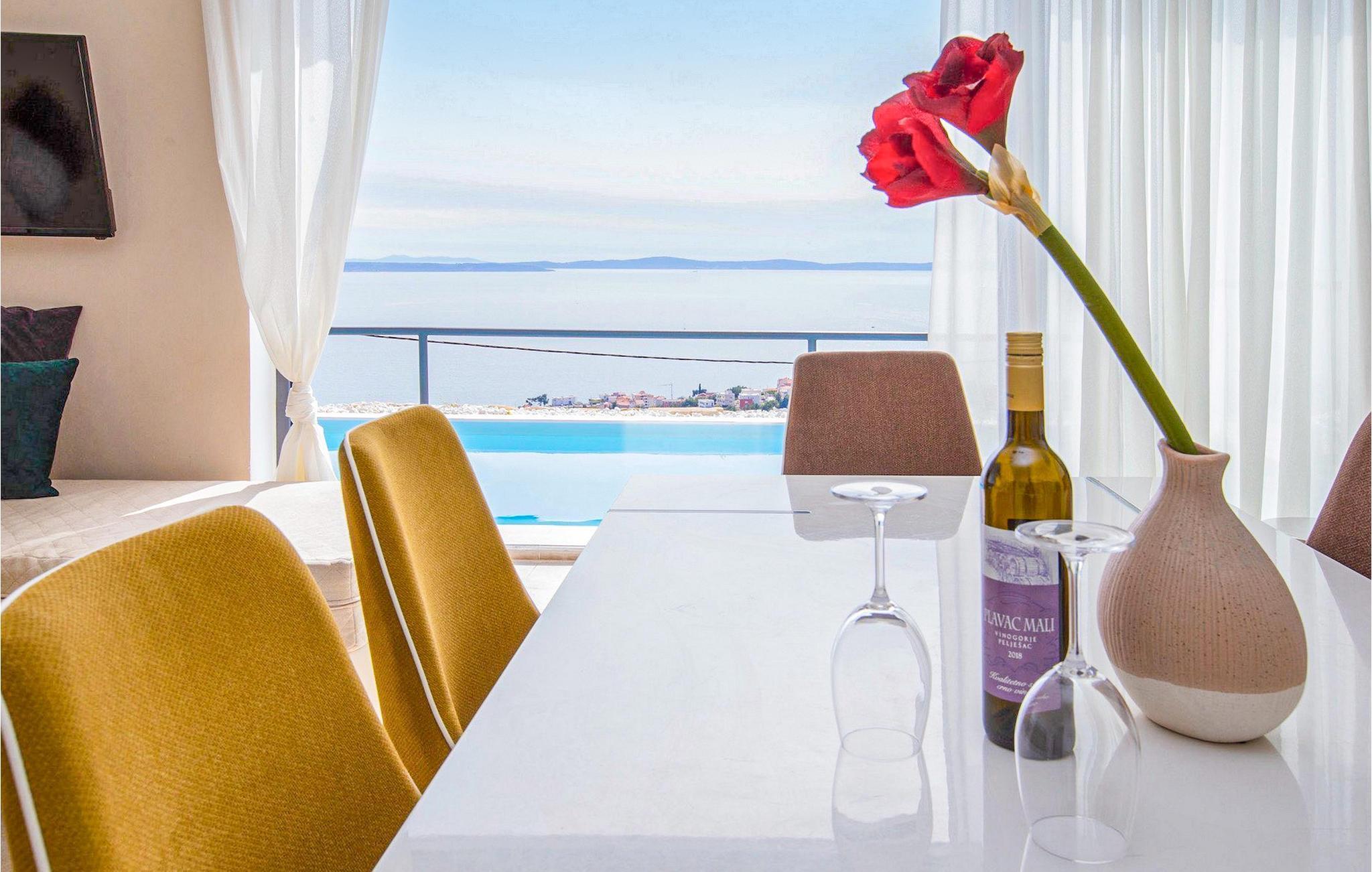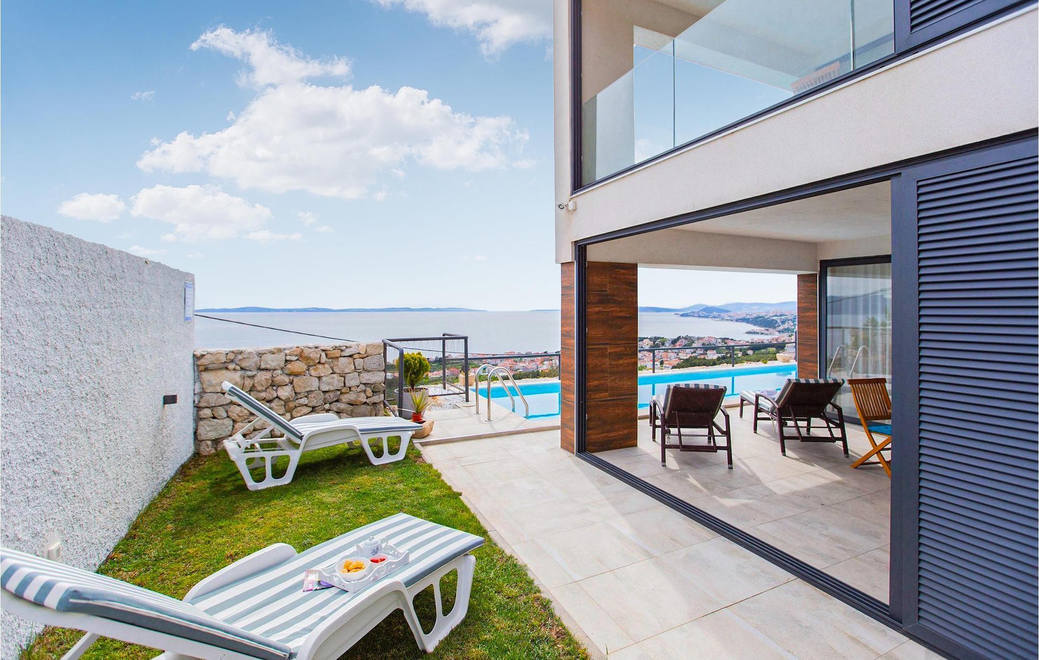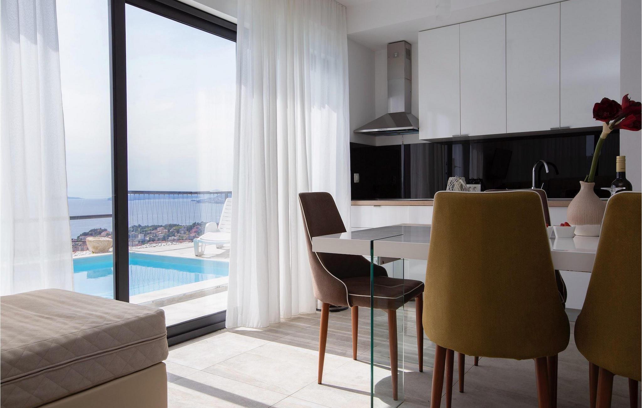 Die Villa Royal 2 Podstrana befindet sich in Podstrana, nur eine kurze Fahrt von der Stadt Split entfernt. Die Villa verfügt über insgesamt 4 Schlafzimmer und kann bis zu 6+2 Personen beherbergen. Das Interieur zeichnet sich durch klare Linien und modernes Design aus. Die Villa ist in 2 Etagen und zwei Wohnungen aufgeteilt. Das offene Erdgeschoss besteht aus einer modernen und gut ausgestatteten Küche, Essbereich und Wohnzimmer mit herrlichem Meerblick. Zwei Schlafzimmer mit en-suite Badezimmern befinden sich ebenfalls im Erdgeschoss. Das zweite Apartment befindet sich im ersten Stock, wo sich zwei weitere Schlafzimmer mit Doppelbett und en-suite Badezimmer, eine Küche und ein Wohnzimmer mit direktem Zugang zur großen Terrasse befinden. Die Terrasse im ersten Stock bietet Ihnen einen zusätzlichen privaten Platz, um den Panoramablick zu genießen. Vor der Villa befindet sich ein privater Pool, in dem Sie sich entspannen können, während Sie Ihr Lieblingsbuch lesen oder die Sonne aufsaugen. Diese einzigartige Villa ist perfekt für Familien und Gruppen und bietet seinen Gästen einen wirklich unvergesslichen Urlaub.Die Villa Royal 2 Podstrana liegt an einem Hang und bietet einen wunderschönen Blick auf die Adria, die Inseln und die Küstenstadt Podstrana. Alle notwendigen Annehmlichkeiten wie Geschäfte, Restaurants und Cafés sind nur einen kurzen Spaziergang von der Villa entfernt. Verbringen Sie Ihren Urlaub an schönen Kieselstränden, ideal für Familien mit Kindern. Die Villa befindet sich in Mitteldalmatien und ist somit ein idealer Ausgangspunkt für viele Tagesausflüge. Besuchen Sie die Stadt Split und ihren Diokletianspalast mit seinen vielen engen Gassen und Top-Restaurants. Versäumen Sie es nicht, die Inseln Brac, Solta und Hvar zu besuchen, oder vielleicht sogar die Insel Vis, die ganz anders ist als andere Inseln in der Adria. Entspannen Sie sich in der wunderschönen Natur, in zahlreichen Nationalparks und Naturreservaten. Für alle Adrenalin-Liebhaber, besuchen Sie den Fluss Cetina, wo Sie Rafting und Zipline genießen können, oder fahren Sie zum Berg Biokovo und machen Sie einen Spaziergang auf dem Skywalk.