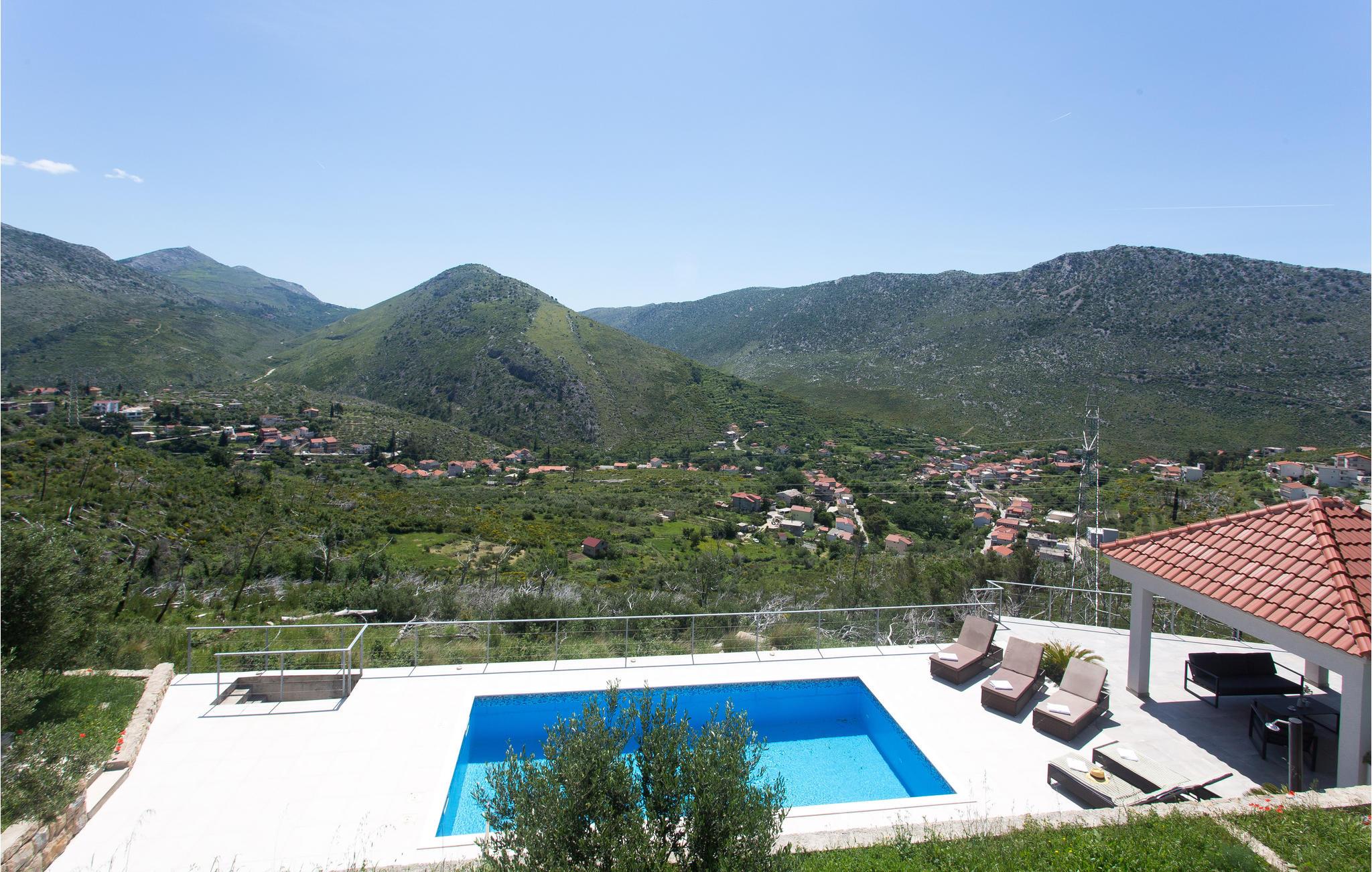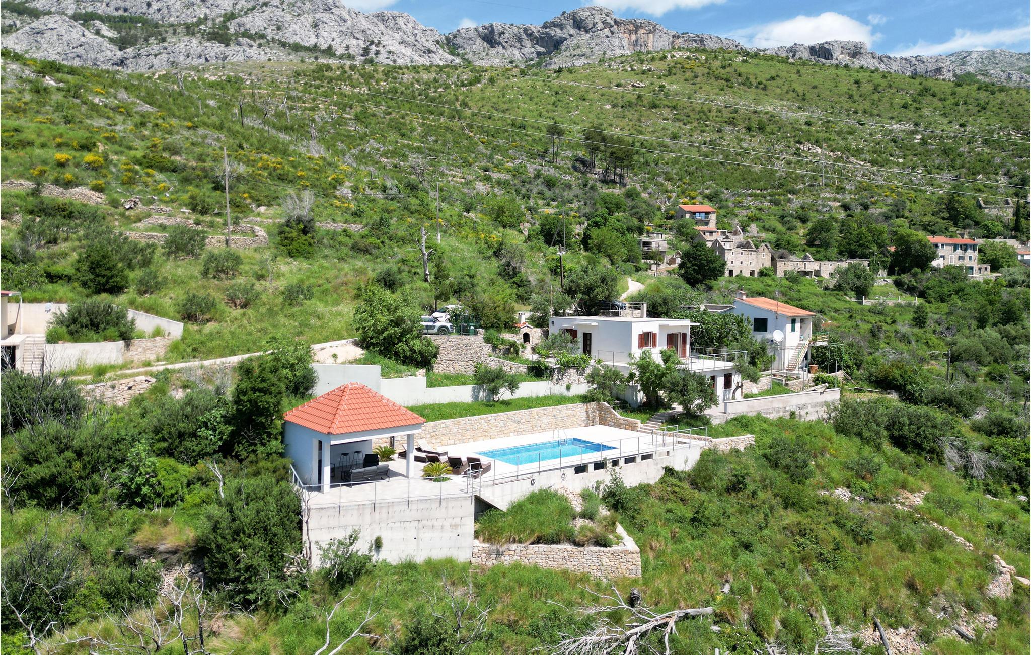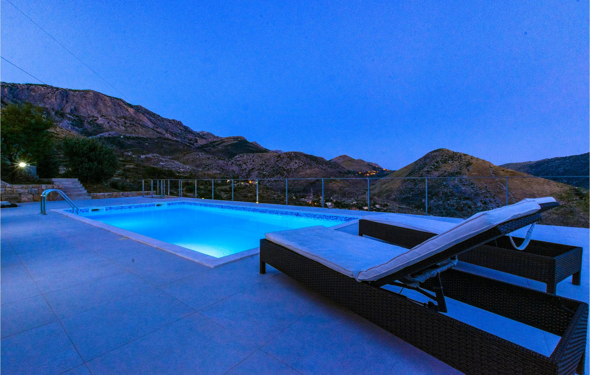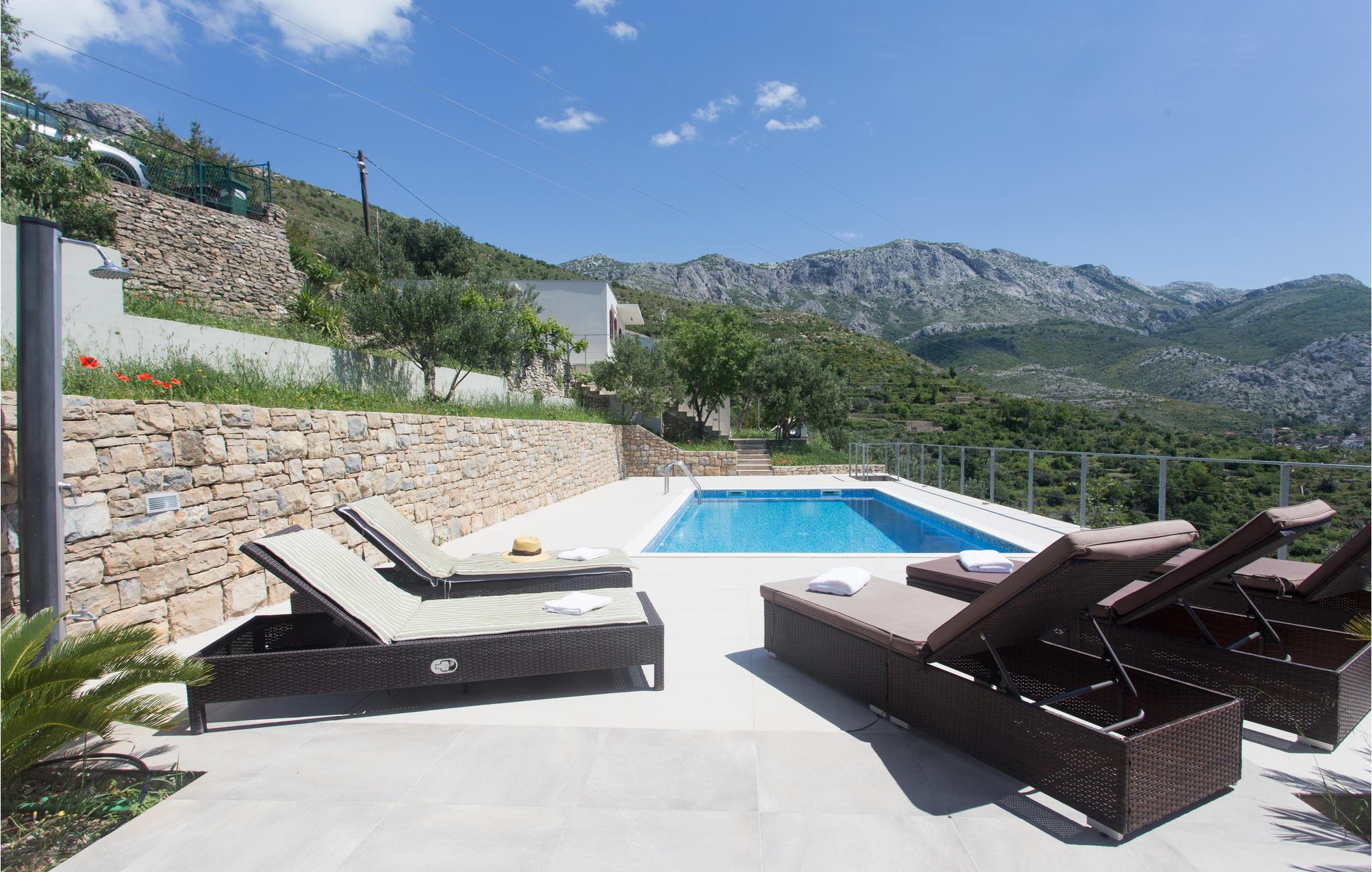 Das Grundstück ist terrassenförmig angelegt und bietet einen herrlichen Ausblick auf das Bergmassiv Mosor. Die nächste Einkaufsmöglichkeit haben Sie in der Ortschaft Žrnovica, etwa 5 Fahrminuten mit dem Auto entfernt. Diese angenehme Ferienunterkunft bietet Ihnen Erholung in natürlichem Umfeld, weit weg vom Alltag. Die große Terrasse am Pool ist sichtgeschützt.