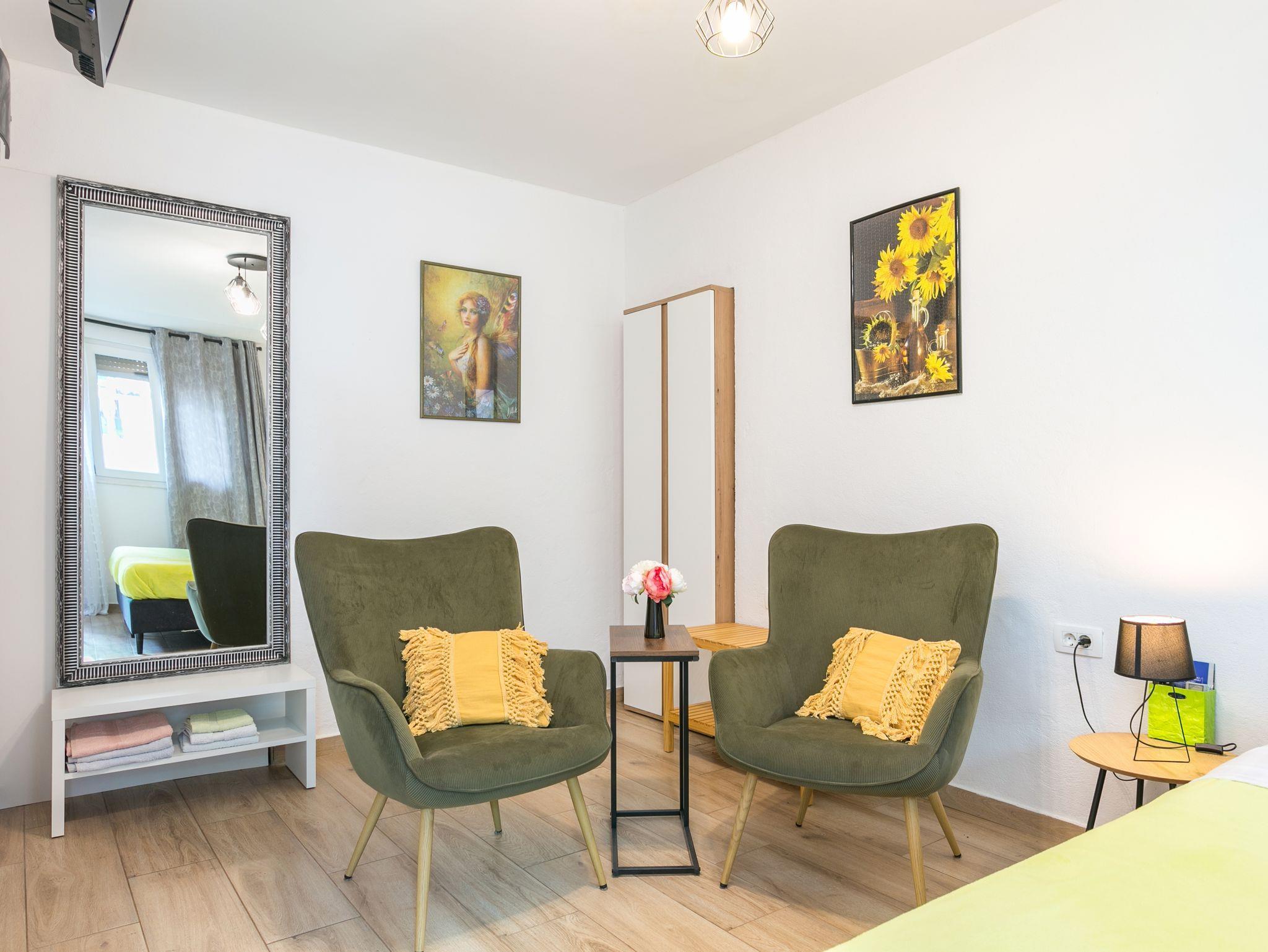Studio bietet Platz für 2 Gäste. Die Betten sind in Schlafzimmern, die es 1 gibt, innerhalb einer Gesamtfläche von 23m2, angeordnet. Die Gäste haben eine eigene Terrasse zur Verfügung, auf der sie in warmen Sommernächten genießen können. Es ist erlaubt, Speisen auf dem Gemeinschafts-Grill vorzubereiten. IM PREIS INBEGRIFFEN: Kurtaxe, Endreinigung, Klimatisierung, Parkplatz, Internet. VERBINDLICHE ZUSÄTZLICHE KOSTEN: Aufzahlung für Kurzaufenthalte (prozentualer Zuschlag pro Nächtigungsanzahl: 30% - 1, 20% - 2, 10% - 3). Die Verfügbarkeit zusätzlicher Dienstleistungen in Ihrem reservierten Termin und die Preise derselben (falls nicht aufgeführt) müssen im Voraus überprüft werden. Zusätzliche Dienstleistungen die in der Zahlungsaufforderung nicht aufgeführt sind werden direkt beim Vermieter bezahlt, angenommen der Gast nutzt auch diese. Ermäßigung auf den Grundpreis: Gratistag 14=13 (bei einem Aufenthalt von 14 Tagen oder mehr erhalten Sie einen Gratistag für den Aufenthalt bis 31.12.26).