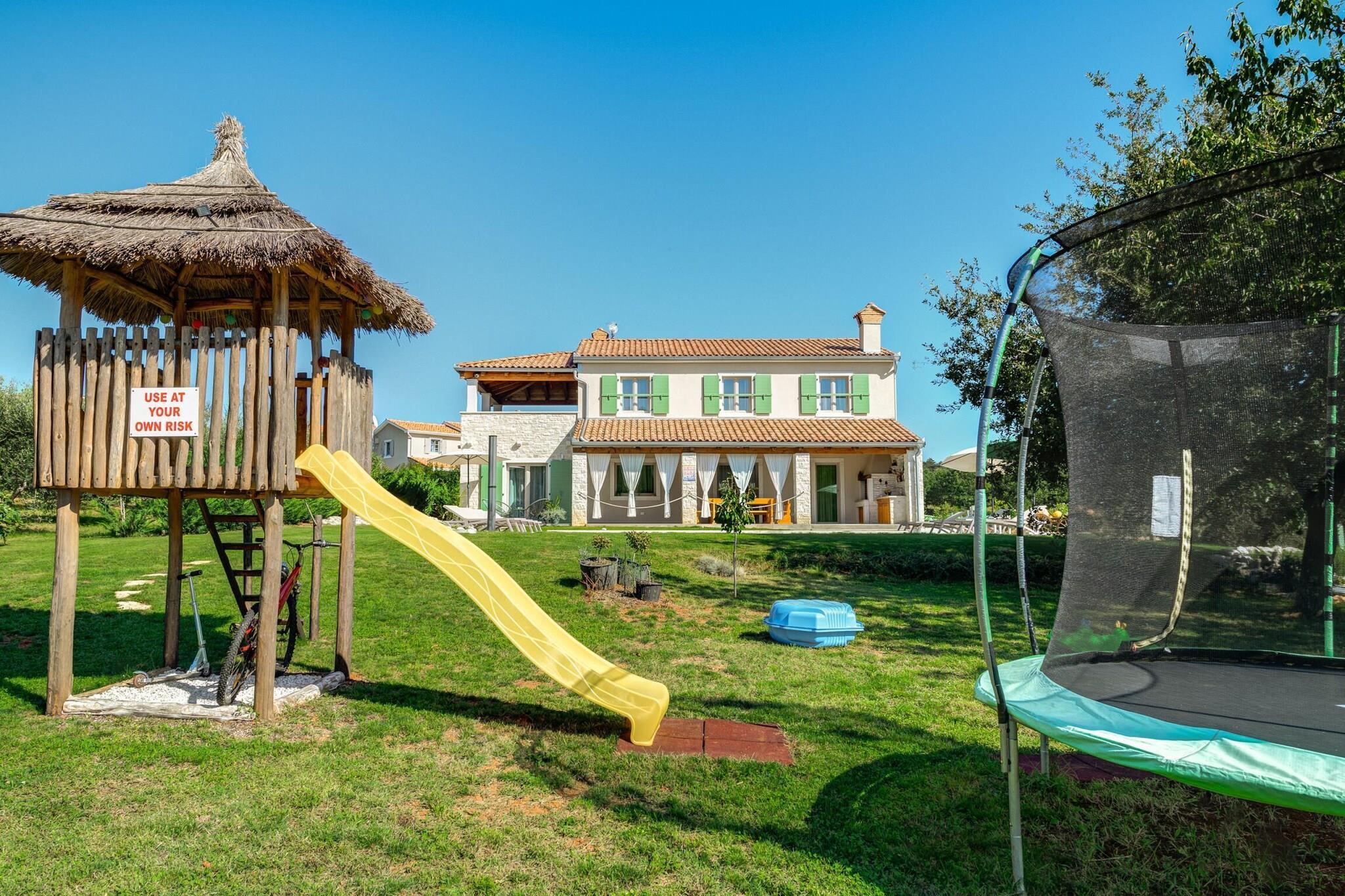 Die Villa in Srebrnici hat 4 Schlafzimmer und bietet Platz für 8 Personen. Die Unterkunft von 234 m² ist schön und voll ausgestattet. Sie verfügt über einen Garten und einen Swimmingpool. Das Anwesen befindet sich 15 m vom Sandstrand „Marea Beach Spadici“, 15 m vom Busbahnhof „Bus Station Visnjan“, 2 km vom Restaurant „Višnjan“, 2 km von der Stadt „Višnjan“, 2 km vom Supermarkt „Višnjan“, 15 km vom Felsstrand „Porec“, 15 km vom Wasserpark „Aquacolors Porec“, 18 km vom Vergnügungspark/Themenpark „Dino Park Funtana“, 25 km von den Thermalquellen „Istarske Toplice“, 45 km vom Naturschutzgebiet „Brijuni“, 58 km vom Flughafen „Pula“, 58 km vom Bahnhof „Pula“ und befindet sich in einer familienfreundlichen Zone und in einer wunderschönen ländlichen Gegend. Die Unterkunft verfügt über folgende Ausstattung: Garten, Gartenmöbel, 20 m² große Terrasse, Waschmaschine, Grill, Bügeleisen, Internetanschluss (WLAN), Föhn, Balkon, Kinderbereich, Wärmepumpe, Klimaanlage, privater Pool, Parkplatz im Freien im selben Gebäude, 1 Fernseher, Satellitenfernsehen (Sprachen: Englisch, Deutsch). Die offene Küche mit Induktionsherd ist mit Kühlschrank, Mikrowelle, Backofen, Gefrierschrank, Spülmaschine, Geschirr/Besteck, Küchenutensilien, Kaffeemaschine, Toaster und Wasserkocher ausgestattet.