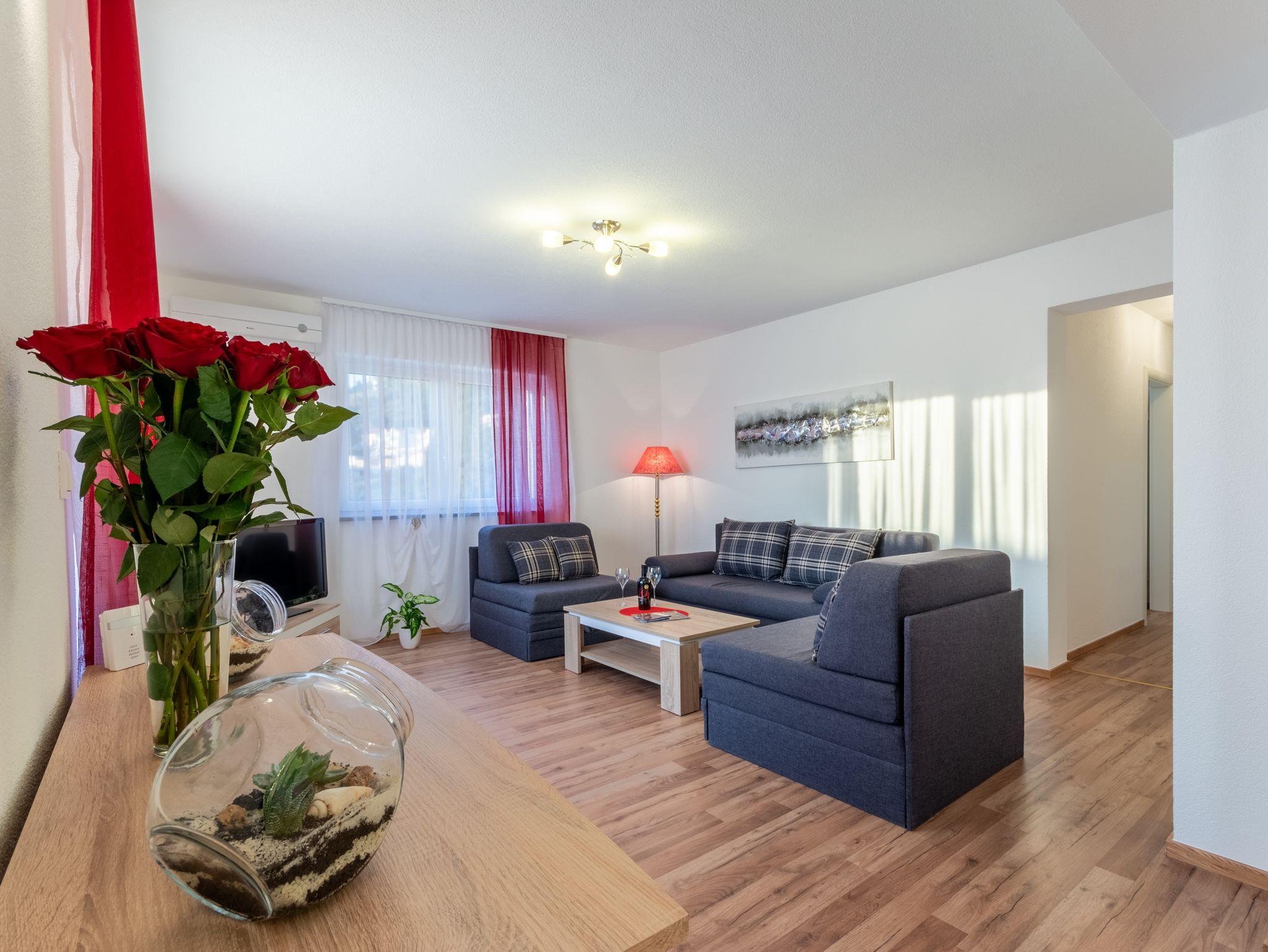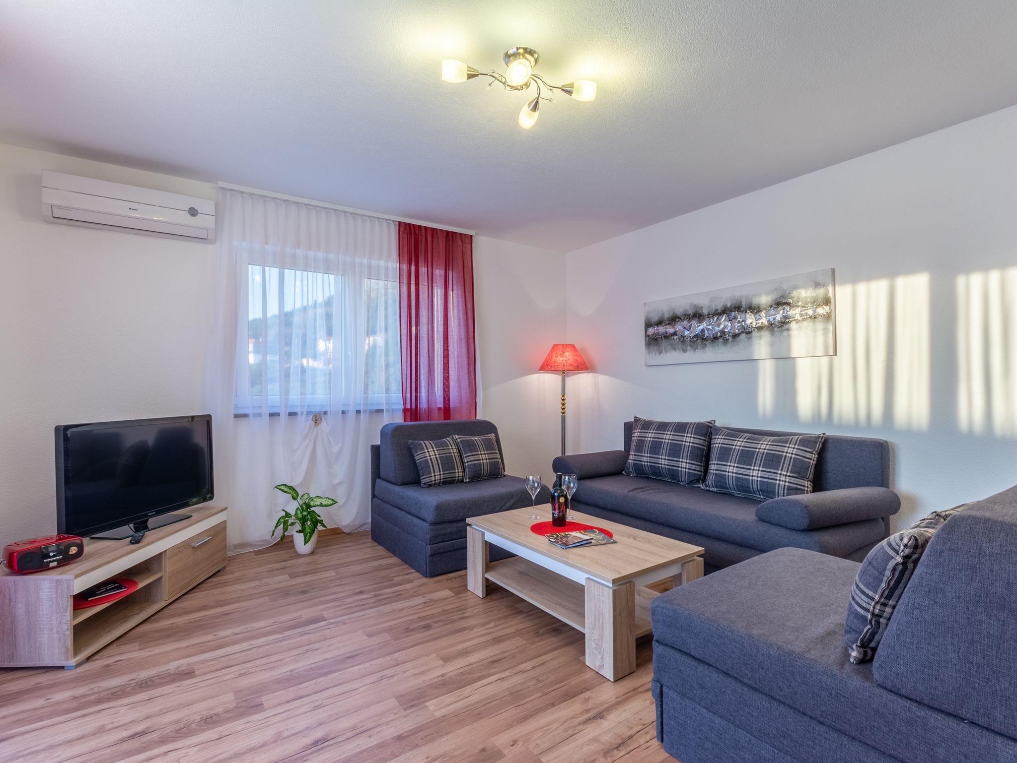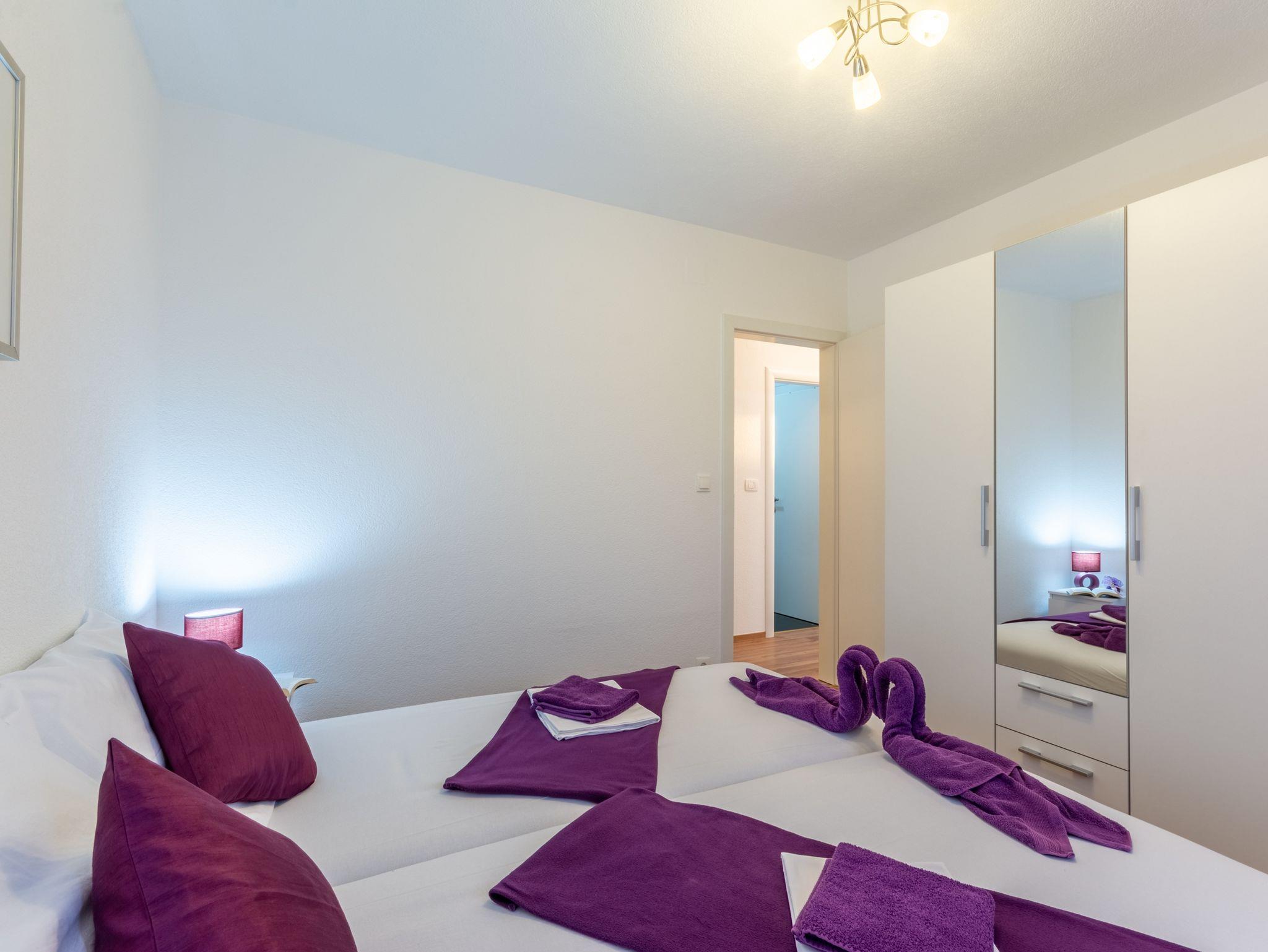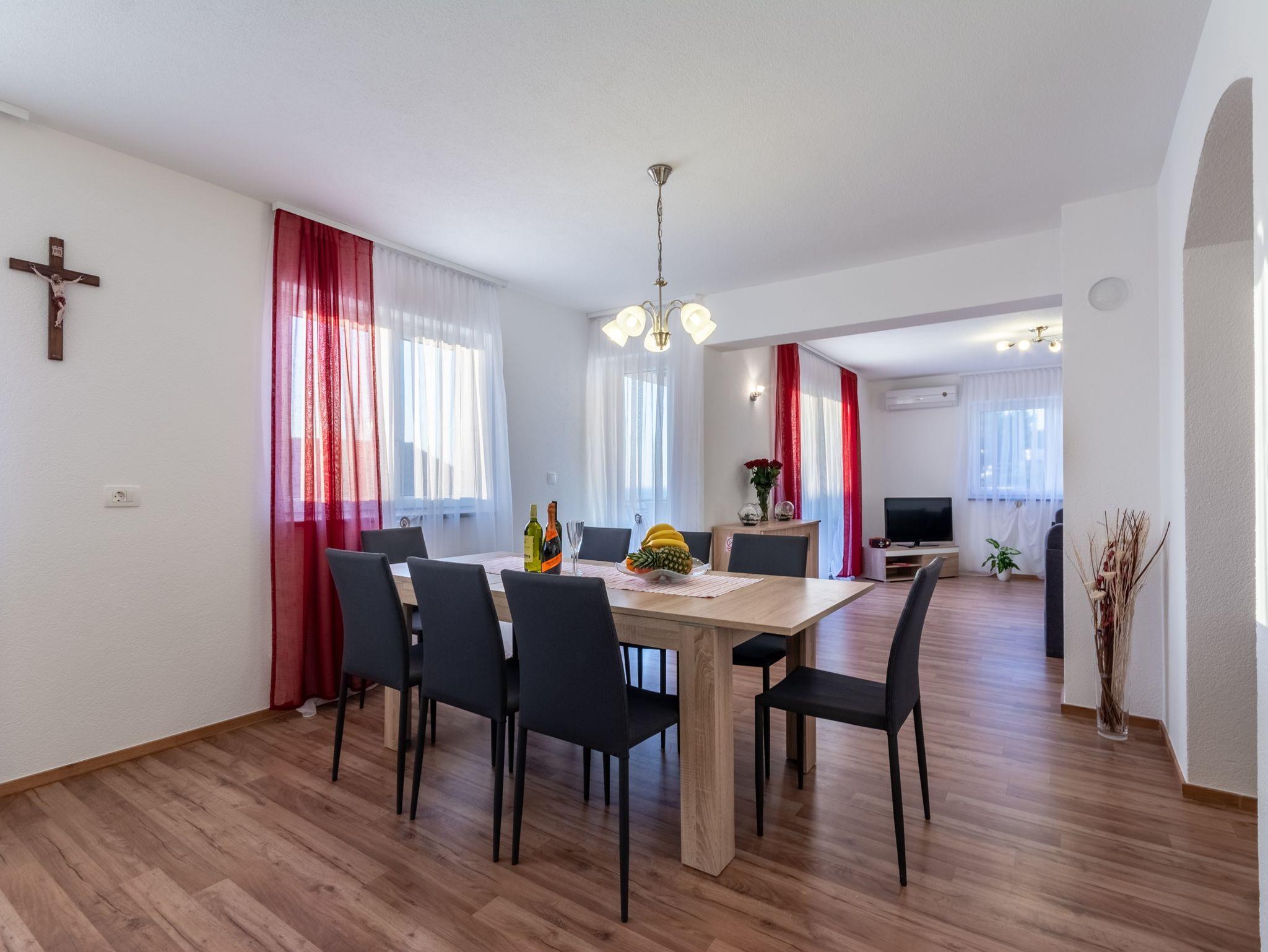 Ferienwohnung bietet Platz für 6 Gäste. Die Betten sind in Schlafzimmern, die es 2 gibt, und in Wohnzimmer, innerhalb einer Gesamtfläche von 75m2, angeordnet. Die Gäste haben eine eigene Terrasse zur Verfügung, auf der sie in warmen Sommernächten genießen können. Das Apartment bietet Meerblick. Es ist erlaubt, Speisen auf dem Gemeinschafts-Grill vorzubereiten. Während ihres Aufenthalts können Gäste das gemeinsam zur Nutzung stehende Schwimmbad benutzen. IM PREIS INBEGRIFFEN: Kurtaxe, Endreinigung, Klimatisierung, Pool, Parkplatz, Internet, Wäschewaschen, Kinderbett, Bügeleisen, Bügelbrett, Föhn, tragbarer Grill. VERBINDLICHE ZUSÄTZLICHE KOSTEN: Aufzahlung für Kurzaufenthalte (prozentualer Zuschlag pro Nächtigungsanzahl: 30% - 1, 20% - 2, 10% - 3). Die Verfügbarkeit zusätzlicher Dienstleistungen in Ihrem reservierten Termin und die Preise derselben (falls nicht aufgeführt) müssen im Voraus überprüft werden. Zusätzliche Dienstleistungen die in der Zahlungsaufforderung nicht aufgeführt sind werden direkt beim Vermieter bezahlt, angenommen der Gast nutzt auch diese. Ermäßigung auf den Grundpreis: Gratistag 14=13 (bei einem Aufenthalt von 14 Tagen oder mehr erhalten Sie einen Gratistag für den Aufenthalt bis 31.12.26).