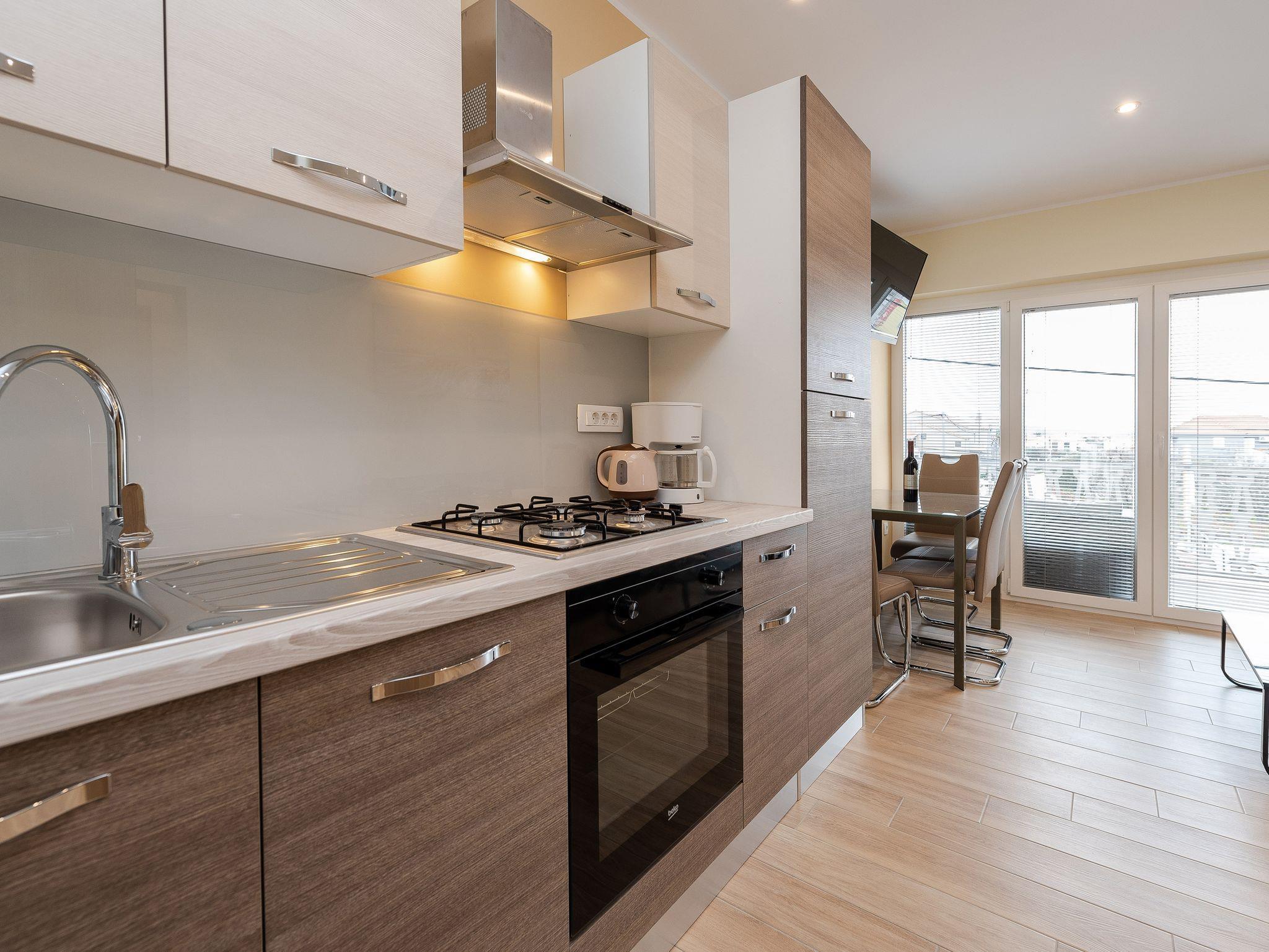 Ferienwohnung bietet Platz für 5 Gäste. Die Betten sind in Schlafzimmern, die es 1 gibt, und in Wohnzimmer, innerhalb einer Gesamtfläche von 46m2, angeordnet. Die Gäste haben eine eigene Terrasse zur Verfügung, auf der sie in warmen Sommernächten genießen können. Das Apartment bietet Meerblick. Es ist erlaubt, Speisen auf dem Gemeinschafts-Grill vorzubereiten. Während ihres Aufenthalts können Gäste das gemeinsam zur Nutzung stehende Schwimmbad benutzen. IM PREIS INBEGRIFFEN: Kurtaxe, Endreinigung, Klimatisierung, Zentralheizung, Pool, Parkplatz, Internet, Kinderbett, Bügeleisen, Föhn. VERBINDLICHE ZUSÄTZLICHE KOSTEN: Aufzahlung für Kurzaufenthalte (prozentualer Zuschlag pro Nächtigungsanzahl: 30% - 1, 20% - 2, 10% - 3). UNVERBINDLICHE ZUSÄTZLICHE KOSTEN: Wäschewaschen (5,00 € Waschen). Die Verfügbarkeit zusätzlicher Dienstleistungen in Ihrem reservierten Termin und die Preise derselben (falls nicht aufgeführt) müssen im Voraus überprüft werden. Zusätzliche Dienstleistungen die in der Zahlungsaufforderung nicht aufgeführt sind werden direkt beim Vermieter bezahlt, angenommen der Gast nutzt auch diese.