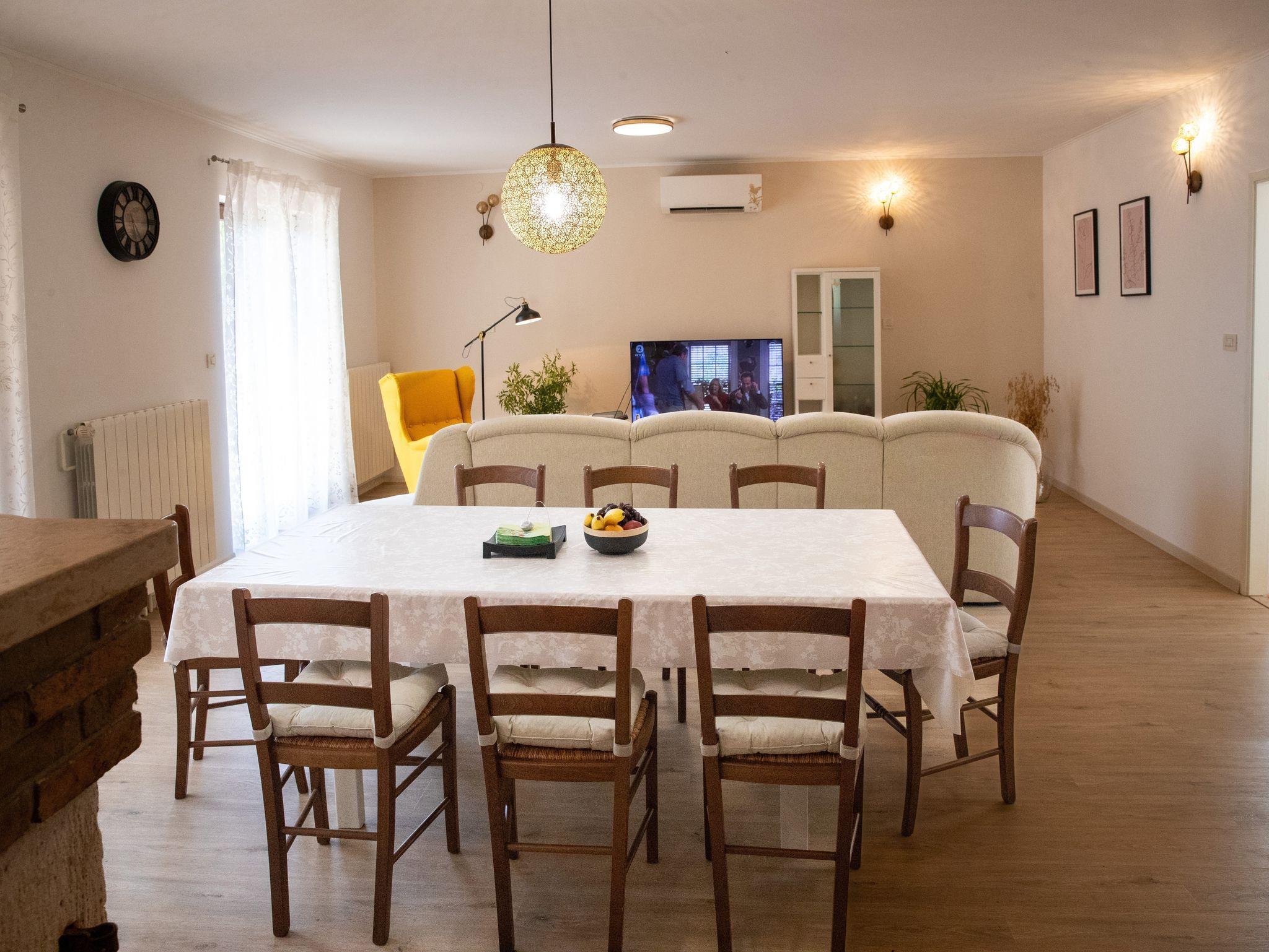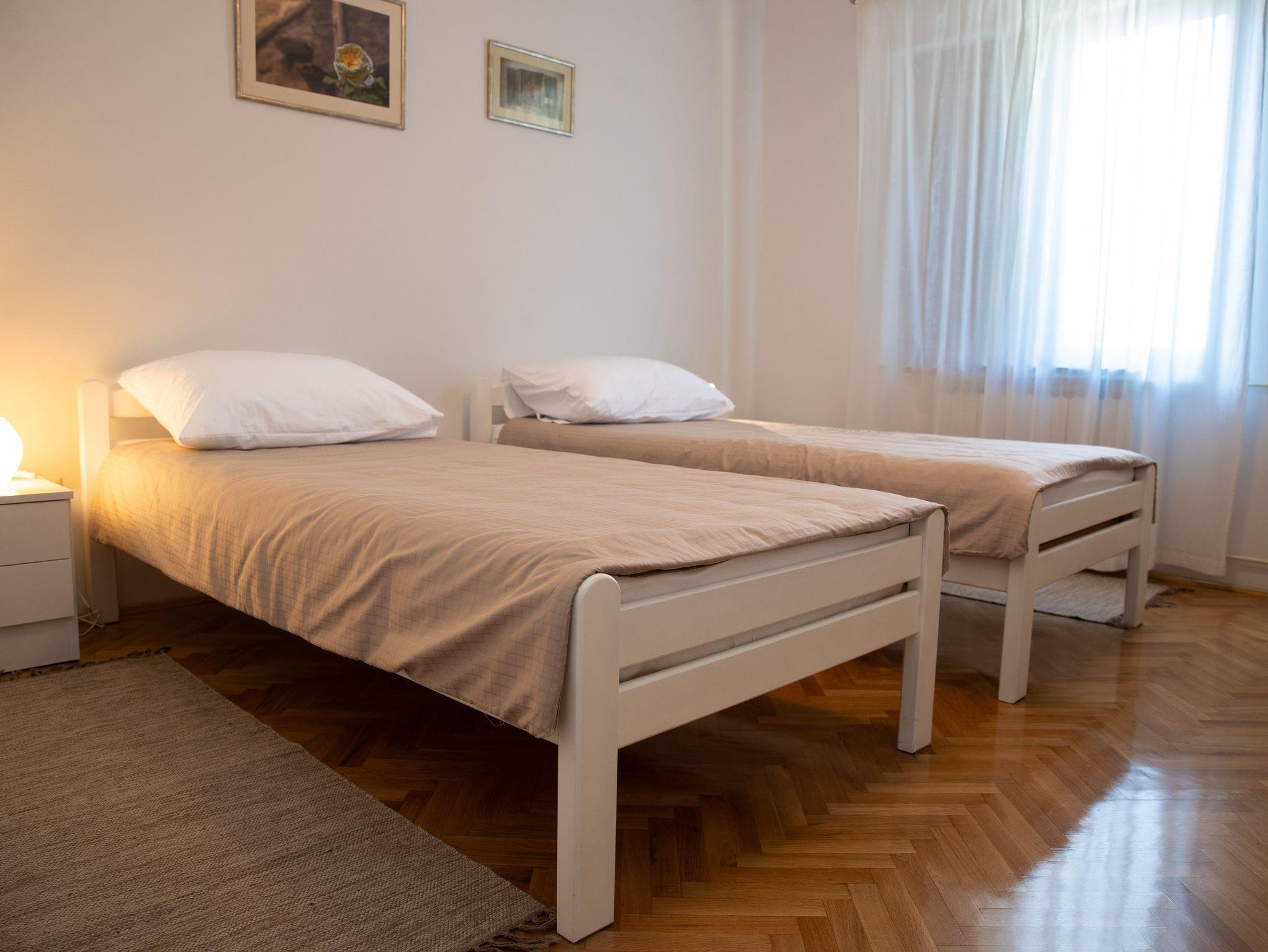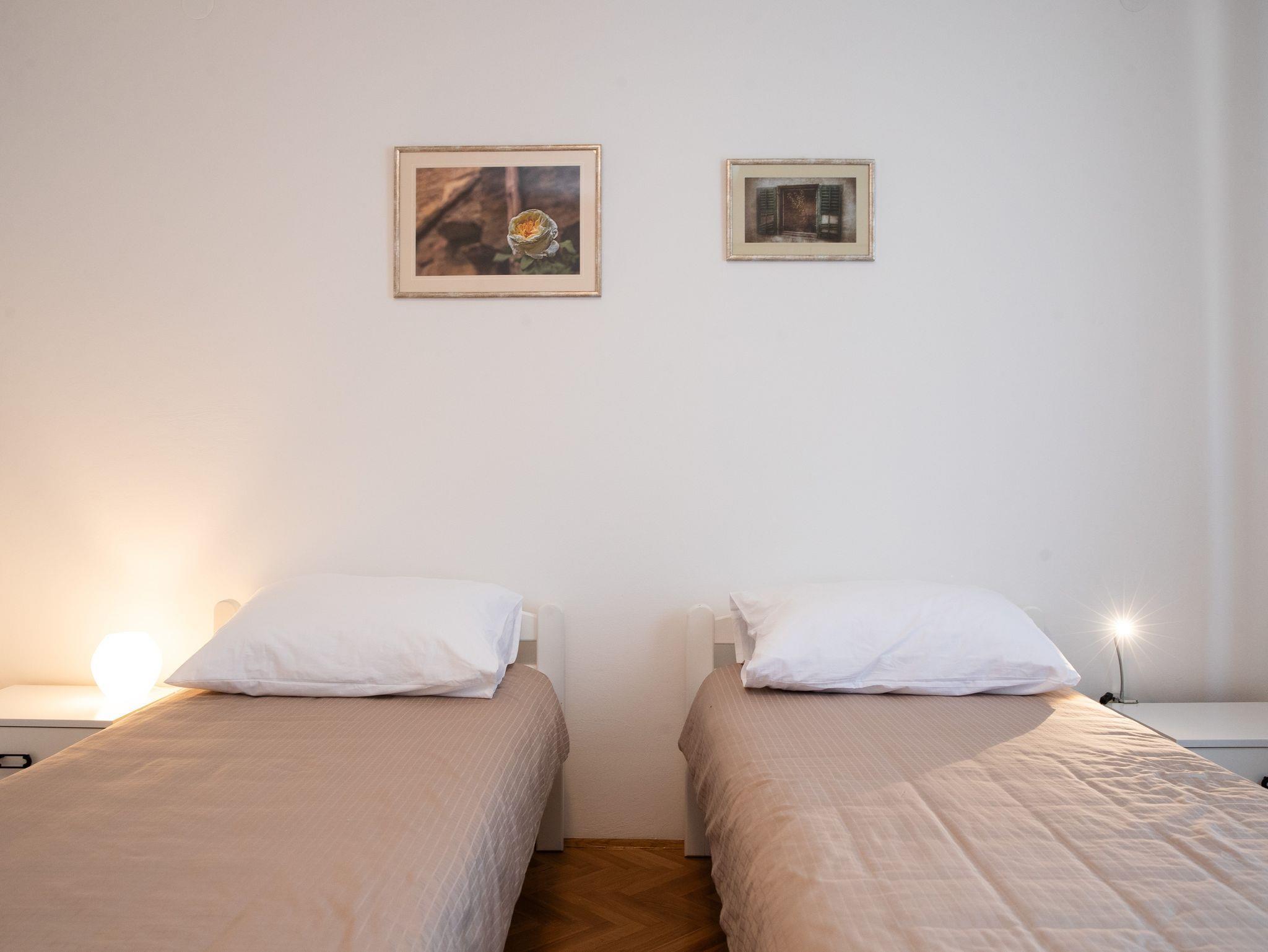 Ferienwohnung bietet Platz für 6 Gäste. Die Betten sind in Schlafzimmern, die es 3 gibt, innerhalb einer Gesamtfläche von 109m2, angeordnet. Die Gäste haben eine eigene Terrasse zur Verfügung, auf der sie in warmen Sommernächten genießen können. Es ist erlaubt, Speisen auf dem Gemeinschafts-Grill vorzubereiten. In der Unterkunftseinheit besteht die Möglichkeit des Mitbringens von Haustieren gegen Aufpreis. IM PREIS INBEGRIFFEN: Kurtaxe, Endreinigung, Klimatisierung, Parkplatz, Internet, Bügeleisen, Bügelbrett, Föhn, tragbarer Grill. VERBINDLICHE ZUSÄTZLICHE KOSTEN: Aufzahlung für Kurzaufenthalte (prozentualer Zuschlag pro Nächtigungsanzahl: 30% - 1, 20% - 2, 10% - 3). UNVERBINDLICHE ZUSÄTZLICHE KOSTEN: Zentralheizung (20,00 € pro Nacht), Haustiere (10,00 € pro Nacht). Die Verfügbarkeit zusätzlicher Dienstleistungen in Ihrem reservierten Termin und die Preise derselben (falls nicht aufgeführt) müssen im Voraus überprüft werden. Zusätzliche Dienstleistungen die in der Zahlungsaufforderung nicht aufgeführt sind werden direkt beim Vermieter bezahlt, angenommen der Gast nutzt auch diese. Ermäßigung auf den Grundpreis: Gratistag 14=13 (bei einem Aufenthalt von 14 Tagen oder mehr erhalten Sie einen Gratistag für den Aufenthalt bis 31.12.26).