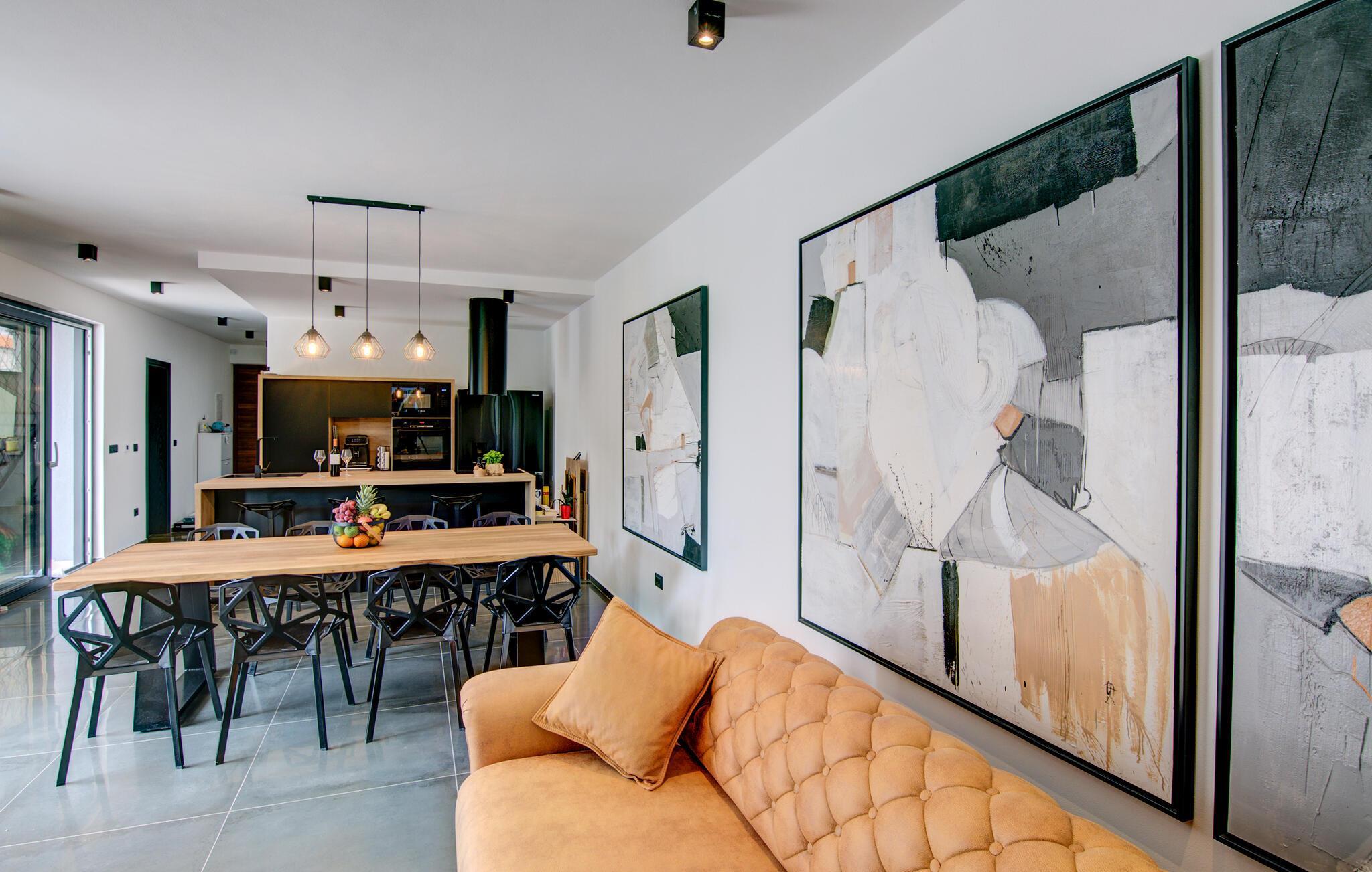 Dieses exklusive Ferienhaus lockt mit einem großzügigen, eleganten Innenbereich und zahlreichen modernen Annehmlichkeiten. Zaubern Sie kulinarische Highlights in der offenen Küche und nehmen Sie am stilvollen Esstisch Platz. Entspannen Sie abends bei einem guten Film auf dem Sofa oder genießen Sie anregende Gespräche bei einem Glas Wein.