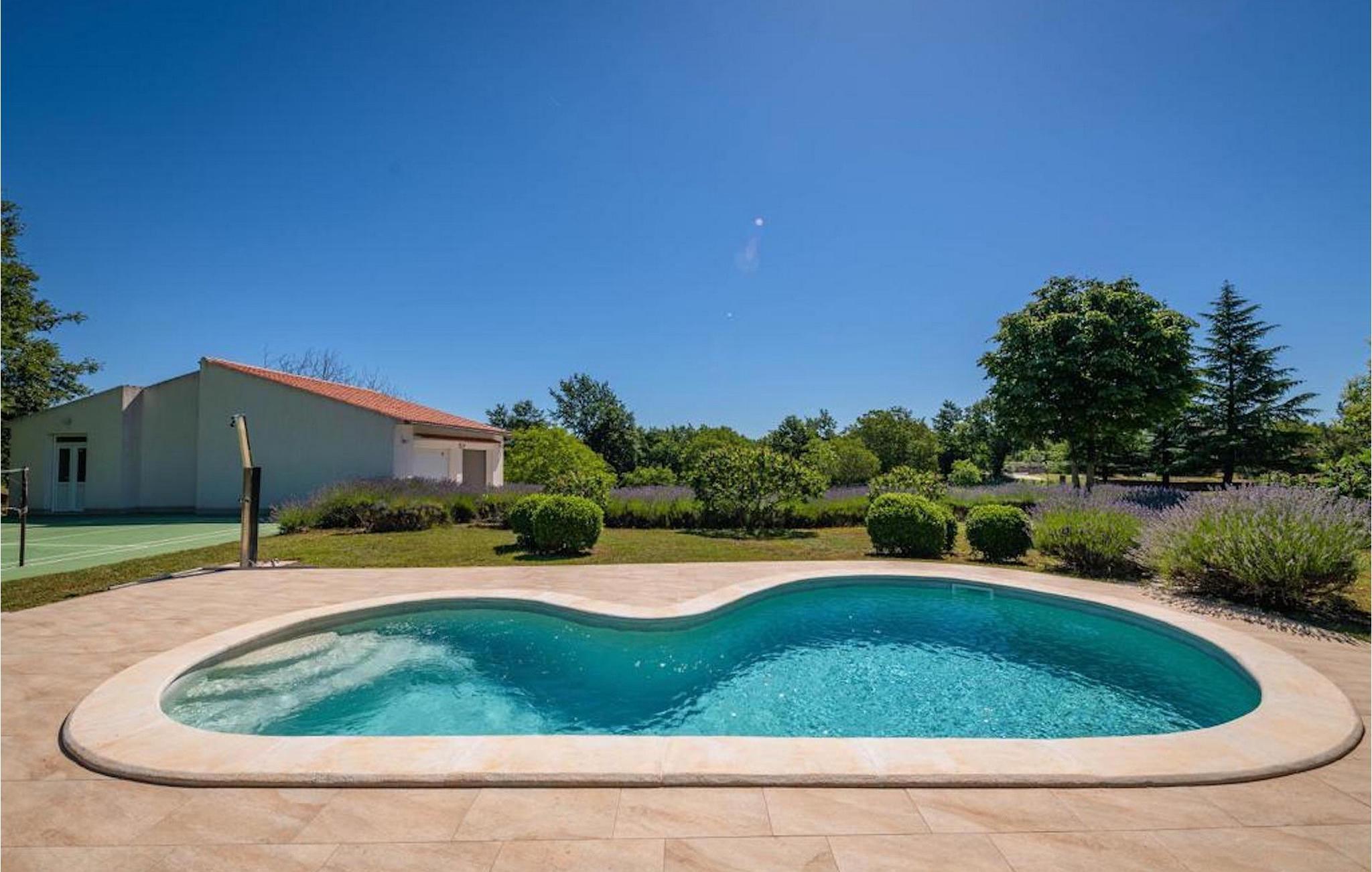 In einem geräumigen, eingezäunten Garten von 7000 m2 befindet sich ein privater Pool, umgeben von Lavendel, der der perfekte Ort zum Entspannen ist. Es gibt Sonnenliegen und eine Außendusche am Pool. Der Garten bietet auch einen Badmintonplatz, Tischtennis, Fußballtore und einen Kinderspielplatz. Es gibt auch eine geräumige überdachte Terrasse mit Esstisch und Grill für die Zubereitung köstlicher Mahlzeiten.