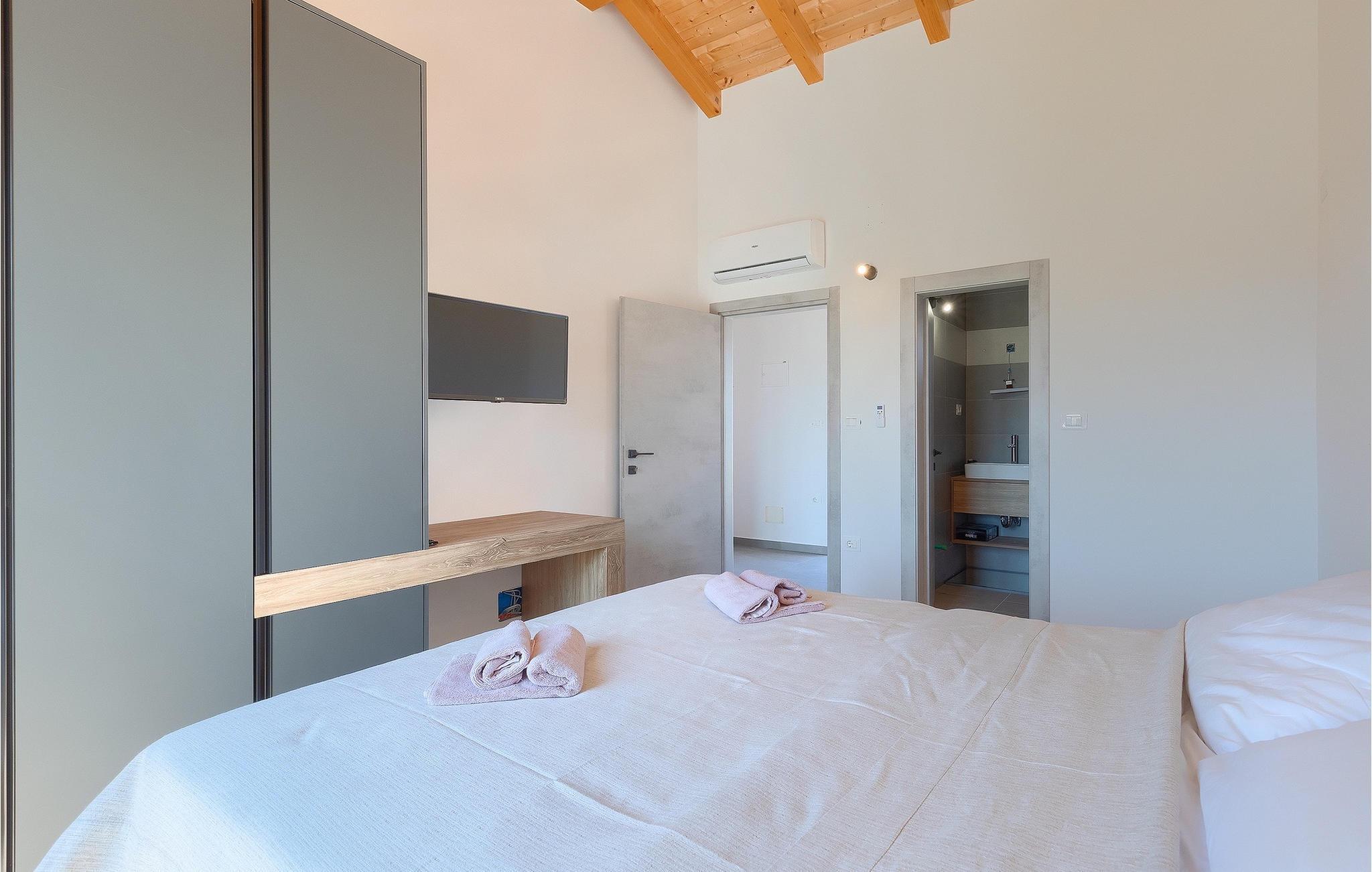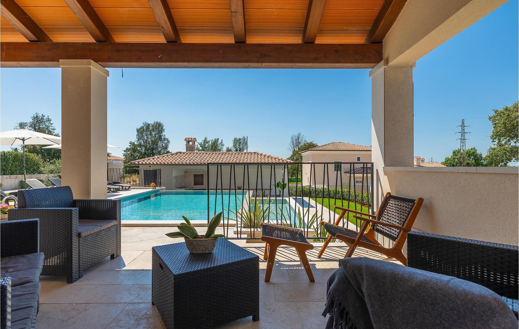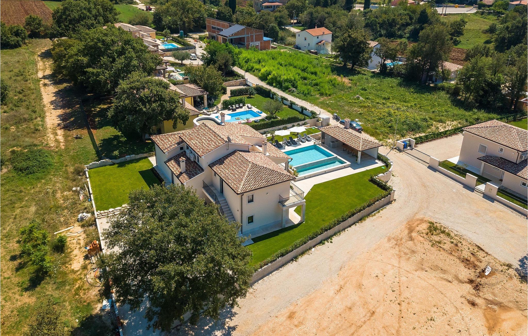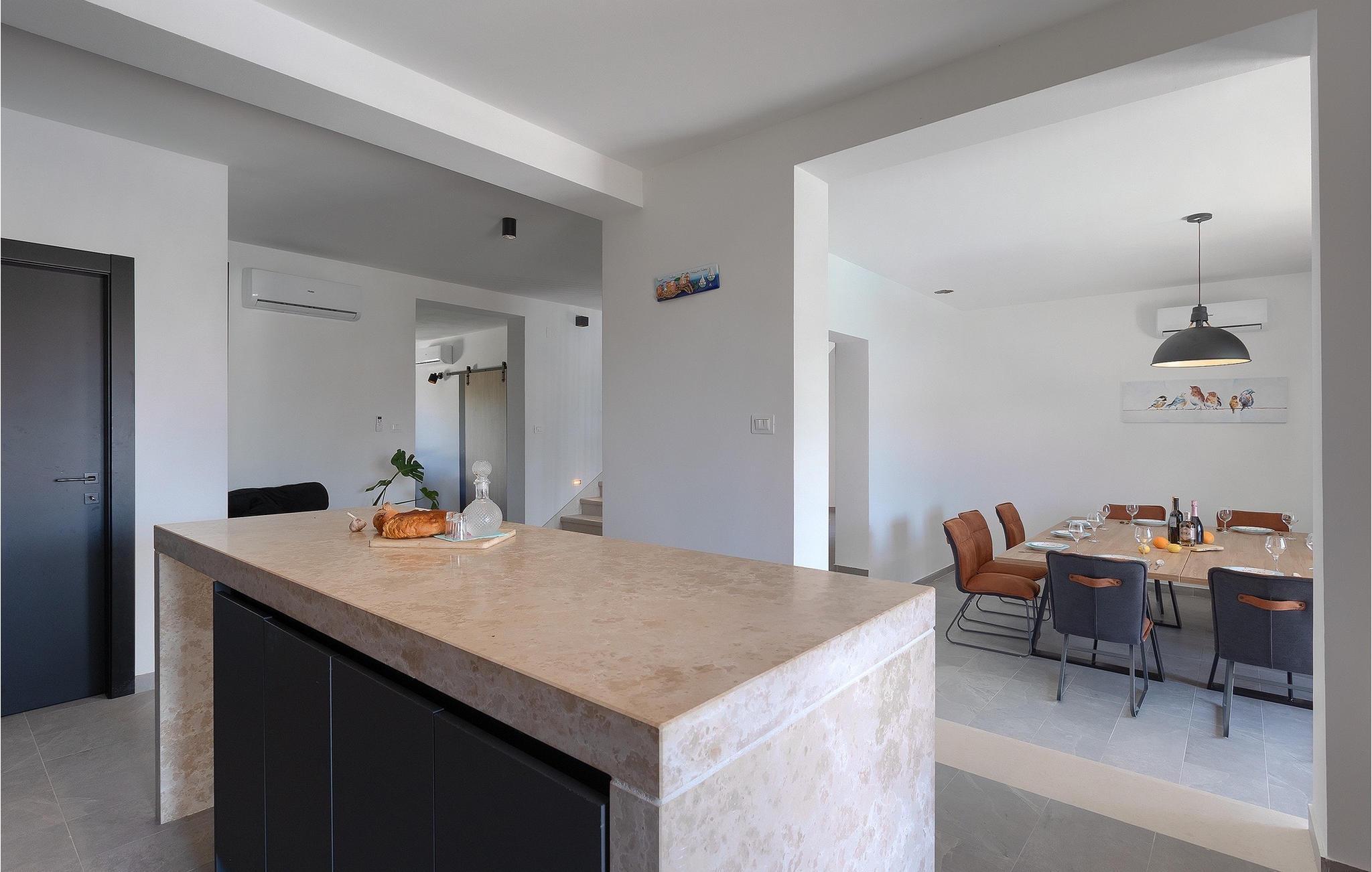 Die wunderschöne Familienvilla La Fierra mit einer Kapazität für 14 Personen in Zentralistrien ist die perfekte Wahl für einen Traumurlaub mit Familie und Freunden. Im Garten der Villa erwartet Sie ein Swimmingpool mit Liegestühlen, ideal zum Entspannen und Erfrischen für die ganze Familie während der Sommerhitze. An heißen Sommertagen können Sie sich auf die überdachte Terrasse flüchten und ein erfrischendes Getränk genießen. Das Anwesen bietet Ihnen einen Holzkohlegrill zum Zubereiten regionaler Köstlichkeiten und eine Außenküche mit einem Esstisch für 14 Personen, perfekt für die schöne Zeit mit der Familie. Die Villa ist ein Split-Level-Haus, das heißt, jede Etage verfügt über eine obere und eine untere Ebene, wodurch ein dynamischerer Wohnraum entsteht. Im Erdgeschoss der oberen Ebene befindet sich das erste Schlafzimmer mit eigenem Bad, dann auch ein Wohnzimmer, eine voll ausgestattete Küche und ein Esszimmer. Auf der unteren Ebene des Erdgeschosses befindet sich ein zweites Schlafzimmer mit eigenem Bad. Im ersten Stock der Villa befinden sich 5 Schlafzimmer mit eigenem Bad. Zwei Schlafzimmer, eines im Erdgeschoss und eines im ersten Stock, haben einen eigenen Eingang von außen. Alle Schlafzimmer sind mit Doppelbetten, Fernseher und Klimaanlage ausgestattet und sorgen für die nötige Ruhe. Lassen Sie sich einen Urlaub im Herzen Istriens in der Familienvilla La Fierra nicht entgehen. Svetvincenat ist eine Renaissancestadt mit einem reichen gastronomischen und touristischen Angebot und zahlreichen lokalen Veranstaltungen, die in den historischen Sehenswürdigkeiten dieser Stadt stattfinden. Die bekanntesten Veranstaltungen sind die Käsefeste, das Mittelalterfest und das Tanzfest, bei denen Sie von der gastfreundlichen Bevölkerung verzaubert werden und die vielfältigen Traditionen dieser Region kennenlernen. Verpassen Sie nicht, die traditionelle istrische Küche in lokalen Restaurants zu probieren, die nur 50 m von der Villa entfernt sind. Svetvincenat wird Sie mit dem Renaissanceplatz Placa mit der Burg Morosini-Grimani, dem Wahrzeichen des Ortes, begeistern. Ein wichtiger Teil des kulturellen Erbes von Svetvincenat sind die erhaltenen Reste von Wandfresken in der Kirche St. Vinzenz in der Nähe des Stadtfriedhofs und in der Kirche St. Katharina. Entdecken Sie die natürliche Schönheit Zentralistriens auf zahlreichen Rad- und Wanderwegen. Der Brijuni-Nationalpark und der Naturpark Ucka sind unverzichtbare Ziele für Liebhaber natürlicher Schönheit. Die ideale Lage im Herzen Istriens lädt Sie zu Tagesausflügen in ganz Istrien ein. Besuchen Sie also die wichtigsten Touristenzentren Istriens: Rovinj, Porec, Labin, Pula.