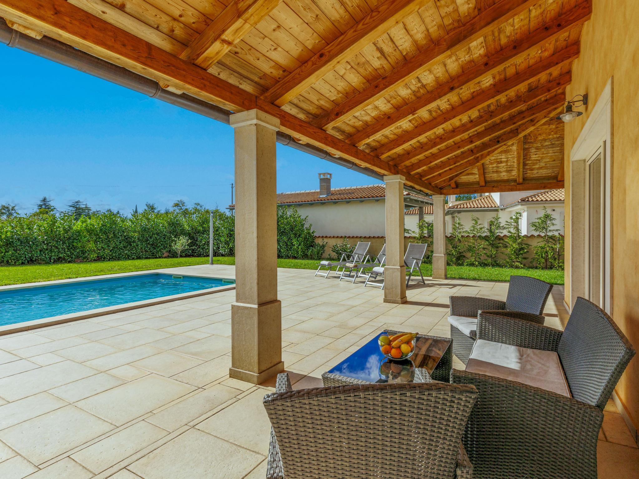Villa "Flori", auf 2 Stockwerken, Baujahr 2019. 300 m vom Zentrum von Svetvincenat, ruhige, sonnige Lage, 20 km vom Meer. Zur Alleinbenutzung: Grundstück 1'080 m2 (eingezäunt), Garten mit Rasen und Pflanzen, Schwimmbad eckig (8 x 4 m, 36 m2, 150 cm tief, saisonale Verfügbarkeit: 01.Mai. - 30.Sep.). WC im Poolbereich, Aussendusche, Terrasse (35 m2), Gartenmöbel, Grill. Im Hause: Internetzugang, Waschmaschine. Zufahrt bis zum Haus (100 m Naturweg). Parkplatz (für 4 Autos) beim Haus auf dem Grundstück. Einkaufsgeschäft, Supermarkt, Restaurant 300 m, Bushaltestelle 1.1 km, Kieselstrand 20 km. Reitstall 15 km, Wanderwege ab Haus 50 m, Radweg 100 m. Nahe gelegene Sehenswürdigkeiten: adventure park 13 km, amusement park 3.5 km. Von Gruppen junger Leute wird ein doppeltes Pfand verlangt bei der Ankunft.
