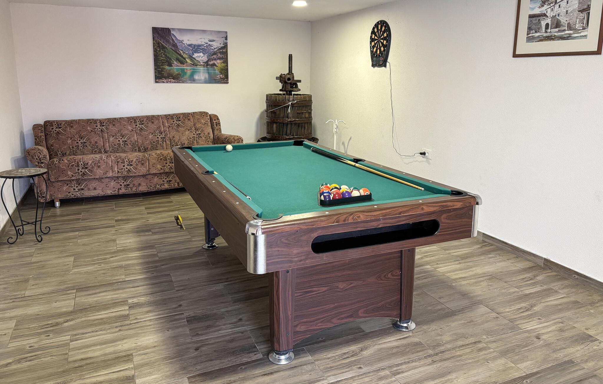 Dieses gepflegte Ferienhaus ist der ideale Ort für Familien, die sich einen erholsamen Urlaub unweit reizvoller Ausflugsziele wünschen. Zaubern Sie in geselliger Runde leckere Gerichte in der großzügigen Küche und planen Sie Ihre Unternehmungen bei fröhlichen Mahlzeiten am rustikalen Esstisch, an dem Sie abends harmonische Spieleabende mit Ihren Liebsten veranstalten können. Im angrenzenden Spielzimmer können Sie sich zudem am Billardtisch oder an der Dartscheibe vergnügen.
