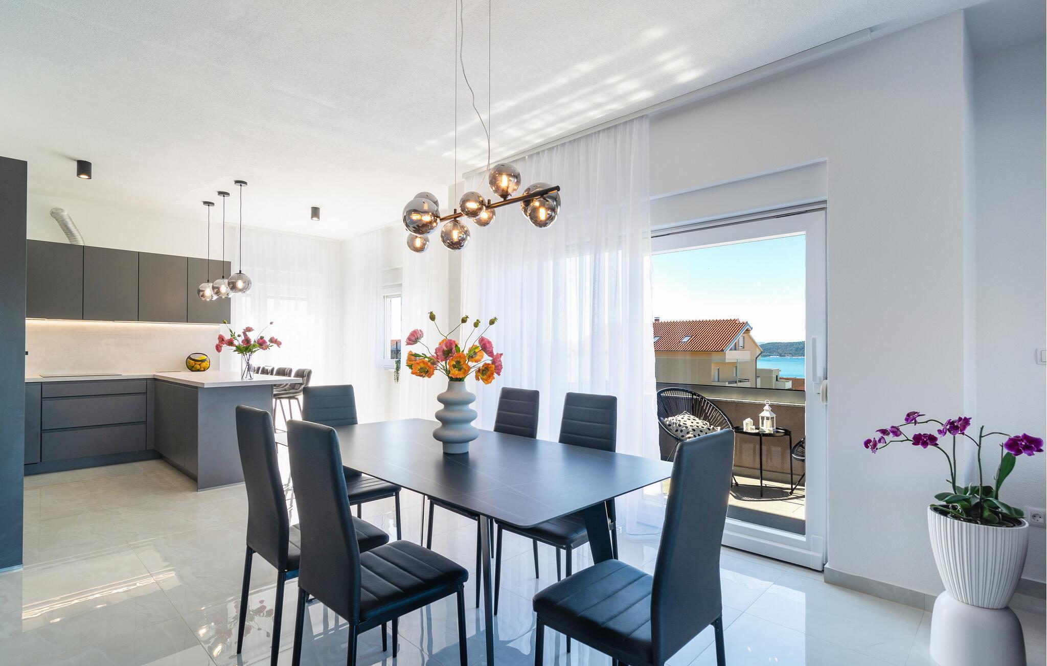 Entspannen Sie sich auf den Balkonen mit dem bezaubernden Sonnenuntergang und dem Blick auf den Tanz der Segelboote. Es bietet einen faszinierenden Panoramablick auf die Bucht von Kastelan, die Städte Split, Trogir und Solin, Inseln, Küsten und versteckte Buchten, die Ihren Aufenthalt überraschen und bereichern.