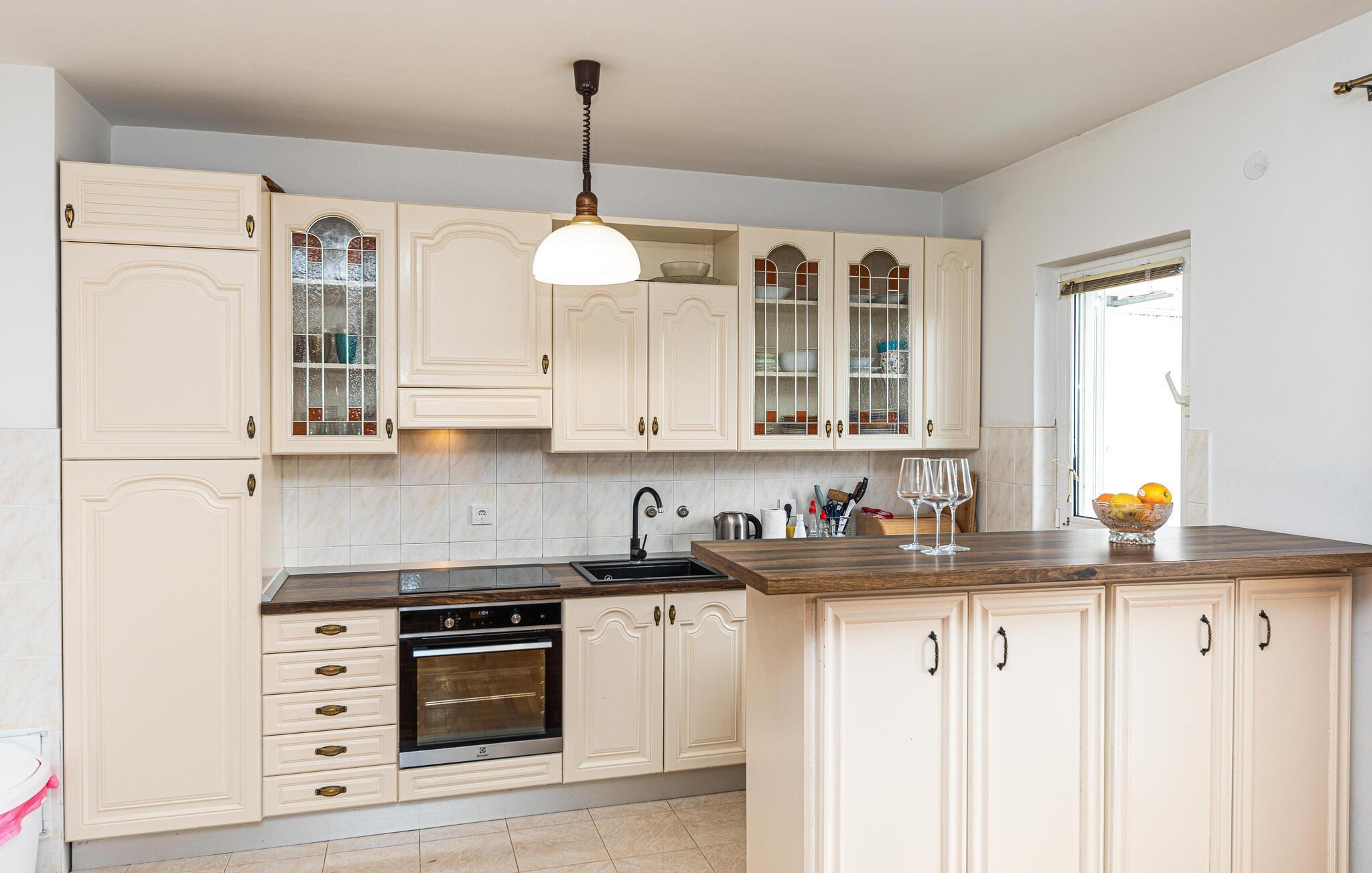 Entdecken Sie diese herrliche Ferienwohnung, die mit ihrem einladenden Ambiente und der liebevollen Einrichtung den perfekten Rahmen für einen entspannten Urlaub bietet. Hier fängt Ihr Urlaubsmorgen mit dem Zubereiten des gemeinsamen Frühstücks in der praktisch eingerichteten Küche und einer guten Tasse Kaffee oder Tee an. Der Ess- und Wohnbereich empfängt Sie mit klassischen Möbeln und einer harmonischen Stimmung. Hier können Sie Ihre selbst zubereiteten kulinarischen Kreationen zu sich nehmen und gemütliche Familienabende bei Karten- oder Brettspielen verbringen. Sie können sich selbstverständlich auch auf die Terrasse vor dem Haus begeben. Erblicken Sie von hier aus das Meer am Horizont. Baden Sie im Pool und machen Sie es sich auf den Sonnenliegen bequem. Und toben Sie mit Ihren Kindern im angrenzenden Garten oder schauen Sie ihnen beim Hüpfen auf dem Trampolin zu.