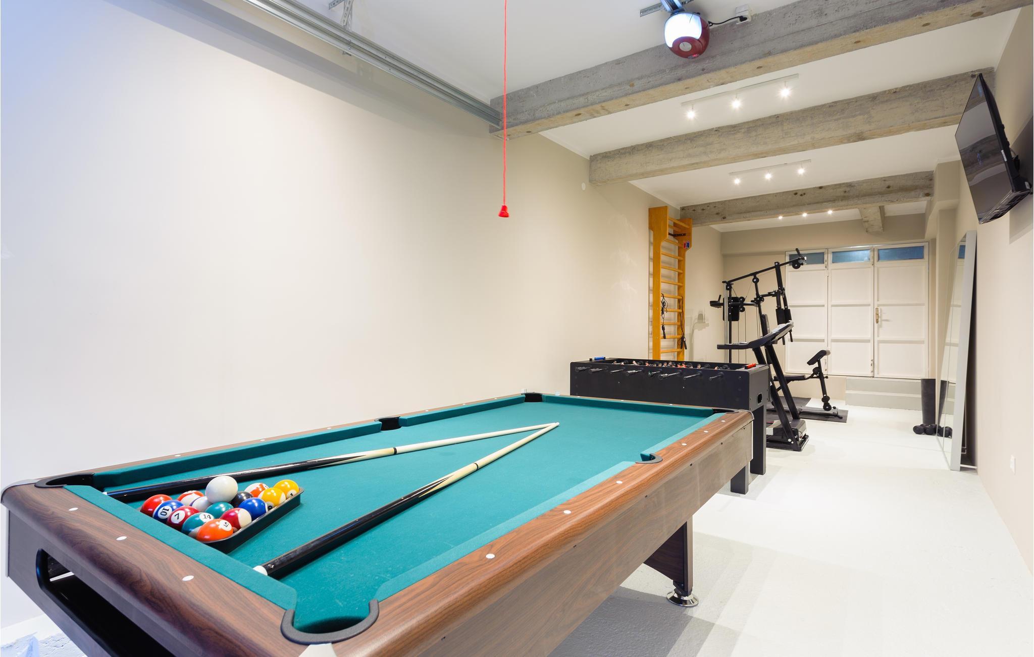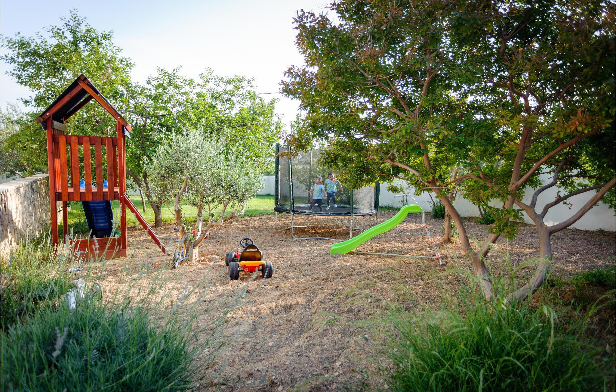 In dem weitläufigen, umzäunten Garten können die Gäste nicht nur den Pool genießen, sondern auch auf der überdachten Terrasse mit Außengrill entspannen. Für die Unterhaltung der Kinder ist mit diversen Sport- und Spielgeräten gesorgt.