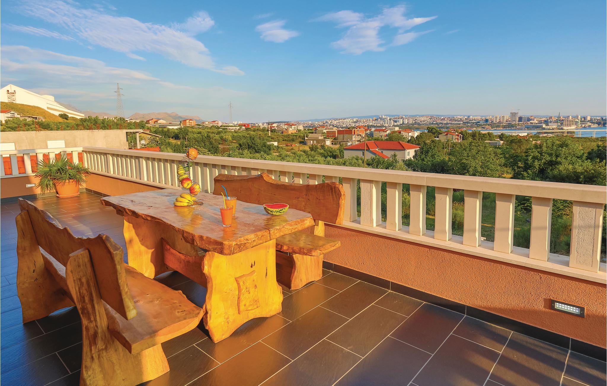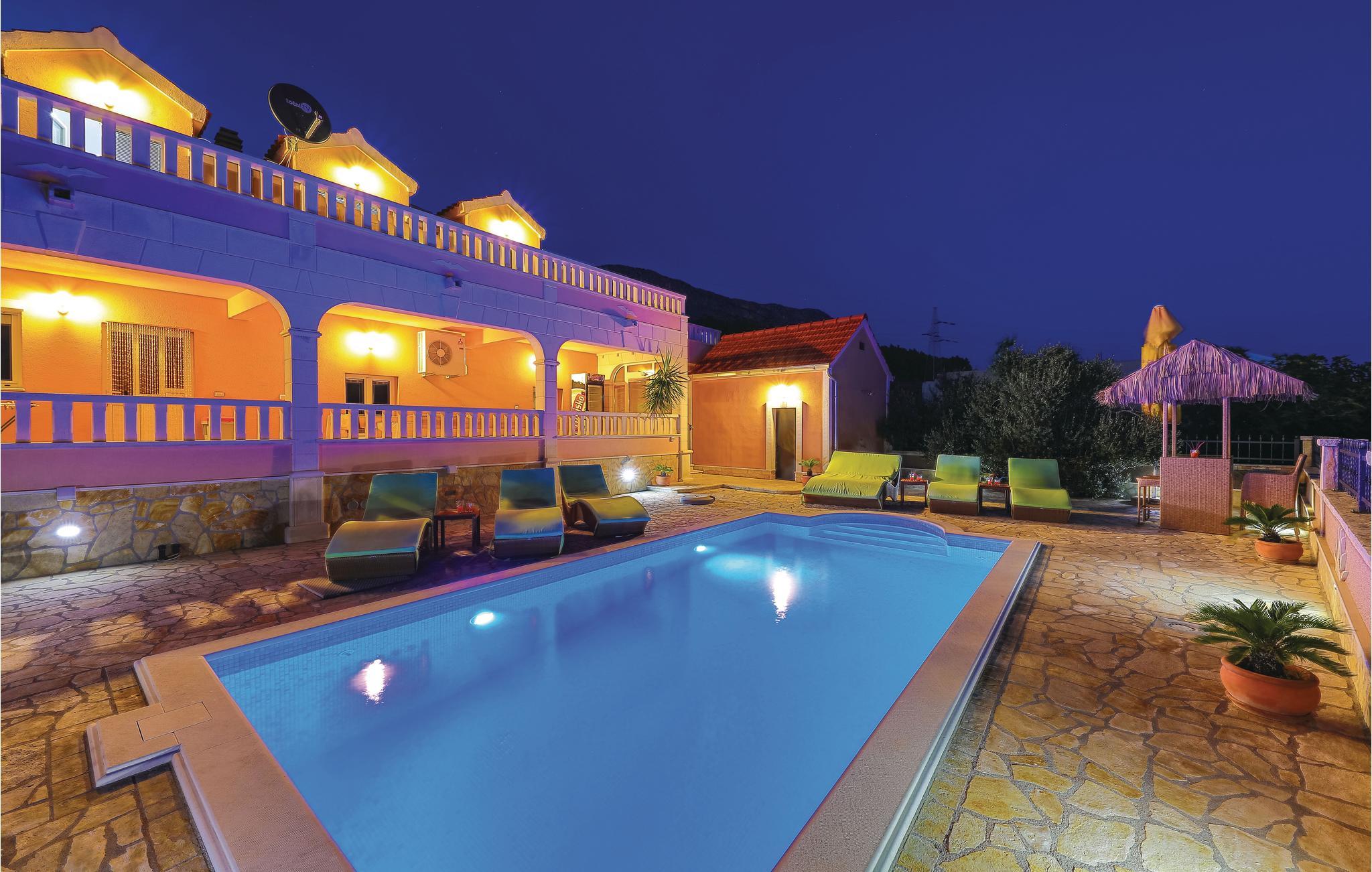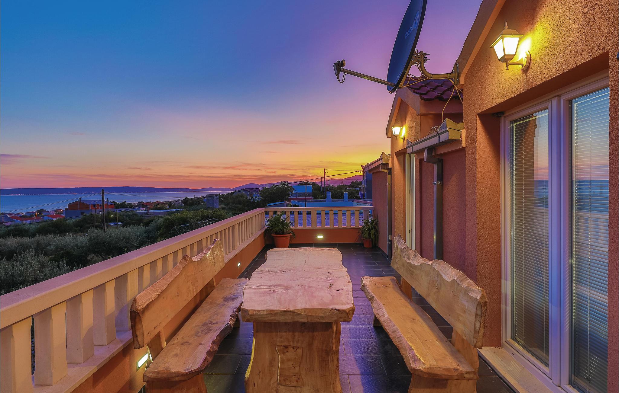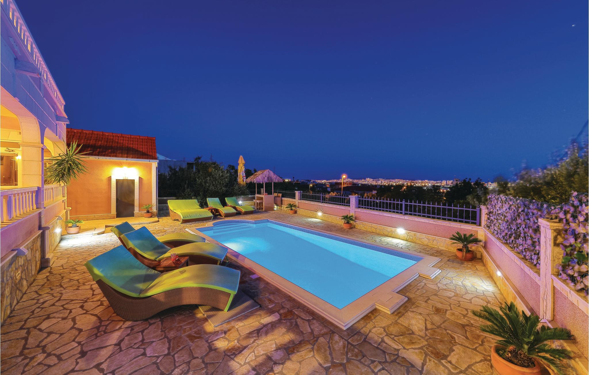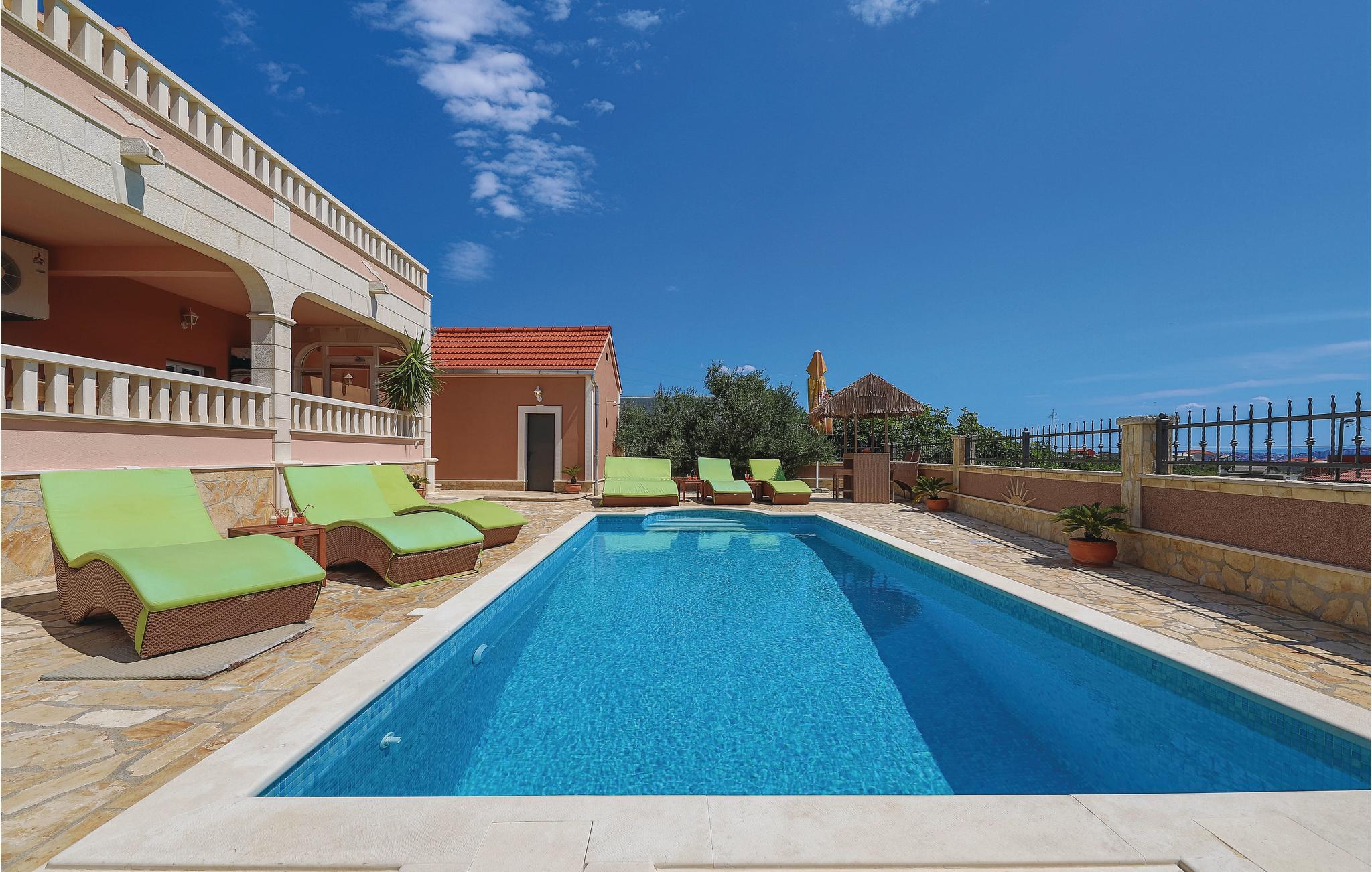 Dieses Ferienhaus ist ideal für diejenigen, die das Meer und die schöne Aussicht genießen möchten. Das Haus besteht aus zwei Wohnungen, die über Außentreppen zugänglich sind. Die geräumige Erdgeschosswohnung besteht aus drei Schlafzimmern, zwei Badezimmern, einem Fitnessraum sowie großem Wohnzimmer mit Küche und Essbereich, von dem sich ein Blick auf dem Pool bietet. Im ersten Stock gibt es ebenfalls eine geräumige Terrasse mit drei Schlafzimmern, zwei Bädern, einer Wohnküche und schöner Terrasse mit Panoramablick auf die Bucht von Kaštel. Zusätzlicher Komfort wird auf dem umzäunten Grundstück mit Pool- und Sonnendeck geboten. Der nächste Strand ist etwa 1,5 km weit entfernt und Sie können die kulturellen Zentren wie Split und Trogir mit dem Auto erreichen.