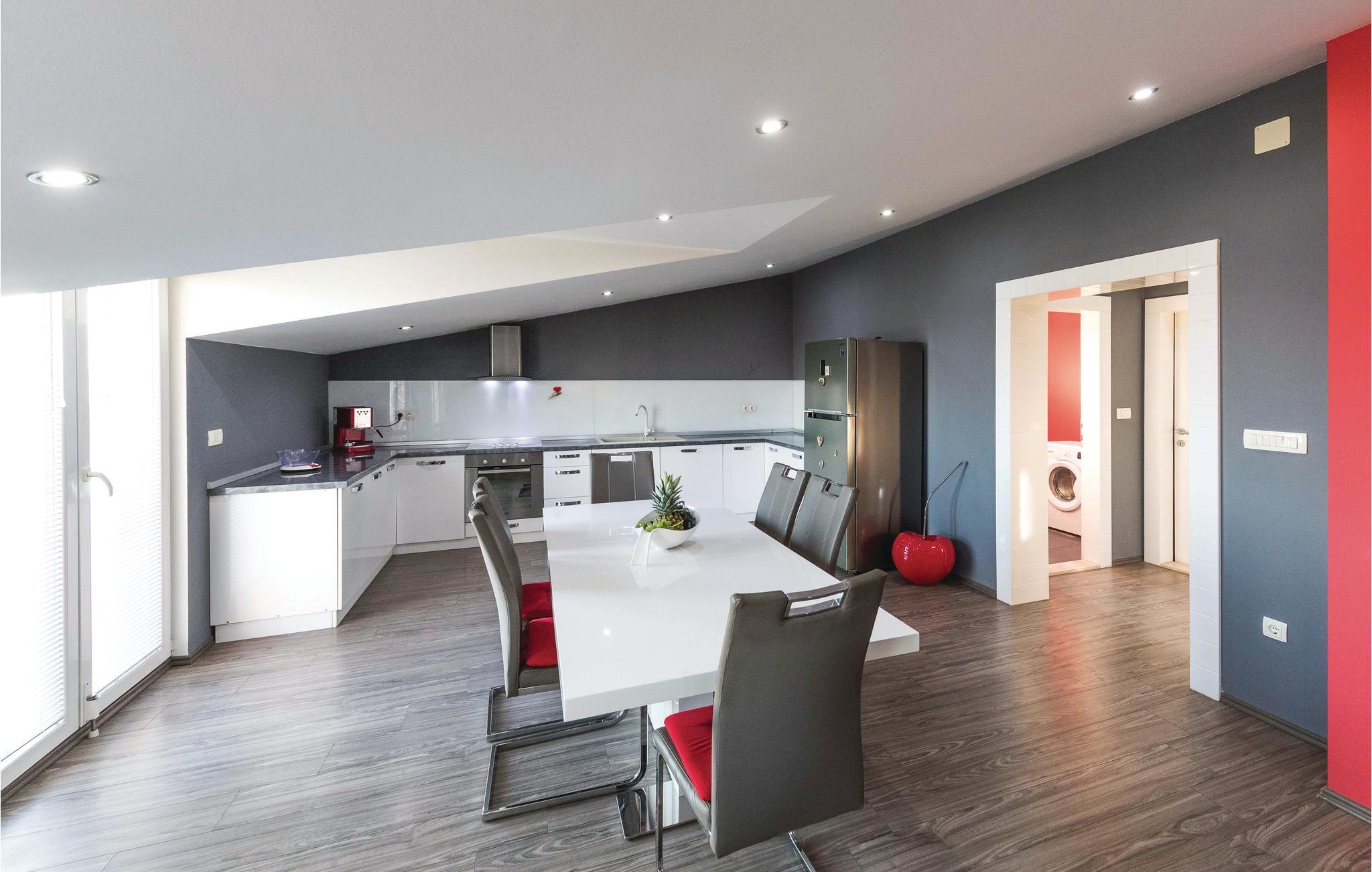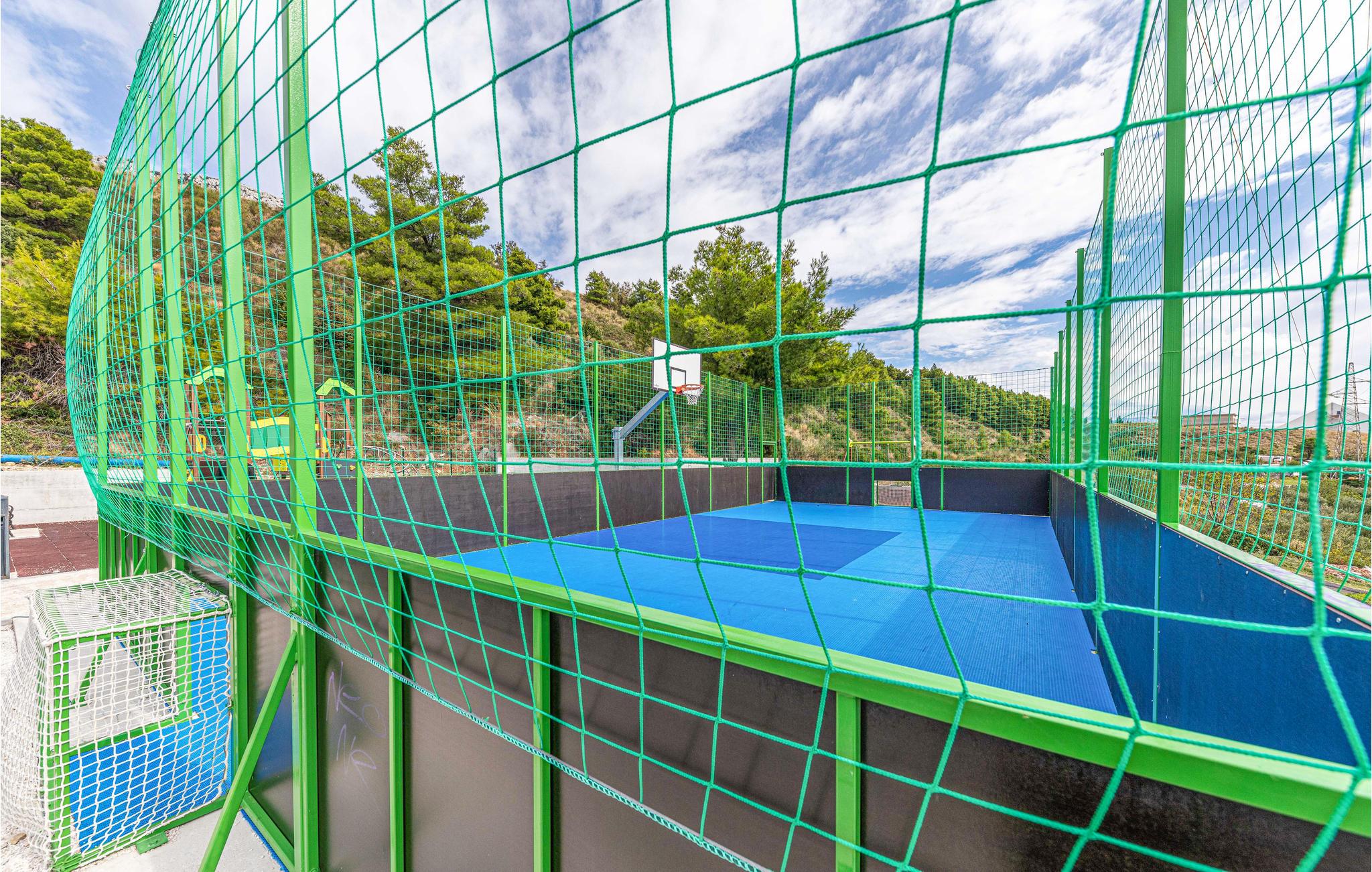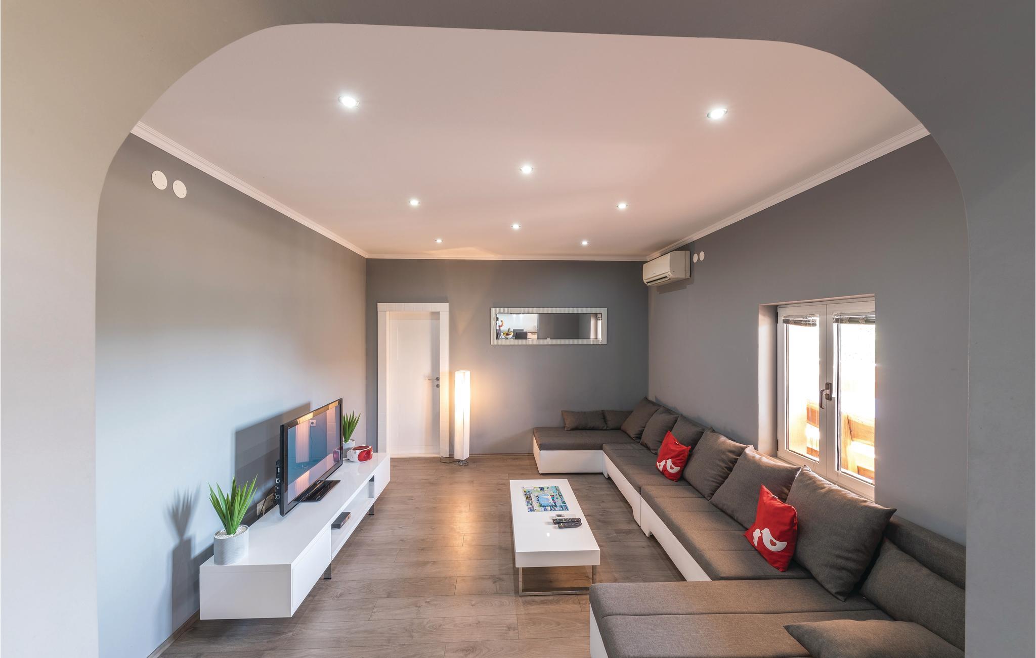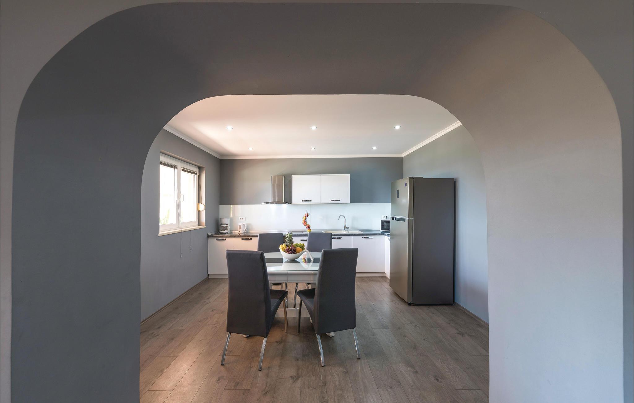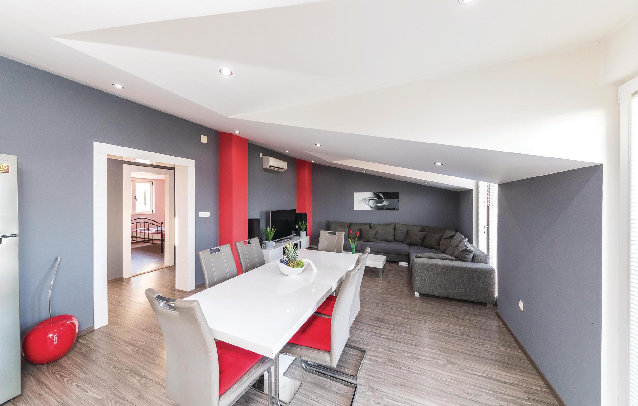 Dieses Ferienhaus ist ideal für diejenigen, die das Meer und die schöne Aussicht genießen möchten. Das Haus besteht aus zwei Wohnungen, die über Außentreppen zugänglich sind. Die geräumige Erdgeschosswohnung besteht aus drei Schlafzimmern, zwei Badezimmern, einem Fitnessraum sowie großem Wohnzimmer mit Küche und Essbereich, von dem sich ein Blick auf dem Pool bietet. Im ersten Stock gibt es ebenfalls eine geräumige Terrasse mit drei Schlafzimmern, zwei Bädern, einer Wohnküche und schöner Terrasse mit Panoramablick auf die Bucht von Kaštel. Zusätzlicher Komfort wird auf dem umzäunten Grundstück mit Pool- und Sonnendeck geboten. Der nächste Strand ist etwa 1,5 km weit entfernt und Sie können die kulturellen Zentren wie Split und Trogir mit dem Auto erreichen.