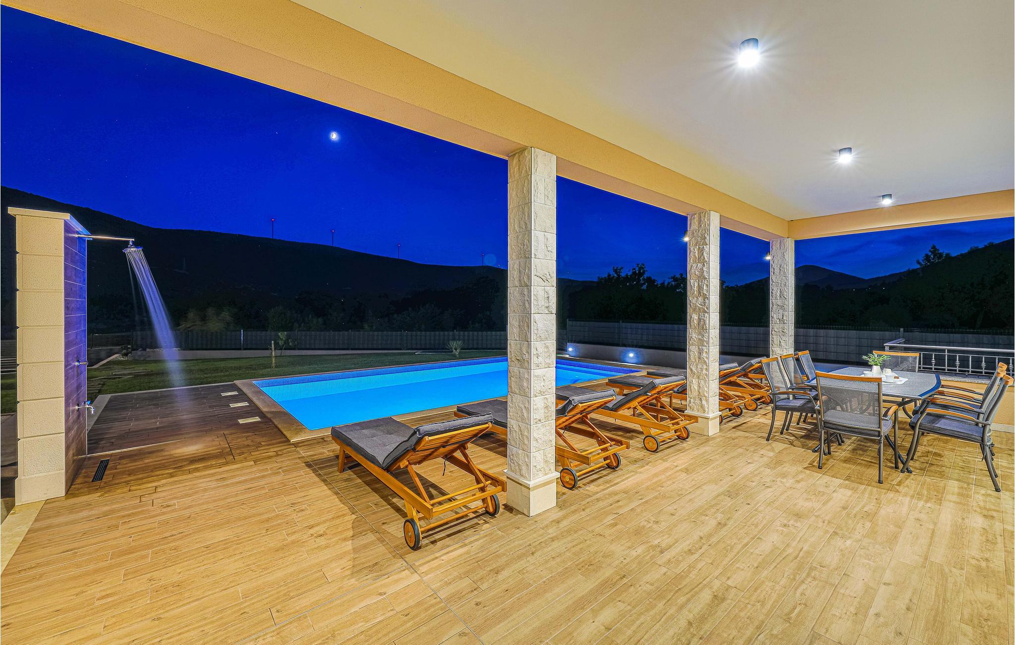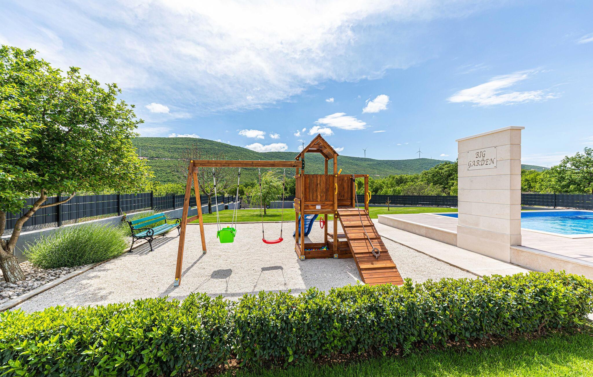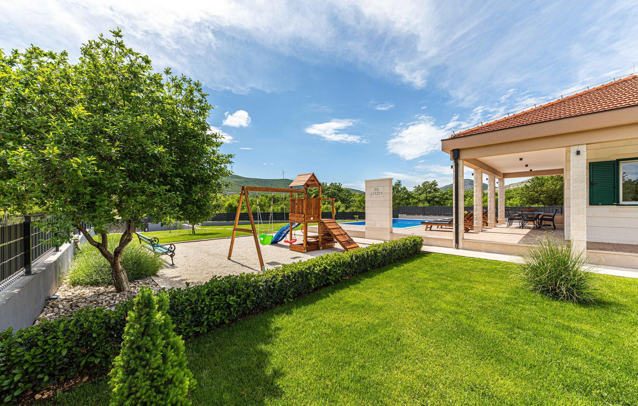 Der attraktive Außenbereich des Hauses bietet zahlreiche Möglichkeiten, eine schöne Zeit im Freien zu verbringen. Genießen Sie ganz nach Belieben die Sonne auf verschiedenen Terrassen und erfrischen Sie sich im privaten Pool mit Blick auf die Berge. Bereiten Sie leckere Gerichte auf dem Grill zu und lassen Sie den Tag unter freiem Himmel ausklingen.