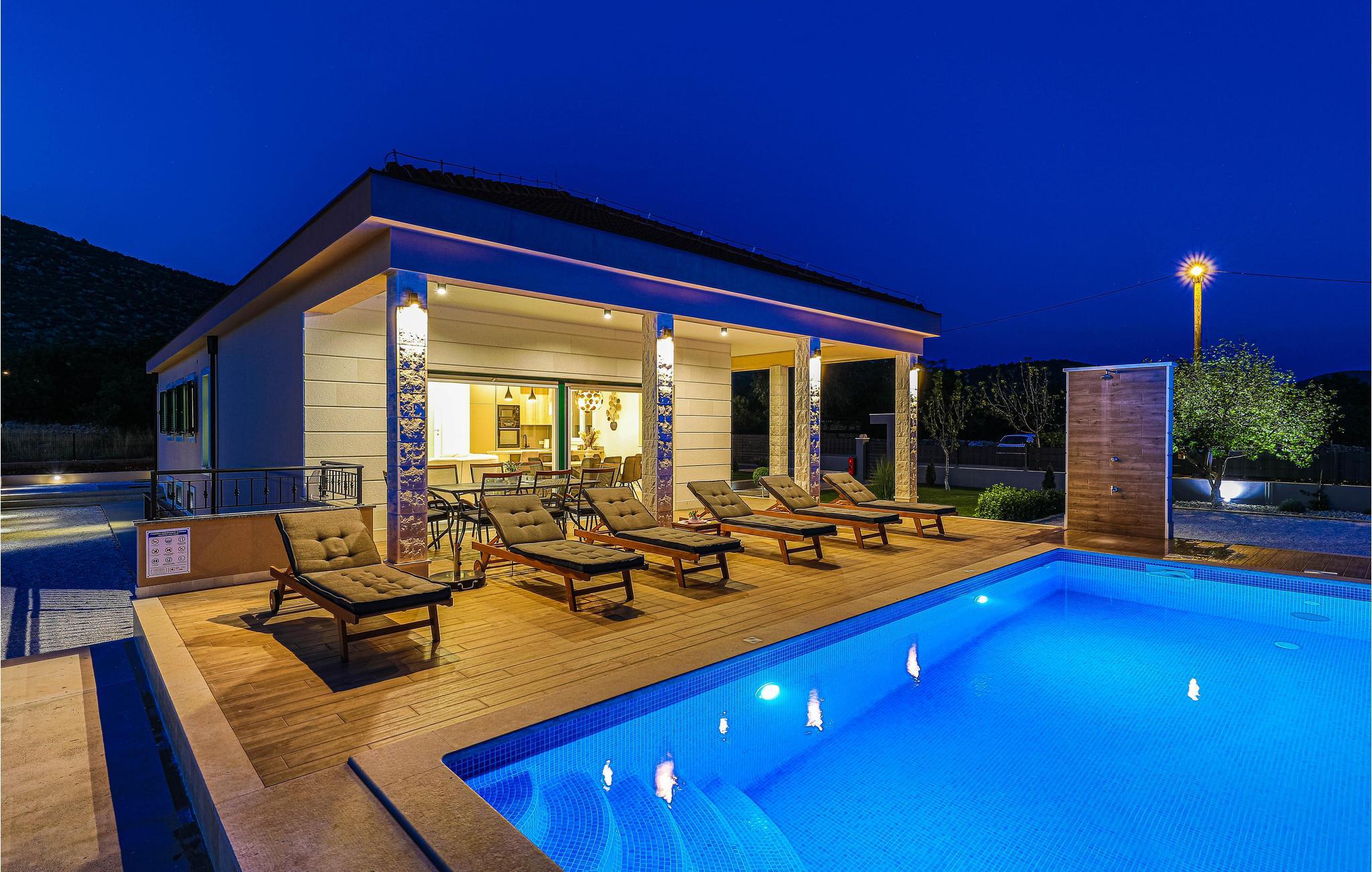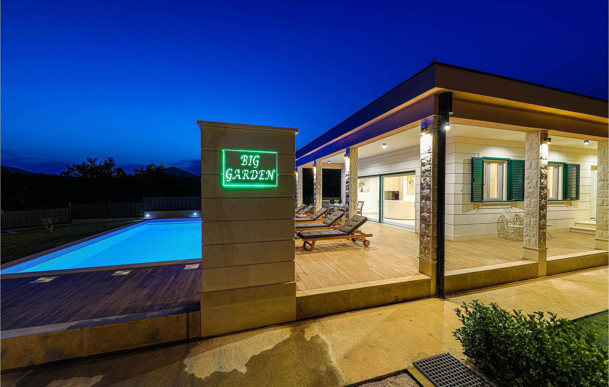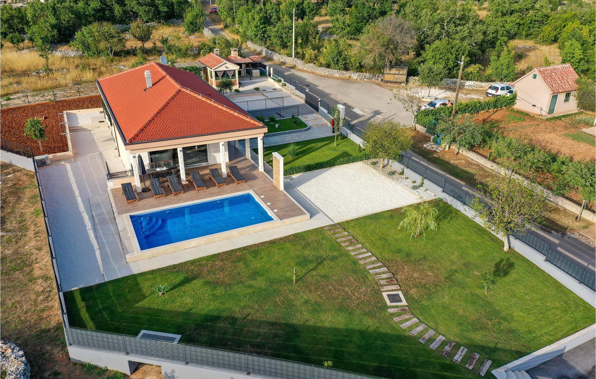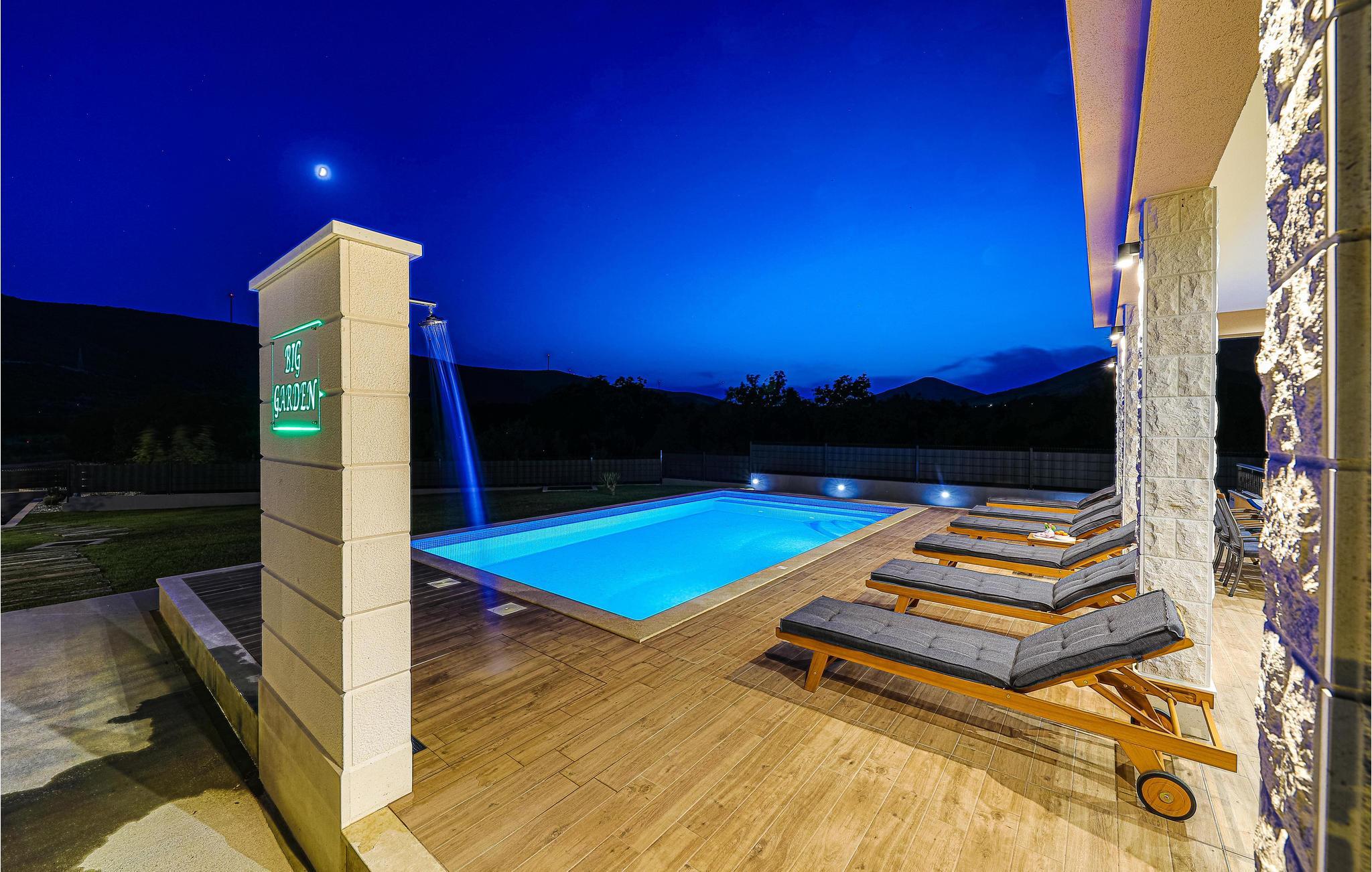 Der attraktive Außenbereich des Hauses bietet zahlreiche Möglichkeiten, eine schöne Zeit im Freien zu verbringen. Genießen Sie ganz nach Belieben die Sonne auf verschiedenen Terrassen und erfrischen Sie sich im privaten Pool mit Blick auf die Berge. Bereiten Sie leckere Gerichte auf dem Grill zu und lassen Sie den Tag unter freiem Himmel ausklingen.