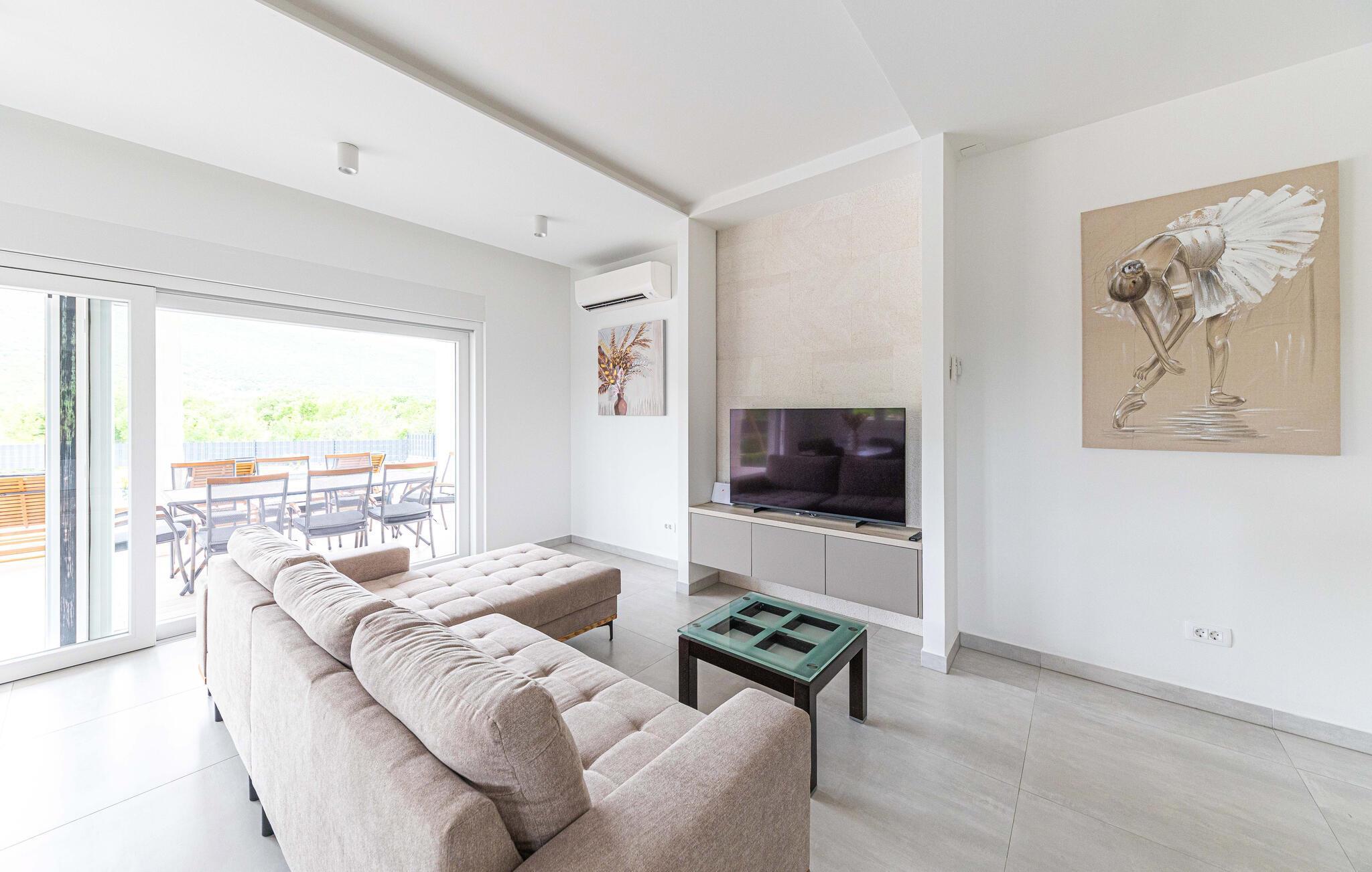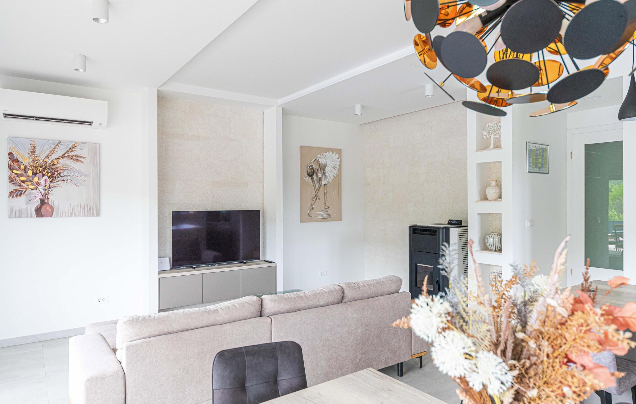 Das exklusive Haus empfängt Sie guter Lage und bezaubert mit seiner stilvollen Einrichtung. Entspannen Sie in komfortablem Ambiente, hier treffen helle Räume auf eine moderne Einrichtung und zeitgenössisches Design, genau der richtige Rahmen für die Urlaubserholung. Nach einem herrlichen Urlaubstag, den Sie vielleicht mit einem Ausflug verbracht haben, lädt das bequeme Sofa dazu ein, noch lange gemütlich zusammen zu sitzen, lassen Sie Ihre Erlebnisse Revue passieren und schmieden Sie schon einmal Pläne für den nächsten Tag.