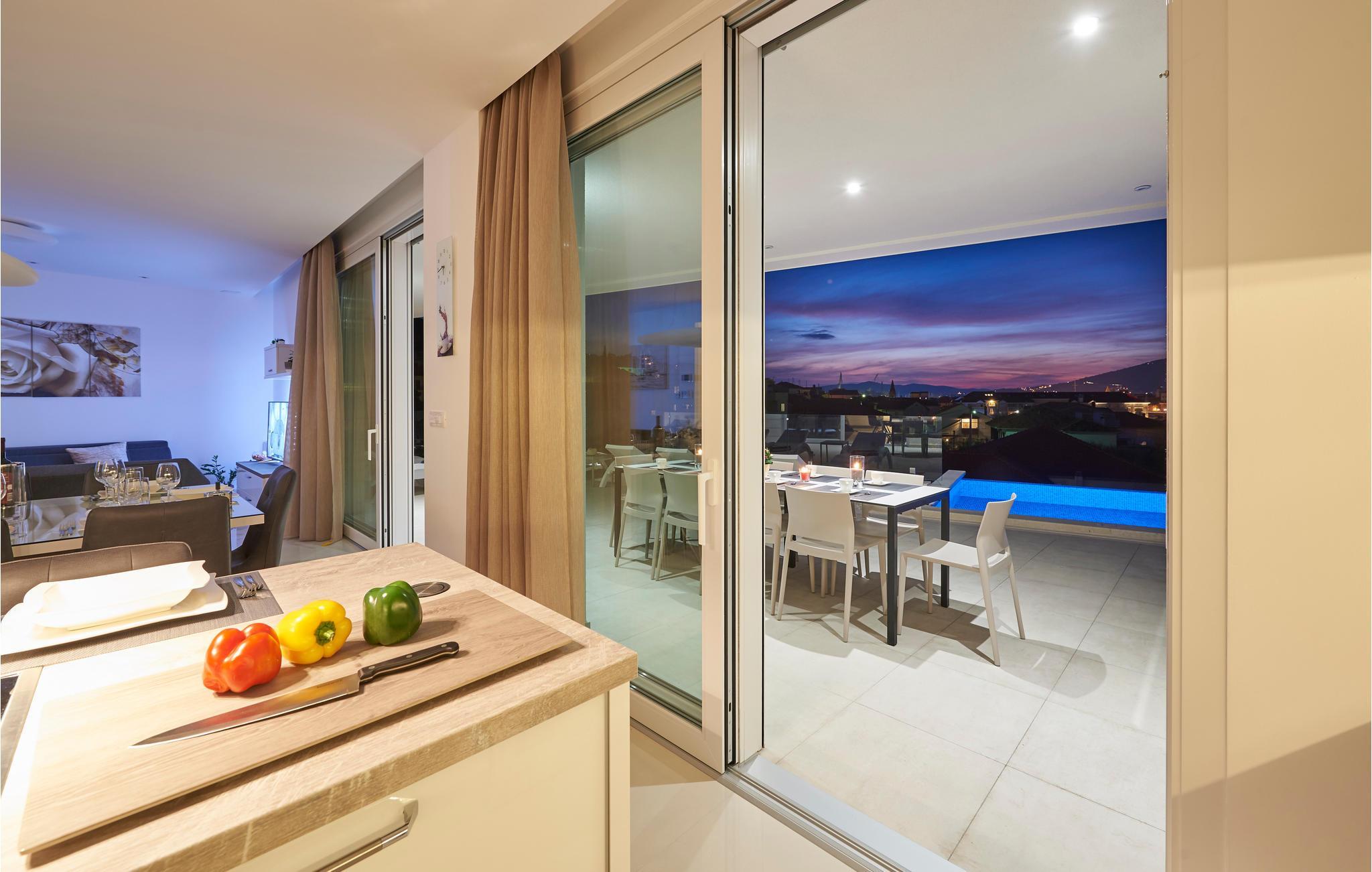 Freuen Sie sich auf das Entspannen im beheizten Pool, im Whirlpool oder in der Sauna. Das ganze Haus ist klimatisiert, sodass es auch an heißen Sommertagen immer angenehm ist. Für Kinder steht ein Spielzimmer bereit, für Sportliche ein Fitnessraum mit Soundsystem. Genießen Sie gesellig beisammen sitzend Ihre Mahlzeiten, während abends der Blick über die malerisch erleuchtete Stadt schweift.
