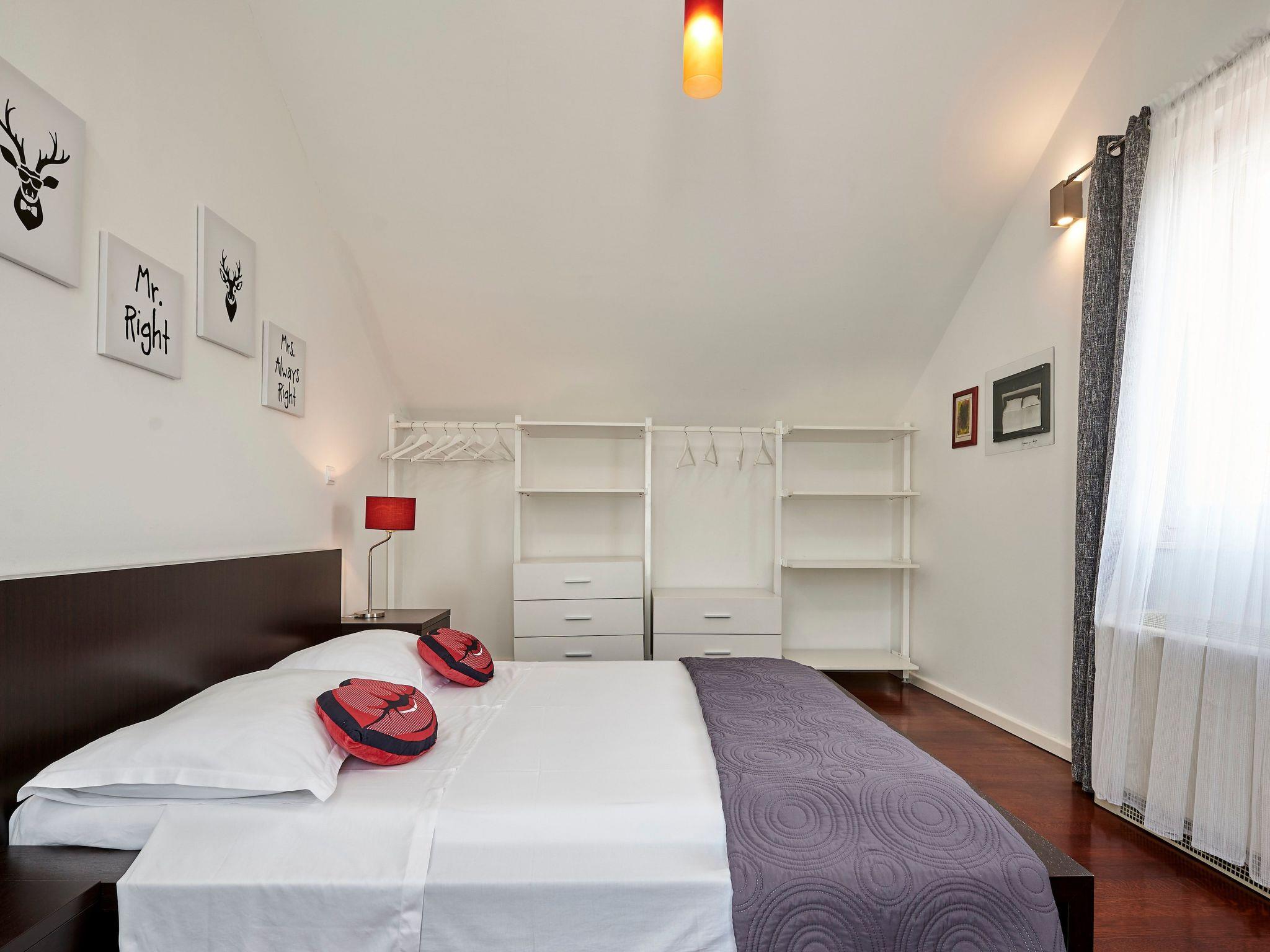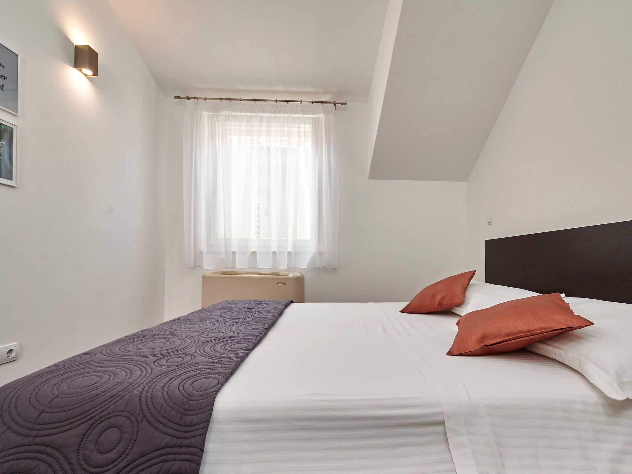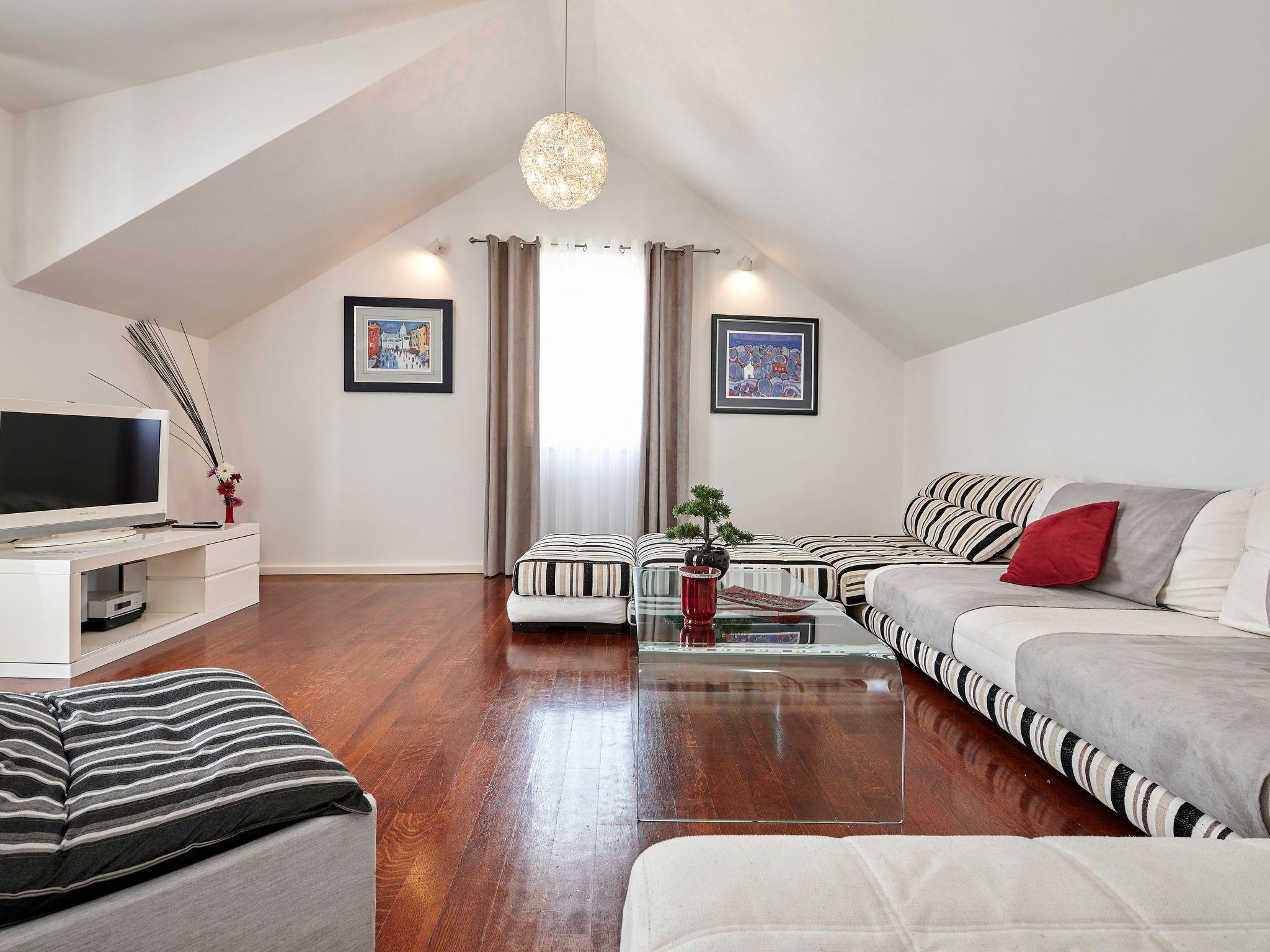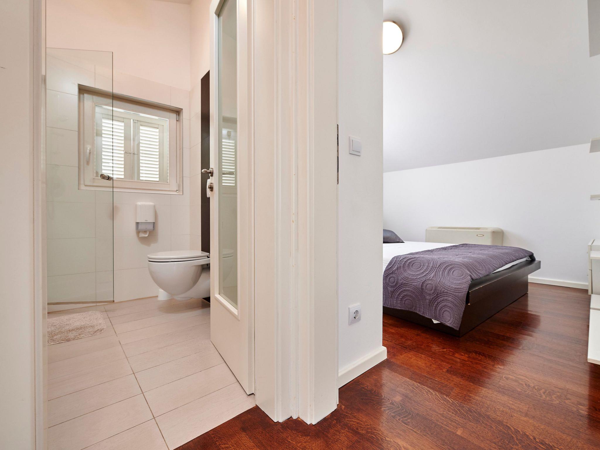 Das Penthouse besteht aus drei Doppelschlafzimmern mit einem Badezimmer. Dieser Schlafbereich ist durch einen privaten Flur mit einer Sitzecke, mit einem geräumigen Wohnzimmer mit gewölbter Decke verbunden. Zusätzlich zu einer gut ausgestatteten Küche gibt es ein zweites luxuriöses Badezimmer und einen Balkon mit Blick auf den Hafen von Trogir und die alten Kirchtürme und Dächer.