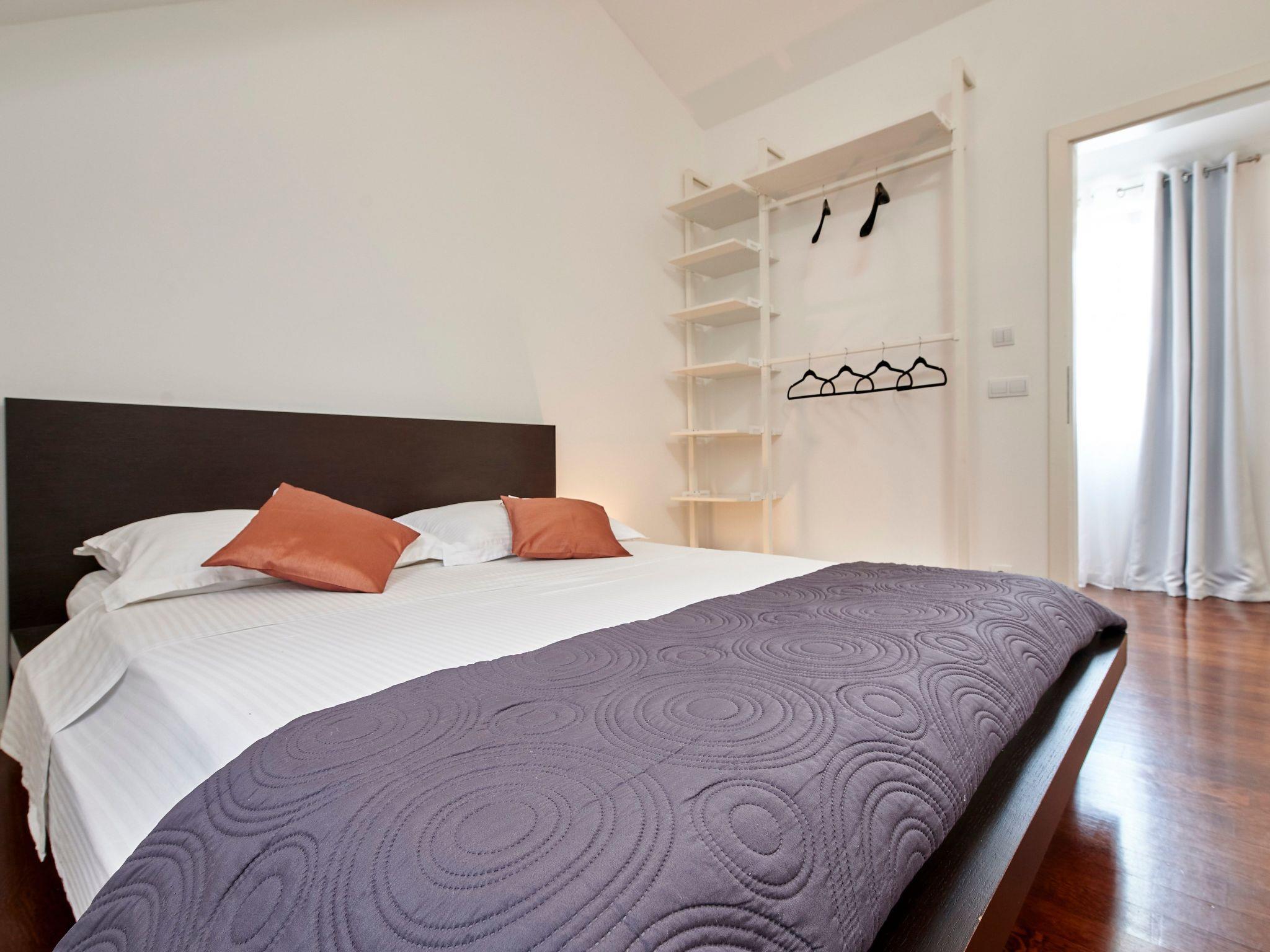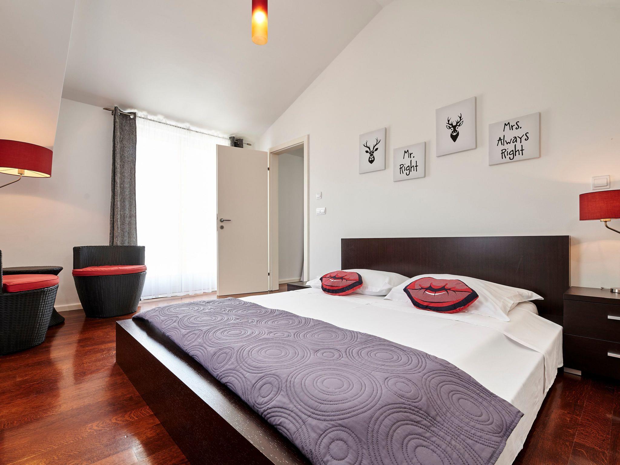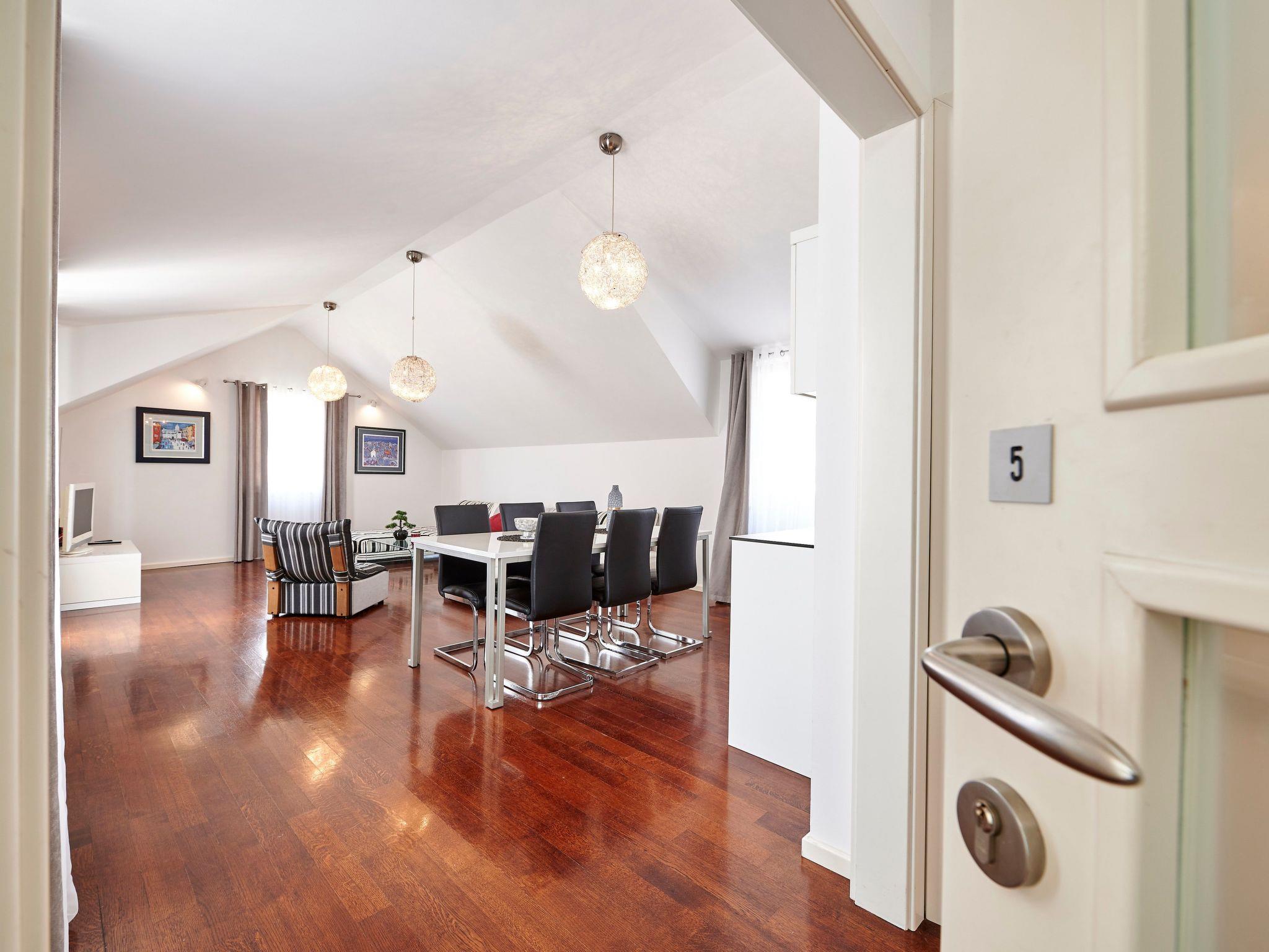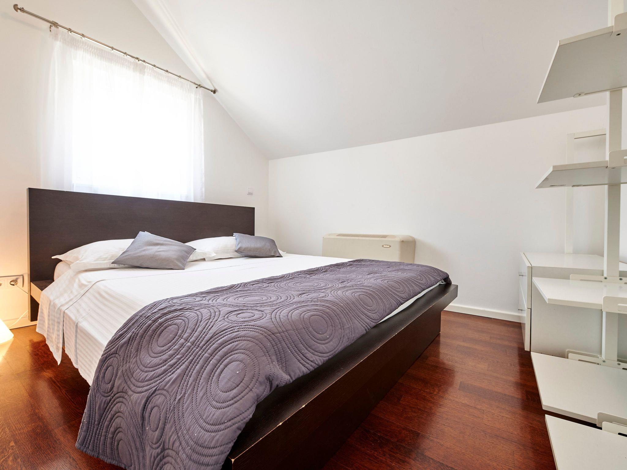 Das Penthouse besteht aus drei Doppelschlafzimmern mit einem Badezimmer. Dieser Schlafbereich ist durch einen privaten Flur mit einer Sitzecke, mit einem geräumigen Wohnzimmer mit gewölbter Decke verbunden. Zusätzlich zu einer gut ausgestatteten Küche gibt es ein zweites luxuriöses Badezimmer und einen Balkon mit Blick auf den Hafen von Trogir und die alten Kirchtürme und Dächer.