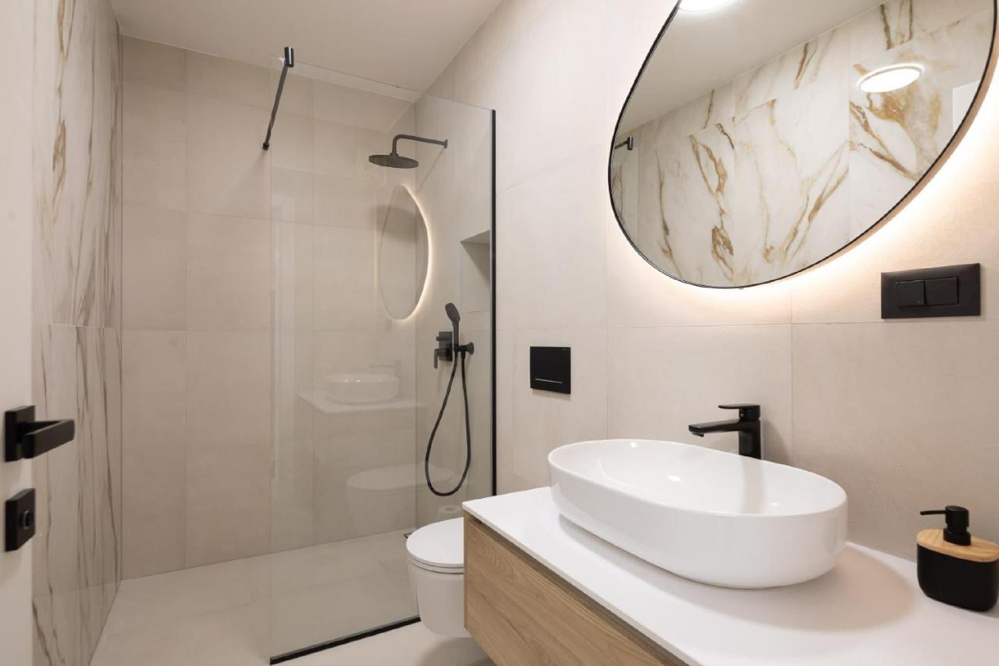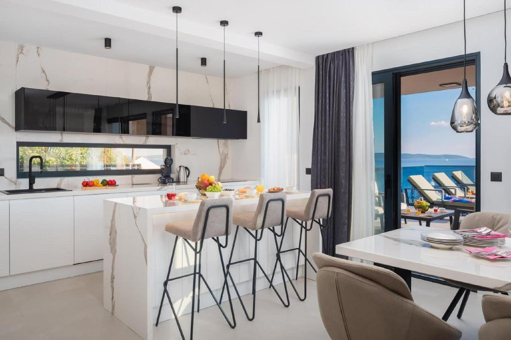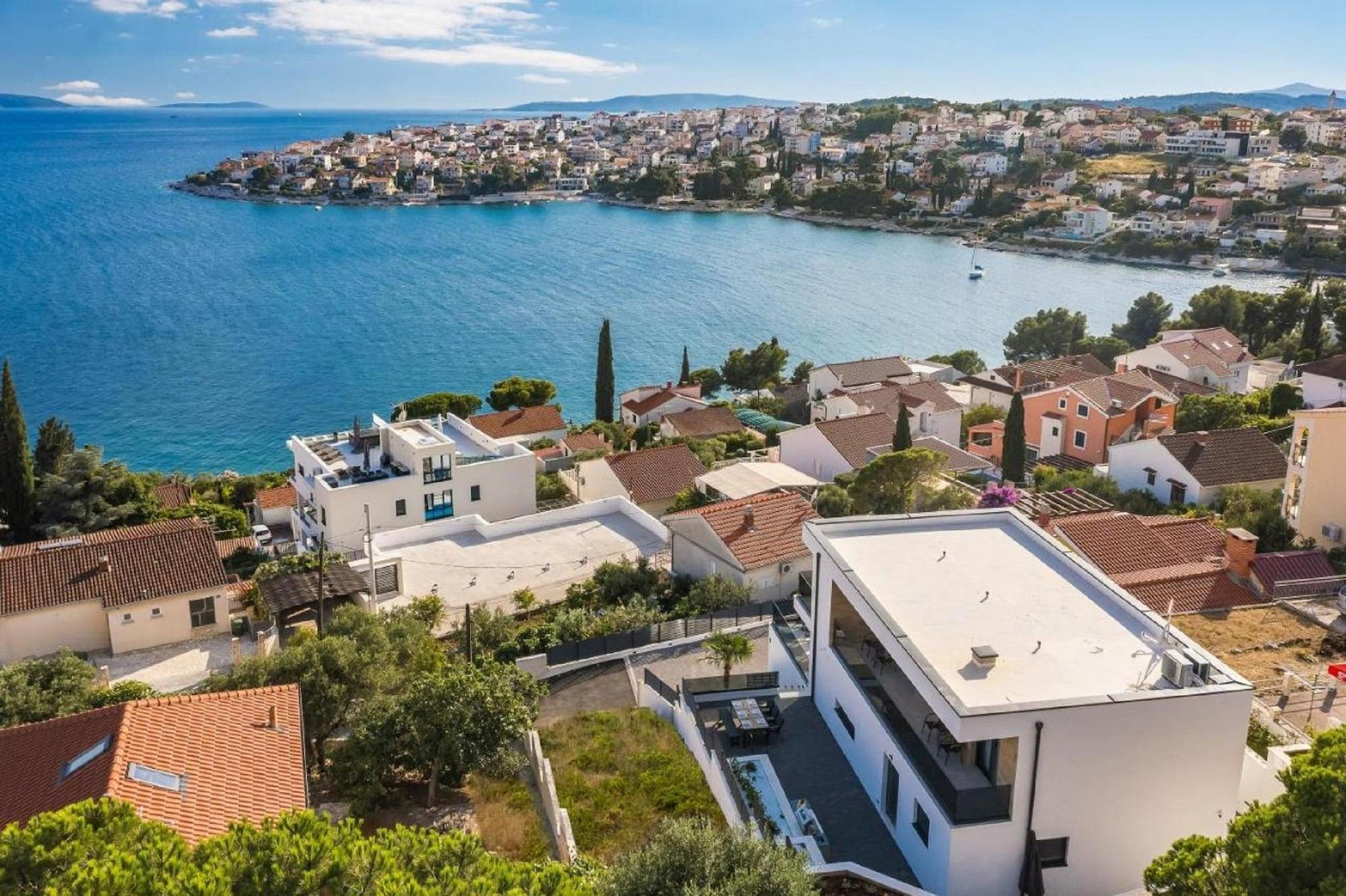 Nur 350 m vom Meer und 3 km von der Altstadt Trogirs entfernt bietet diese elegante Villa mit 4 Schlafzimmern einen luxuriösen Aufenthalt für bis zu 8 Gäste. Mit privatem Pool, eingezäuntem Garten und mehreren Terrassen vereint sie Komfort und Küstencharme perfekt – ideal für Familien oder Gruppen. Jedes Schlafzimmer verfügt über ein Doppelbett, ein eigenes Bad, Smart-TV und Klimaanlage. Die oberen Zimmer öffnen sich zu privaten Balkonen. Das Erdgeschoss umfasst einen stilvollen Wohn-/Essbereich, eine voll ausgestattete Küche mit modernen Geräten und ein zusätzliches WC. Im Untergeschoss befinden sich ein Fitnessraum, eine Sauna, ein zusätzliches Badezimmer sowie eine Garage, ein Waschraum und eine Außenküche. Gästen stehen kostenloses WLAN, Sat-TV, Tischfußball und Spielgeräte zur Verfügung. Der Garten bietet Sonnenliegen, einen Grill und ein Lounge-Set für entspannte Abende. Da der Flughafen Split nur 4 km entfernt ist und Geschäfte, Cafés und Restaurants fußläufig erreichbar sind, ist diese Villa ein idealer Ausgangspunkt für die Erkundung der dalmatinischen Küste.