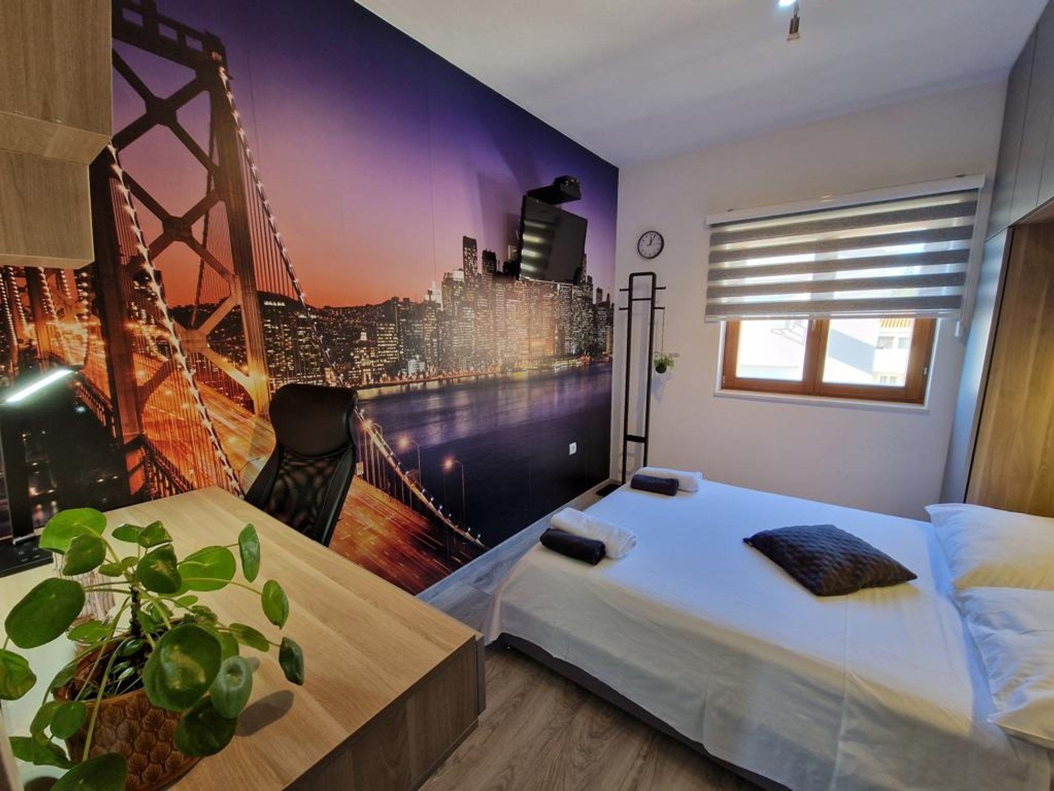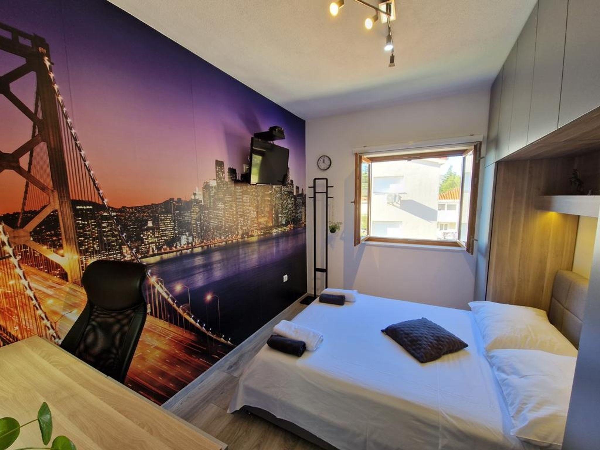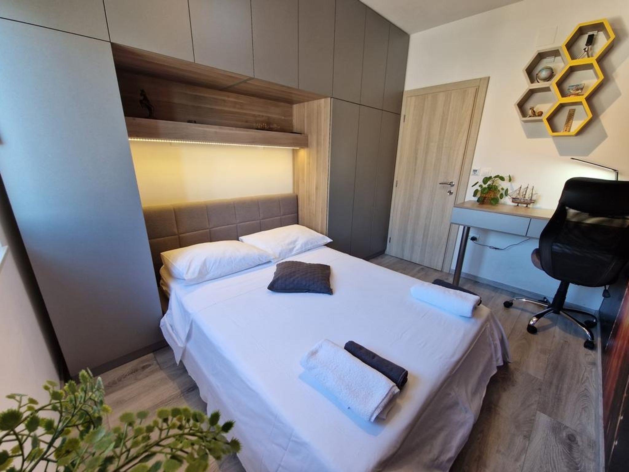 Ferienwohnung bietet Platz für 6 Gäste. Die Betten sind in Schlafzimmern, die es 3 gibt, innerhalb einer Gesamtfläche von 101m2, angeordnet. Die Gäste haben eine eigene Terrasse zur Verfügung, auf der sie in warmen Sommernächten genießen können. Das Apartment bietet Meerblick. Für vollen Genuss und Entspannung gibt es einen privaten Grill für Gäste dieser Unterkunft. IM PREIS INBEGRIFFEN: Kurtaxe, Endreinigung, Klimatisierung, Parkplatz, Internet, Kinderbett, Bügeleisen, Bügelbrett, Föhn. Die Verfügbarkeit zusätzlicher Dienstleistungen in Ihrem reservierten Termin und die Preise derselben (falls nicht aufgeführt) müssen im Voraus überprüft werden. Zusätzliche Dienstleistungen die in der Zahlungsaufforderung nicht aufgeführt sind werden direkt beim Vermieter bezahlt, angenommen der Gast nutzt auch diese.