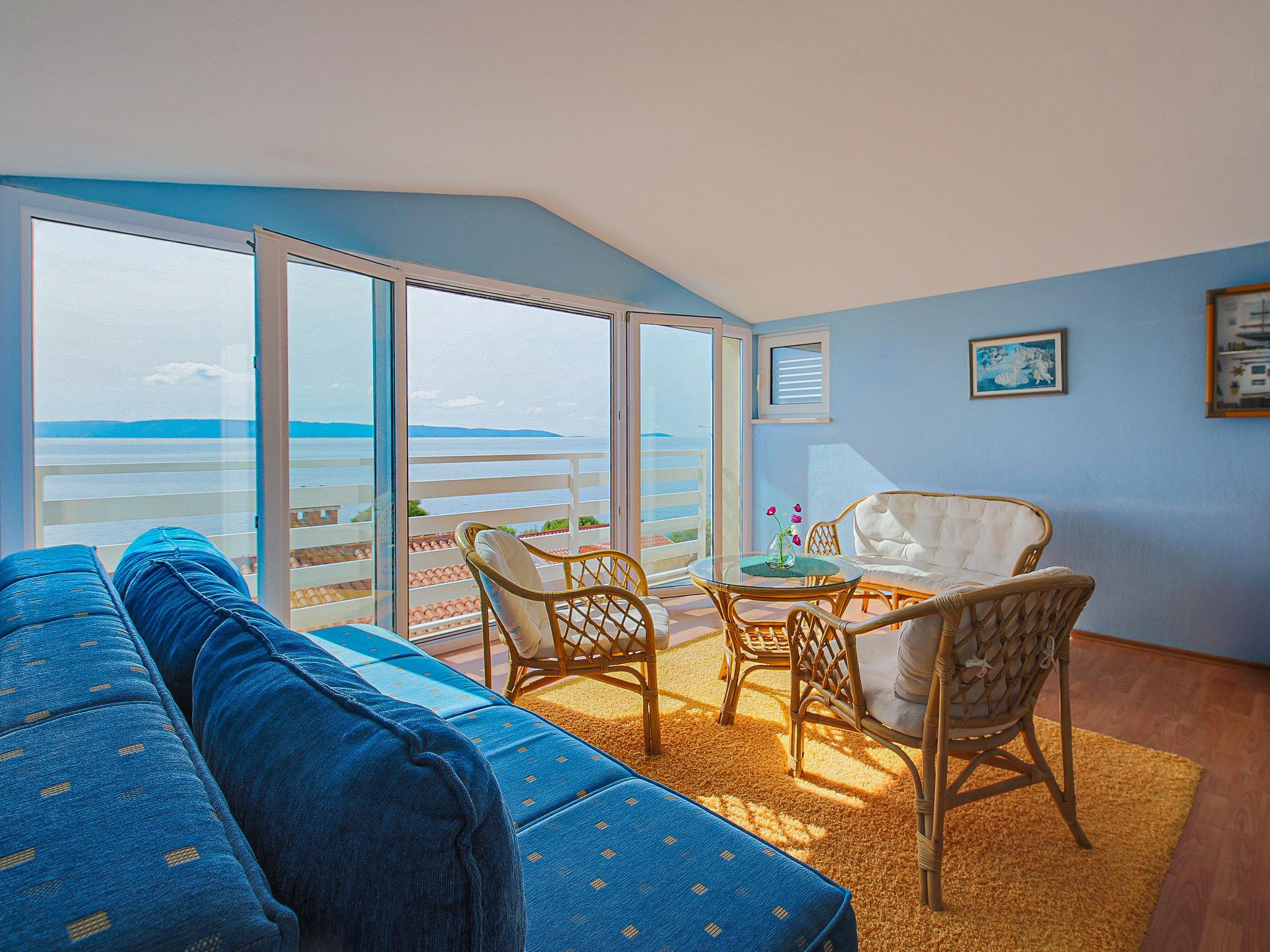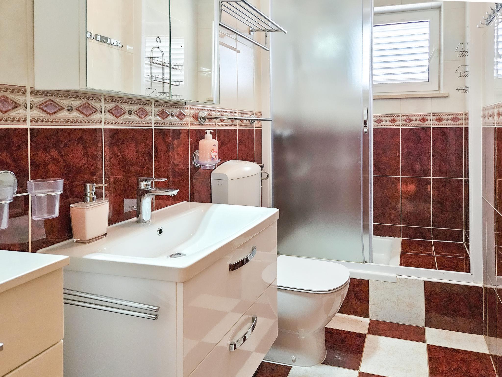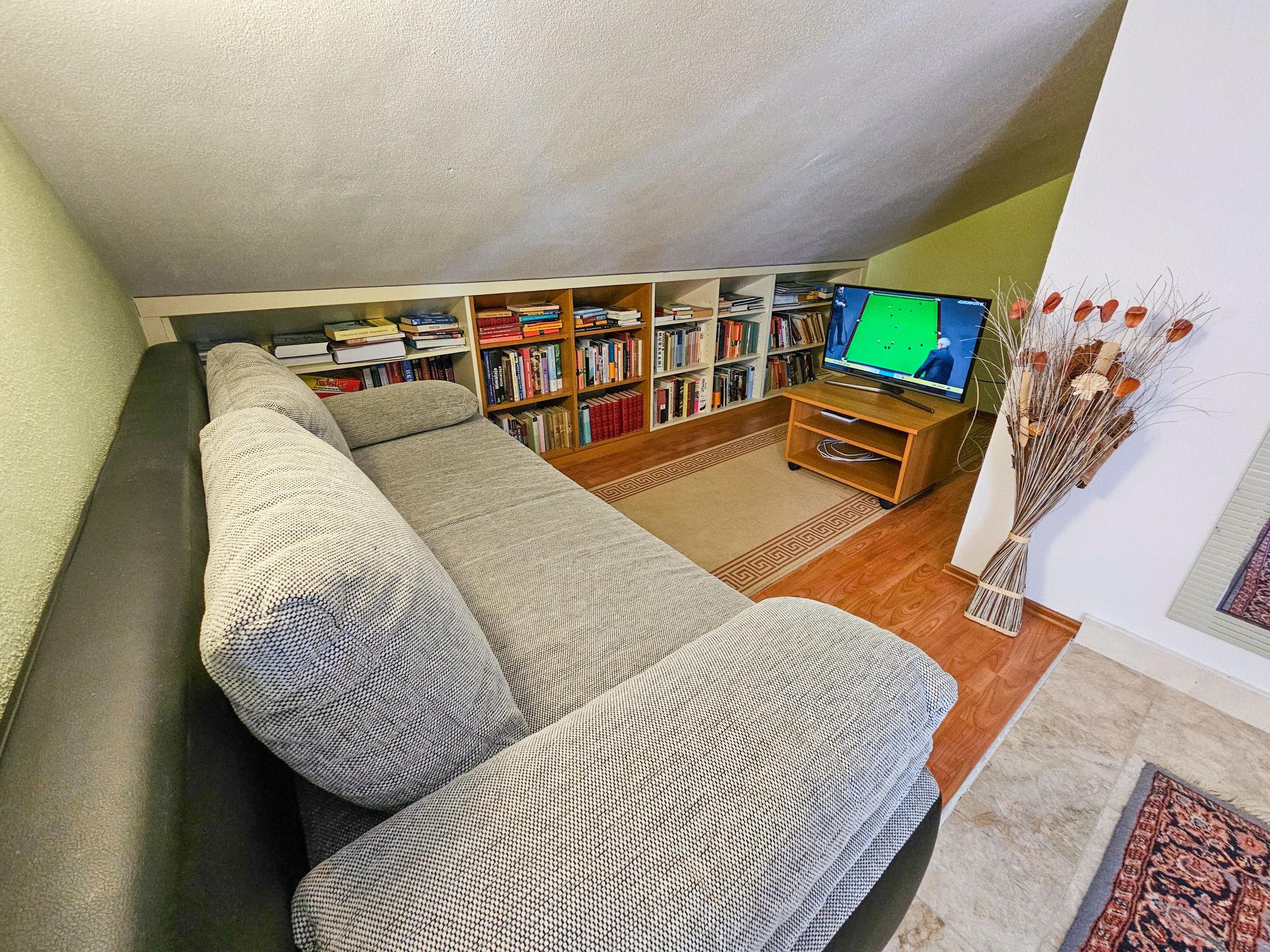 5-Zimmer-Wohnung 160 m2 auf 2 Stockwerken, Südlage. 3 Zimmer, jedes Zimmer mit 1 franz. Bett (160 cm, Länge 200 cm), Klimaanlage und Ventilator. Küche (4 Kochplatten, Backofen, Geschirrspüler, Wasserkocher, Mikrowelle, Tiefkühler, elektrische Kaffeemaschine) mit Esstisch, Sat-TV (Flachbildschirm), Klimaanlage und Ventilator. Ausgang zur Terrasse. Dusche/WC. Obergeschoss: Wohnzimmer, Deckenhöhe 80 - 230 cm mit Sat-TV (Flachbildschirm). Ausgang zur Loggia. 1 Zimmer mit 1 franz. Bett (160 cm, Länge 200 cm), Klimaanlage. Dusche/WC. Terrasse 12 m2. Terrassenmöbel, Liegestühle (2). Schöne Sicht auf das Meer. Zur Verfügung: Waschmaschine, Kinderhochstuhl, Babybett. Internet (Wireless LAN, gratis). 6721