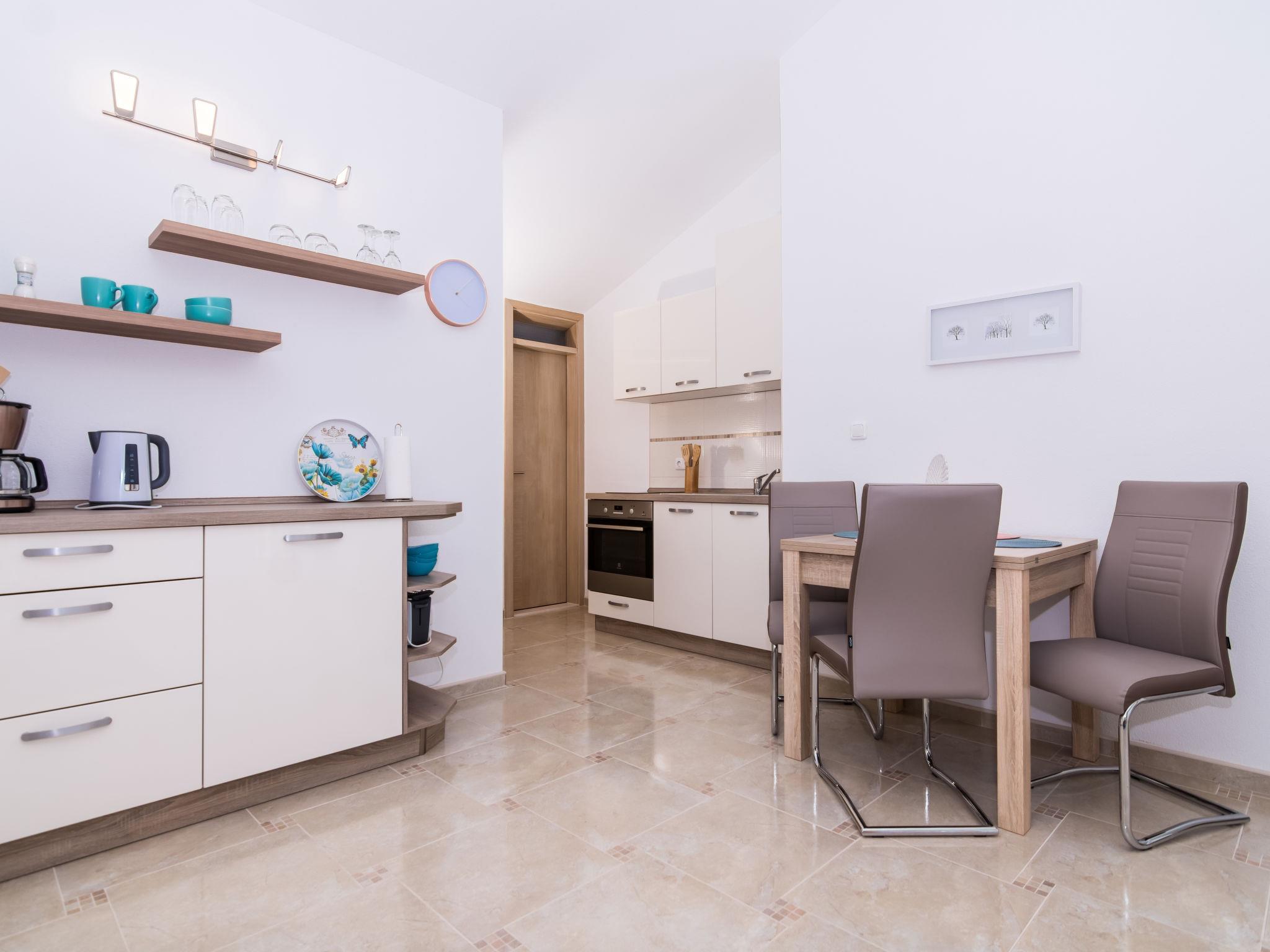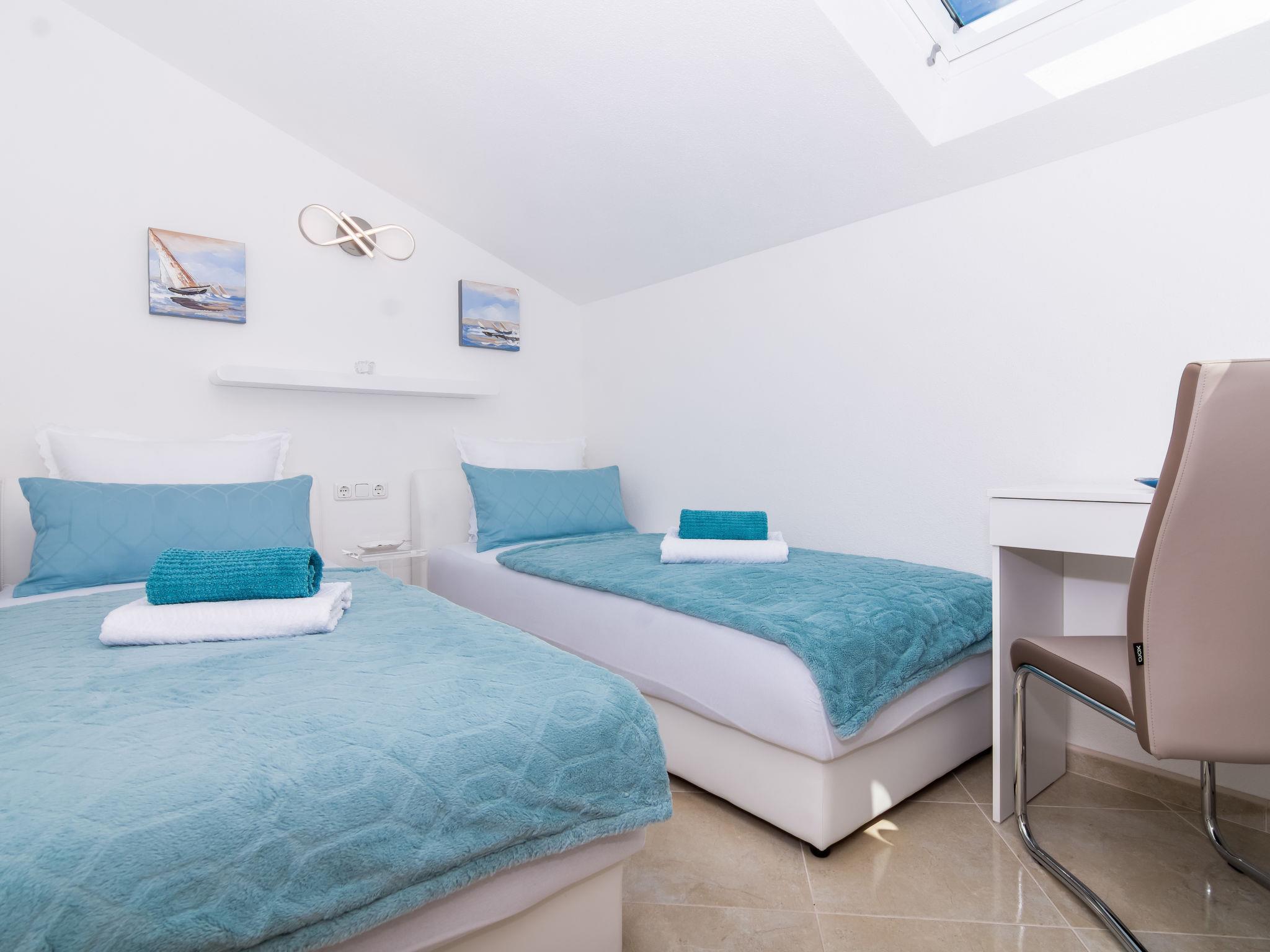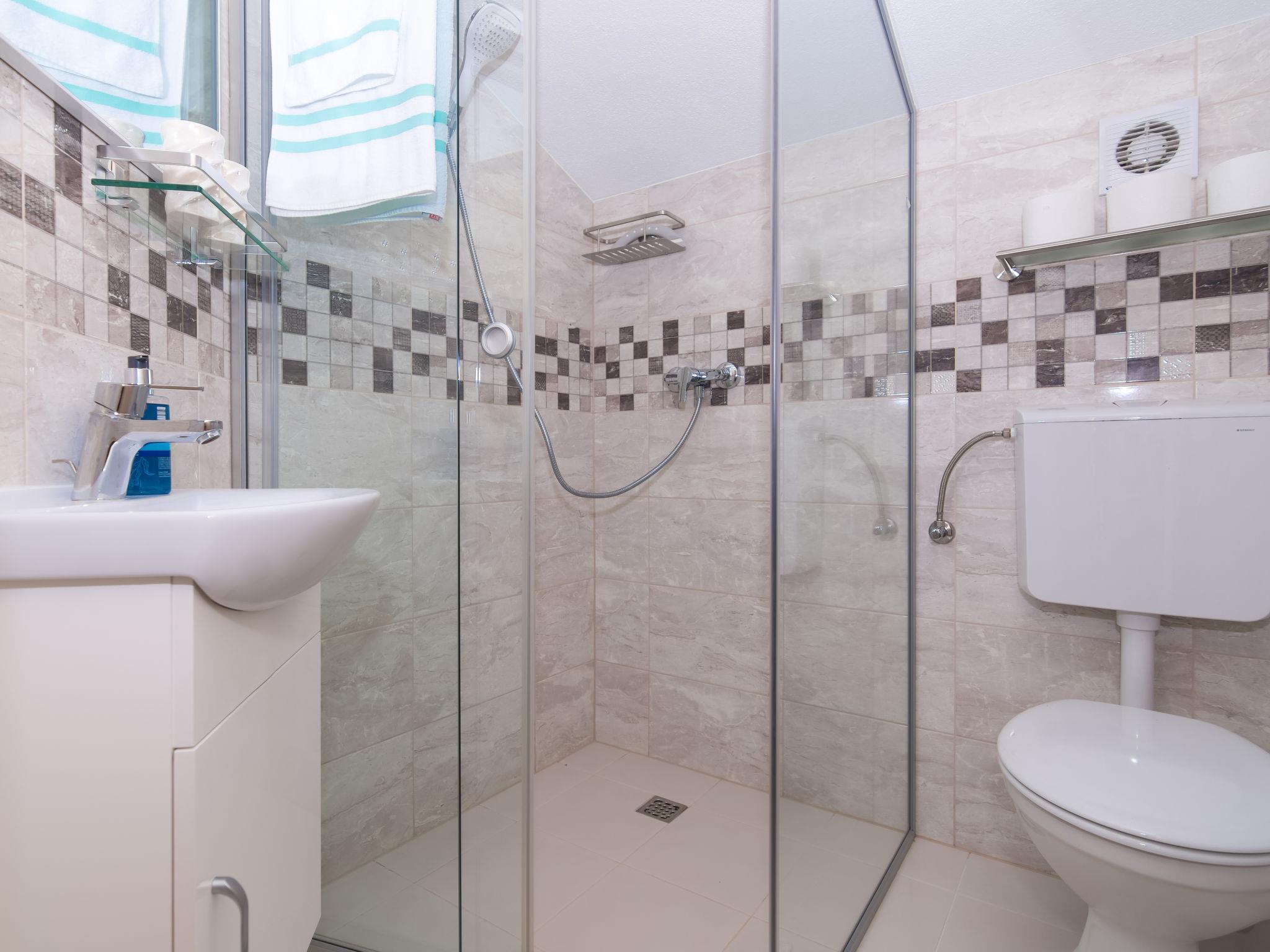 Okrug Gornji (Ciovo) 6 km von Trogir: Schönes Mehrfamilienhaus "Villa Nikaroni". 1.5 km vom Zentrum von Okrug Gornji, ruhige, sonnige Lage, 250 m vom Meer, 250 m vom Strand. Zur Mitbenutzung: Grundstück 1'000 m2, Garten mit Rasen. Grill. Im Hause: Internetzugang. Parkplatz beim Haus auf dem Grundstück. Einkaufsgeschäft, Restaurant 650 m, Bushaltestelle 2 km, Felsstrand 250 m.