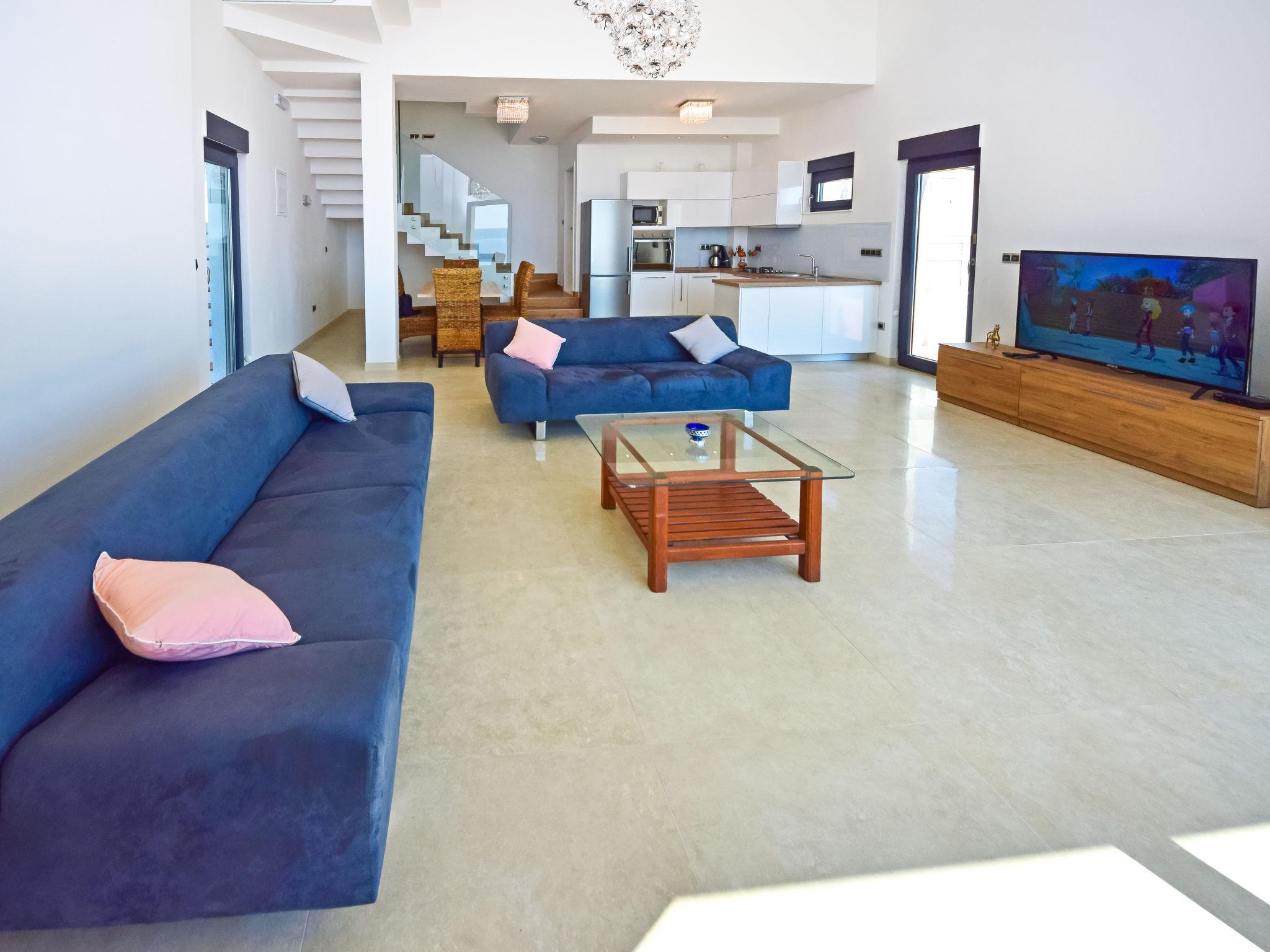 4-Zimmer-Villa 120 m2 auf 2 Stockwerken. Modern eingerichtet: Wohn-/Esszimmer 65 m2 mit Sat-TV (Flachbildschirm), Klimaanlage. Ausgang zur Terrasse, zum Schwimmbad. Offene Küche (4 Kochplatten, Backofen, Geschirrspüler, Mikrowelle, Tiefkühler, elektrische Kaffeemaschine). Sep. WC. Obergeschoss: 1 Zimmer mit 1 Bett (80 cm, Länge 200 cm), 1 x 1 Etagenbetten (80 cm, Länge 200 cm). 1 Zimmer mit 1 franz. Bett (160 cm, Länge 200 cm). 1 Zimmer mit 1 franz. Bett (180 cm, Länge 200 cm), Bad/WC, sep. WC und mit Eckbadewanne. Dusche/WC. Liegestühle. Herrliche Sicht auf das Meer. Zur Verfügung: Safe, Haartrockner. Internet (Wireless LAN, gratis). Parkplatz (eingezäunt).