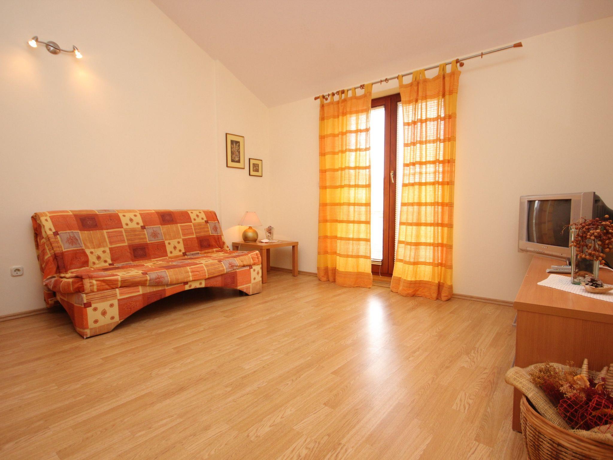 Ferienwohnung bietet Platz für 5 Gäste. Die Betten sind in Schlafzimmern, die es 2 gibt, und in Wohnzimmer, innerhalb einer Gesamtfläche von 49m2, angeordnet. Die Gäste haben eine eigene Terrasse zur Verfügung, auf der sie in warmen Sommernächten genießen können. Das Apartment bietet Meerblick. Es ist erlaubt, Speisen auf dem Gemeinschafts-Grill vorzubereiten. IM PREIS INBEGRIFFEN: Kurtaxe, Endreinigung, Klimatisierung, Parkplatz, Internet, Kinderbett. VERBINDLICHE ZUSÄTZLICHE KOSTEN: Aufzahlung für Kurzaufenthalte (prozentualer Zuschlag pro Nächtigungsanzahl: 30% - 1, 20% - 2, 10% - 3). Die Verfügbarkeit zusätzlicher Dienstleistungen in Ihrem reservierten Termin und die Preise derselben (falls nicht aufgeführt) müssen im Voraus überprüft werden. Zusätzliche Dienstleistungen die in der Zahlungsaufforderung nicht aufgeführt sind werden direkt beim Vermieter bezahlt, angenommen der Gast nutzt auch diese.