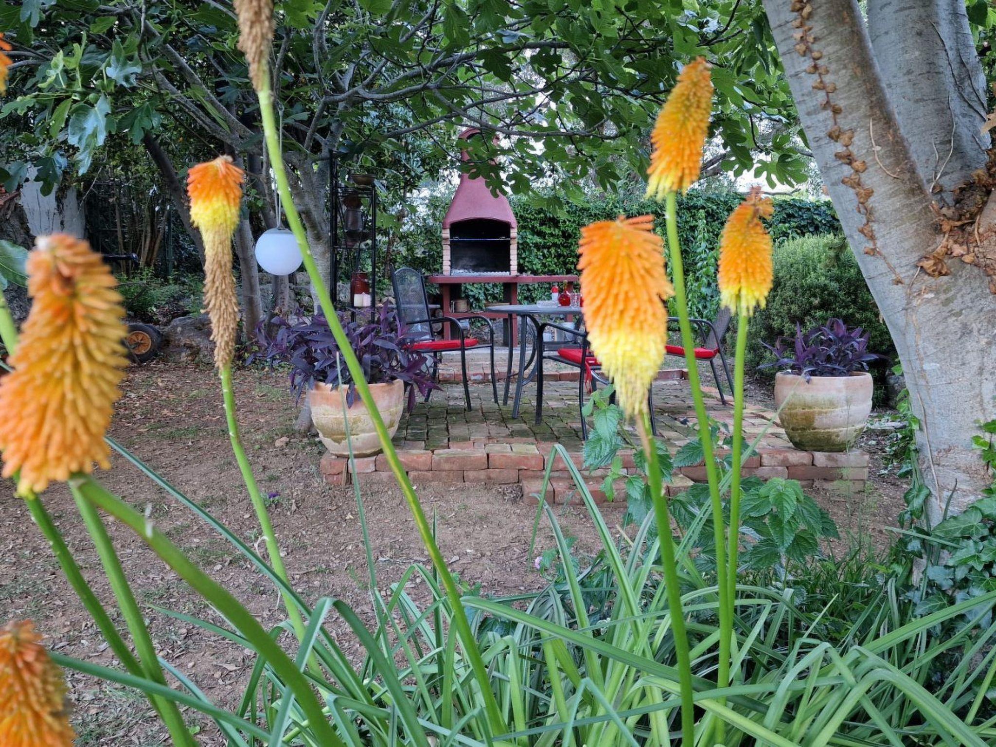 Um das Haus herum befindet sich ein 250 m² großer, gepflegter Garten mit einer schön angelegten, überdachten Terrasse mit Tisch, Stühlen und einem Whirlpool. Im hinteren Hof befindet sich ein gemauerter Grill. Direkt vor dem Haus sind öffentliche Parkplätze vorhanden. Das Grundstück ist mit einem Holztor an der Vorderseite und einem Zaun um den Garten herum eingezäunt und daher auch für Haustiere geeignet.