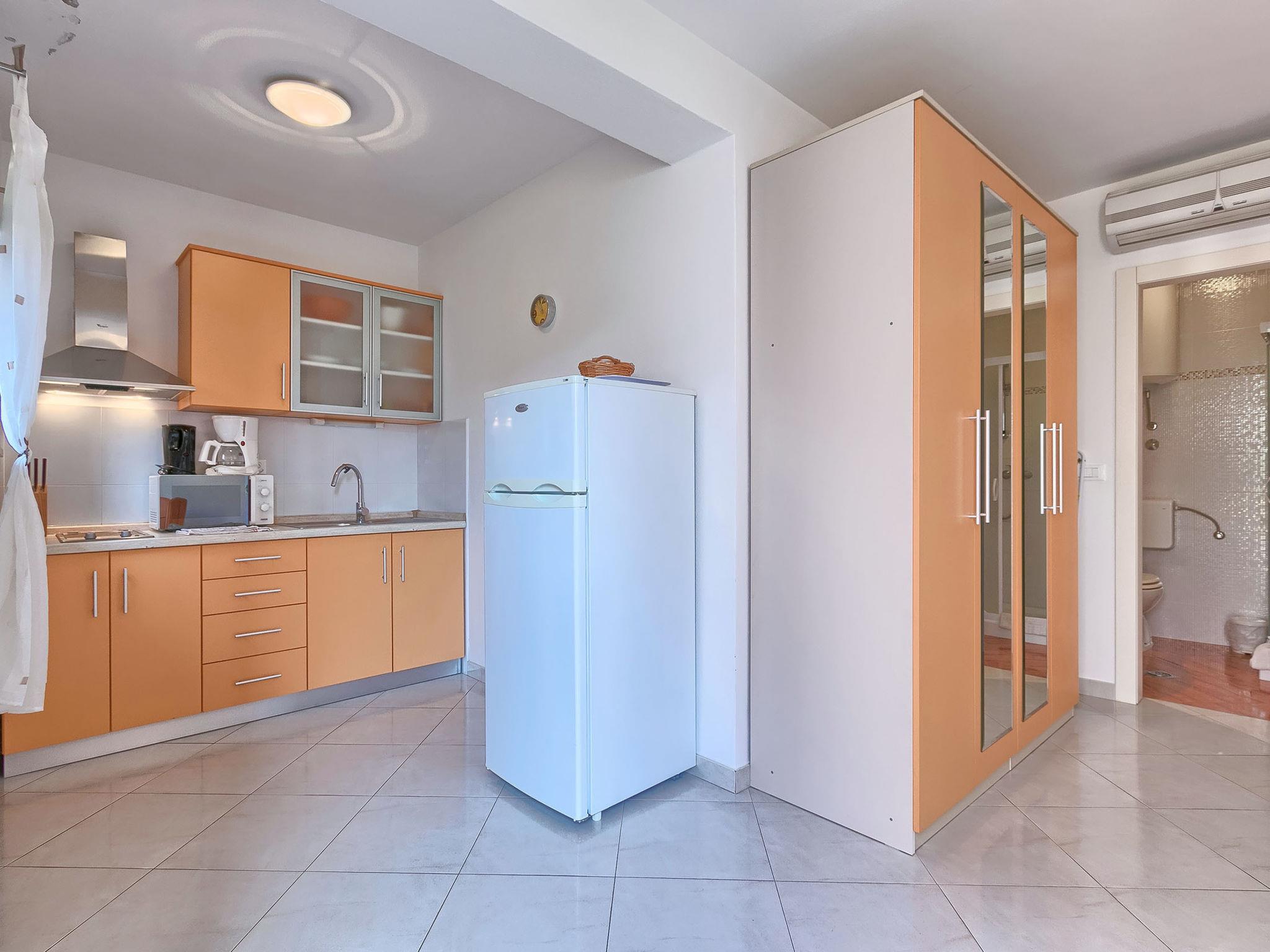 1-Zimmer-Wohnung 25 m2, im Erdgeschoss. Studio mit 1 franz. Bett (160 cm, Länge 200 cm), Sat-TV (Flachbildschirm), Klimaanlage. Ausgang zur Terrasse. Offene Küche (2 Glaskeramikplatten, Mikrowelle, Tiefkühler) mit Esstisch. Dusche/WC. Terrasse 8 m2. Terrassenmöbel. Sicht auf den Garten. Zur Verfügung: Safe. Internet (Wireless LAN, gratis).