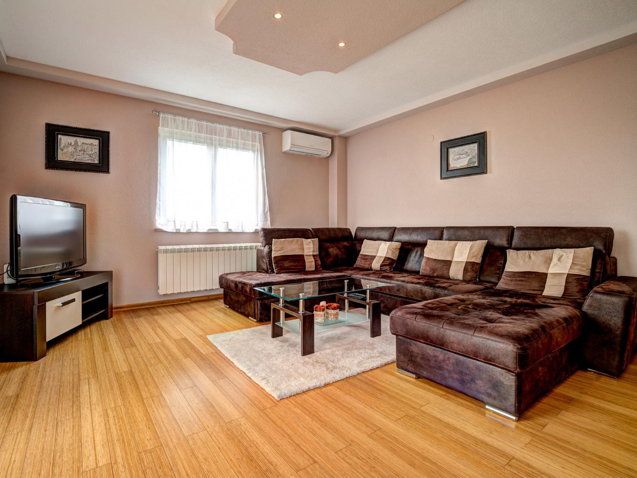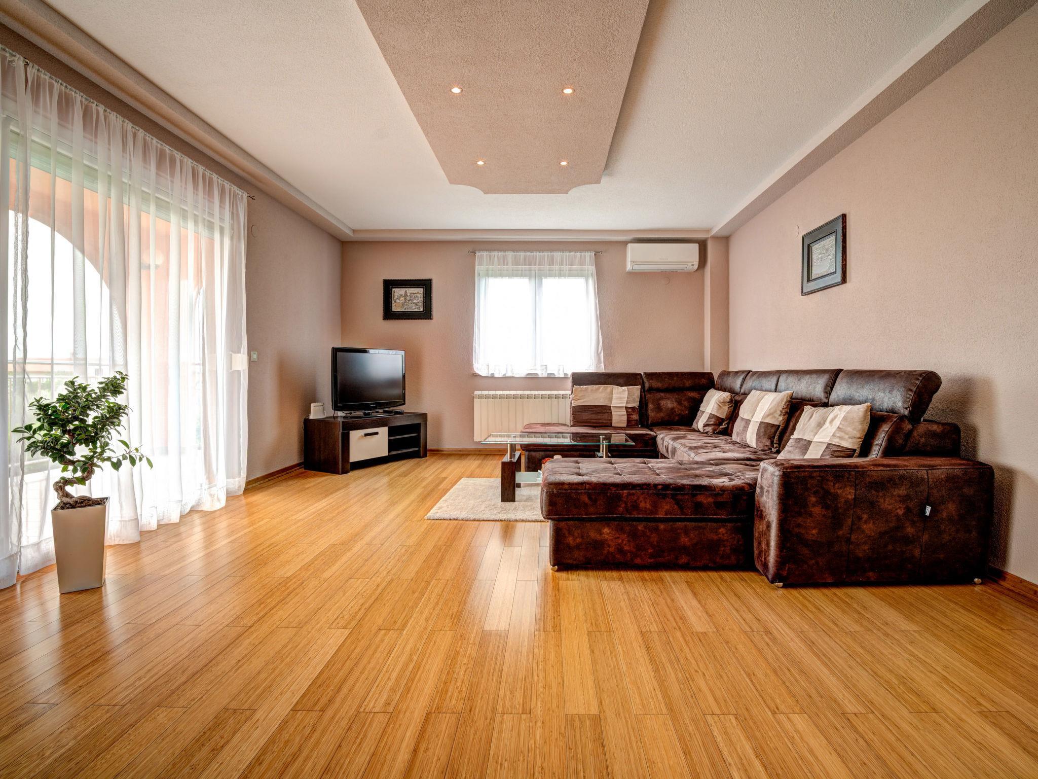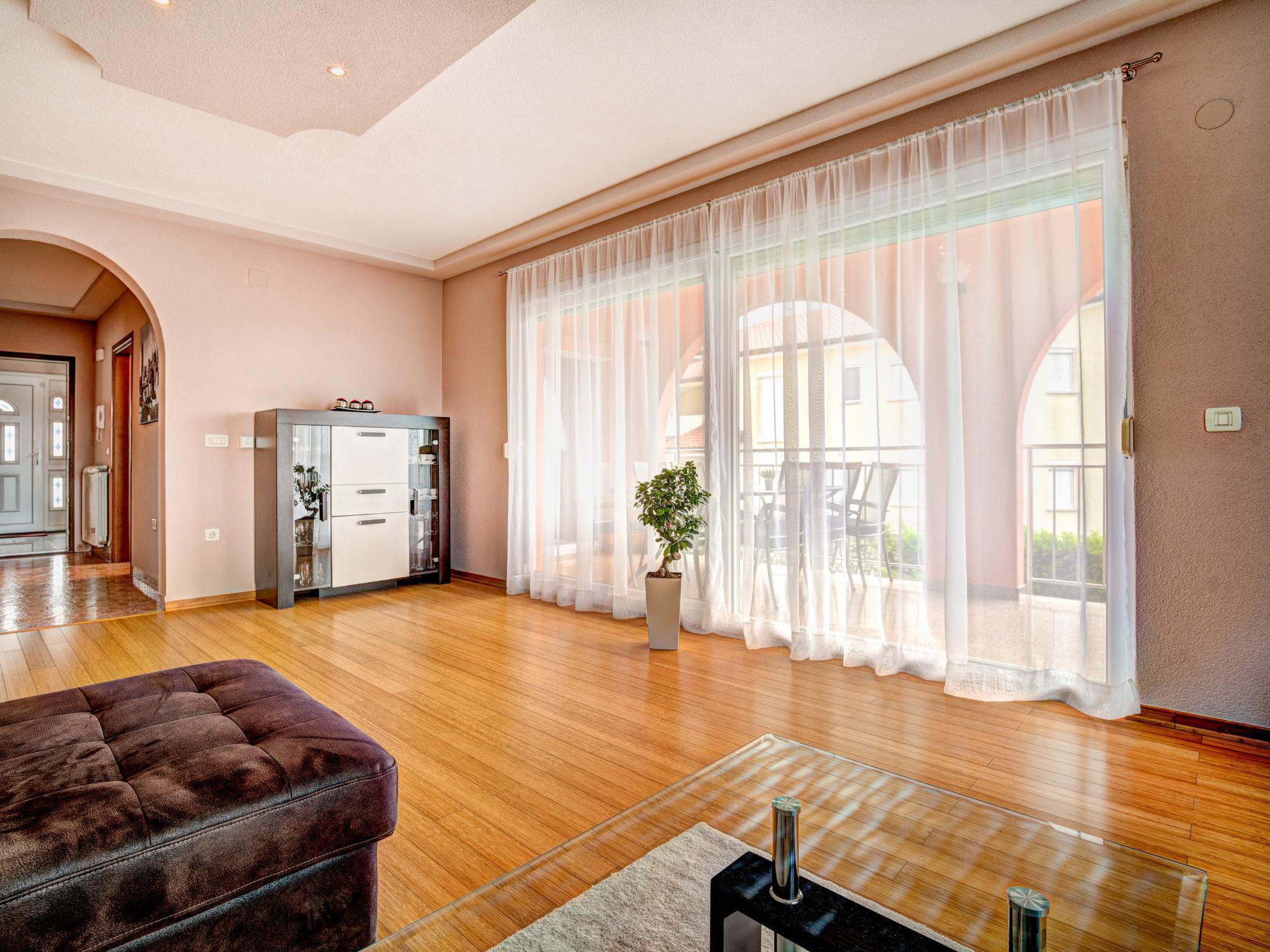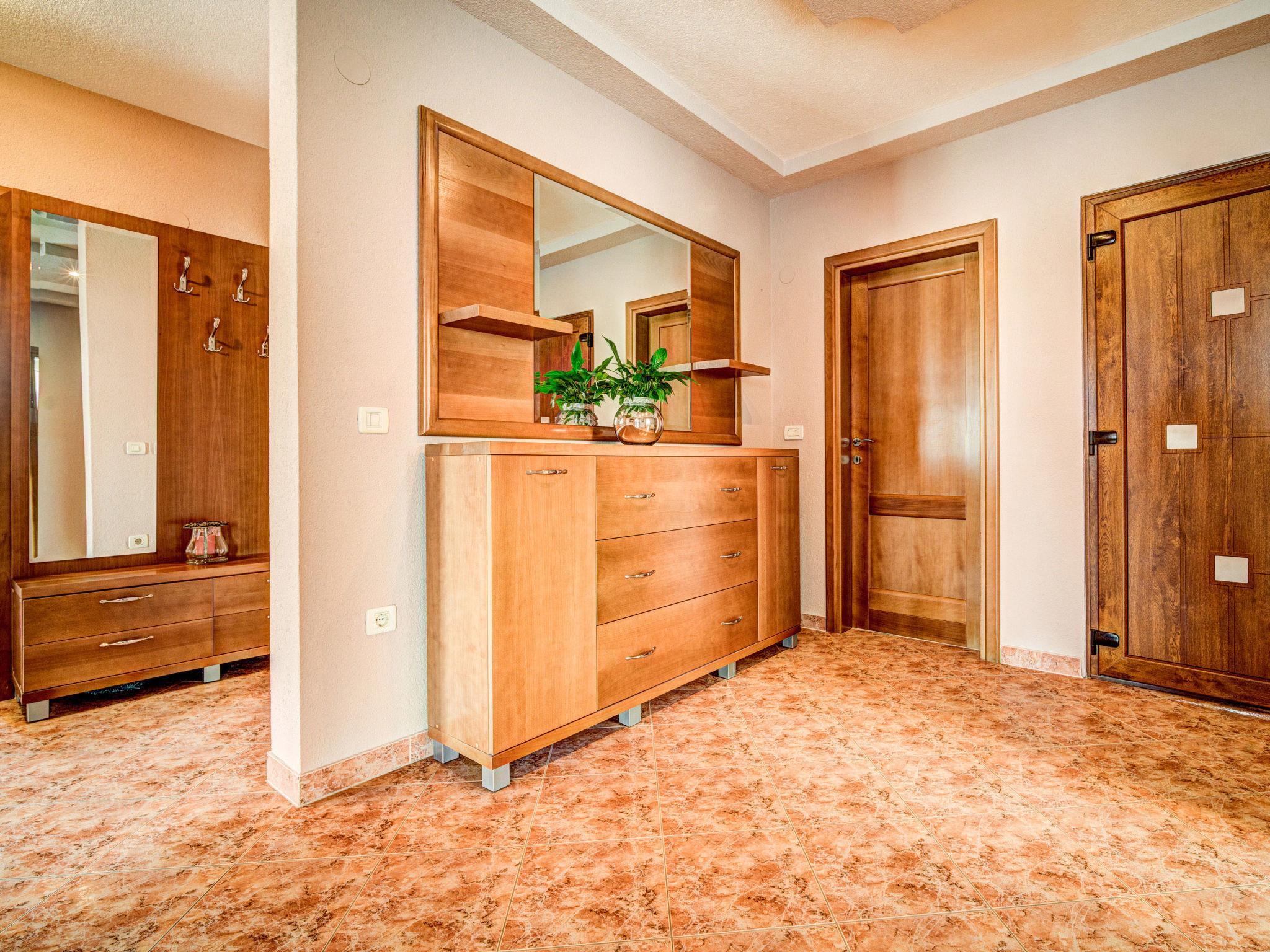3-Zimmer-Wohnung 130 m2, im erhöhten Erdgeschoss. Schön und geschmackvoll eingerichtet: Wohnzimmer mit Sat-TV (Flachbildschirm), Klimaanlage. Ausgang zur Terrasse. 2 Zimmer, jedes Zimmer mit 1 Doppelbett (2 x 90 cm, Länge 200 cm). Ausgang zur Terrasse. Esszimmer. Ausgang zur Terrasse. Offene Küche (Backofen, Geschirrspüler, 4 Glaskeramikplatten, Mikrowelle, Tiefkühler, elektrische Kaffeemaschine). Sep. WC, Bad/Dusche/Bidet/WC, Doppelwaschbecken, Whirlbadewanne. Heizung (extra). Terrasse 25 m2, überdacht, Terrasse 16 m2, überdacht. Terrassenmöbel. Eingeschränkte Fernsicht auf das Meer. Zur Verfügung: Internet (Wireless LAN, gratis). Bitte beachten: Feuerlöscher.