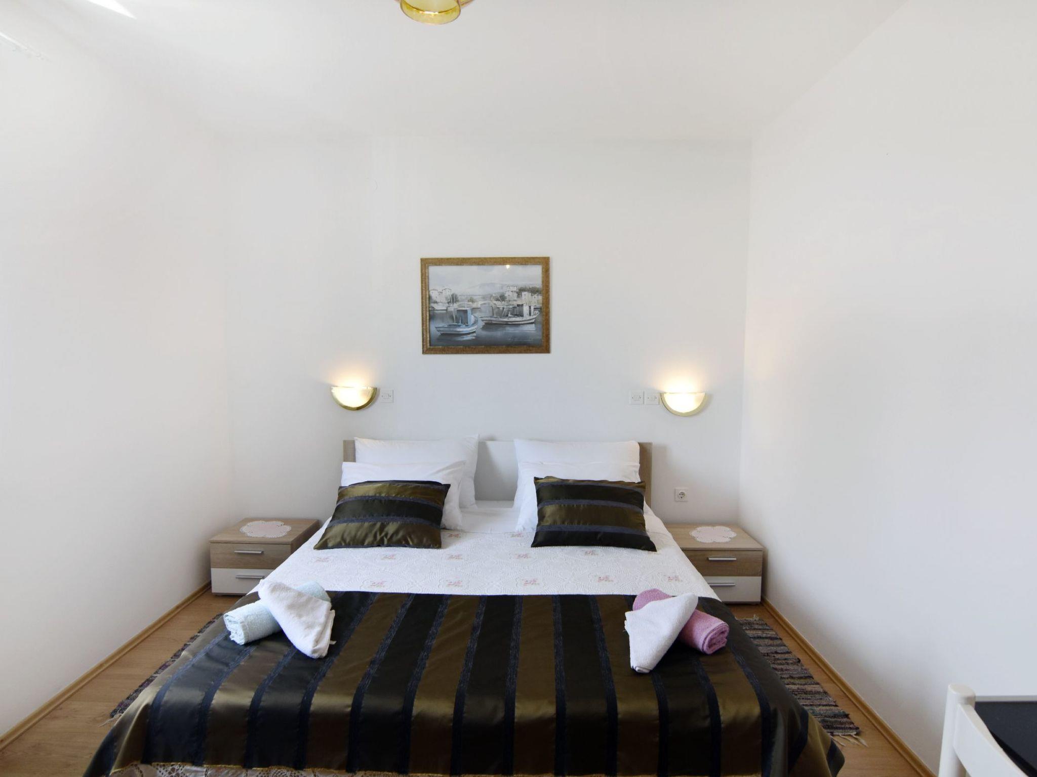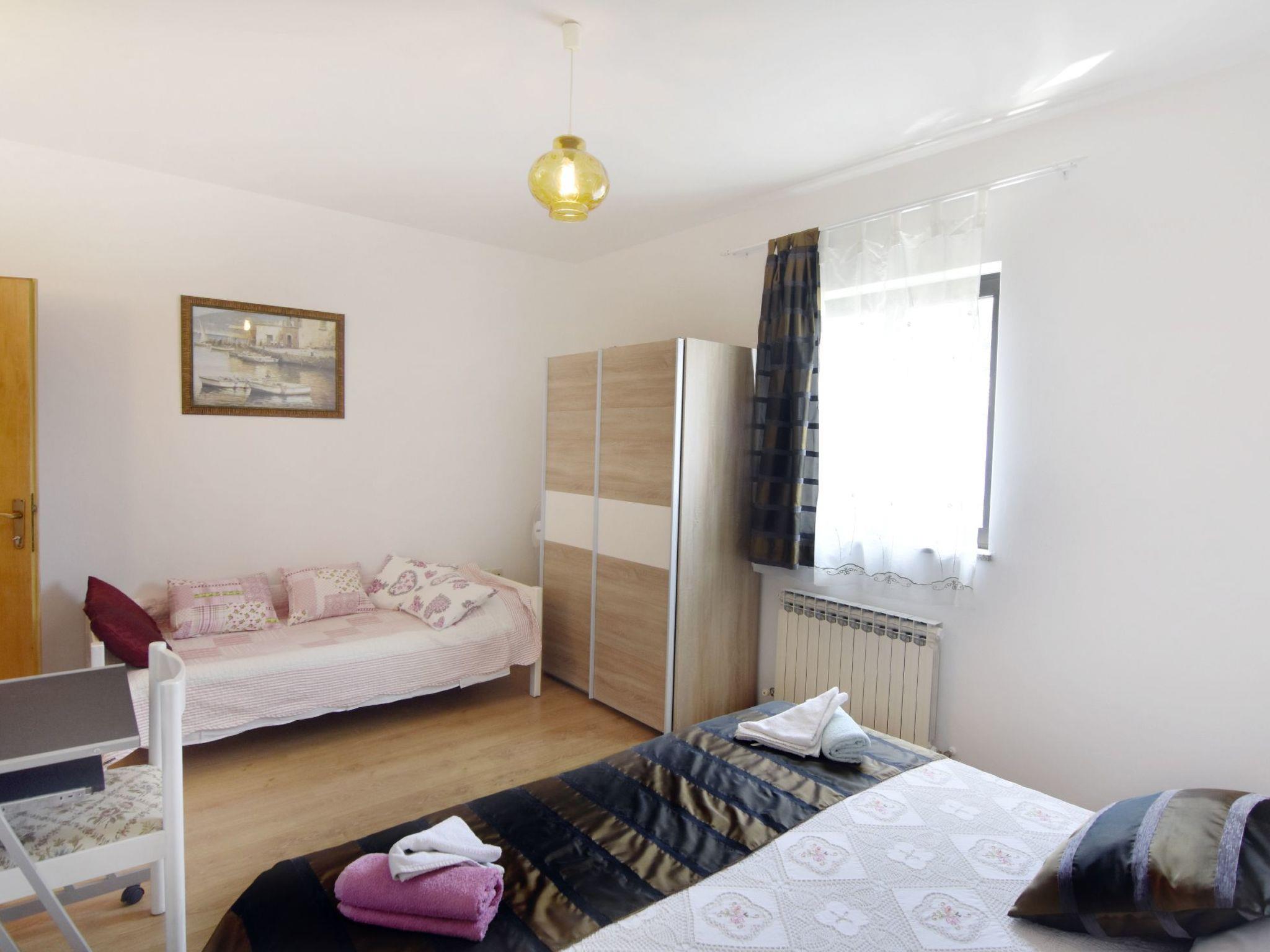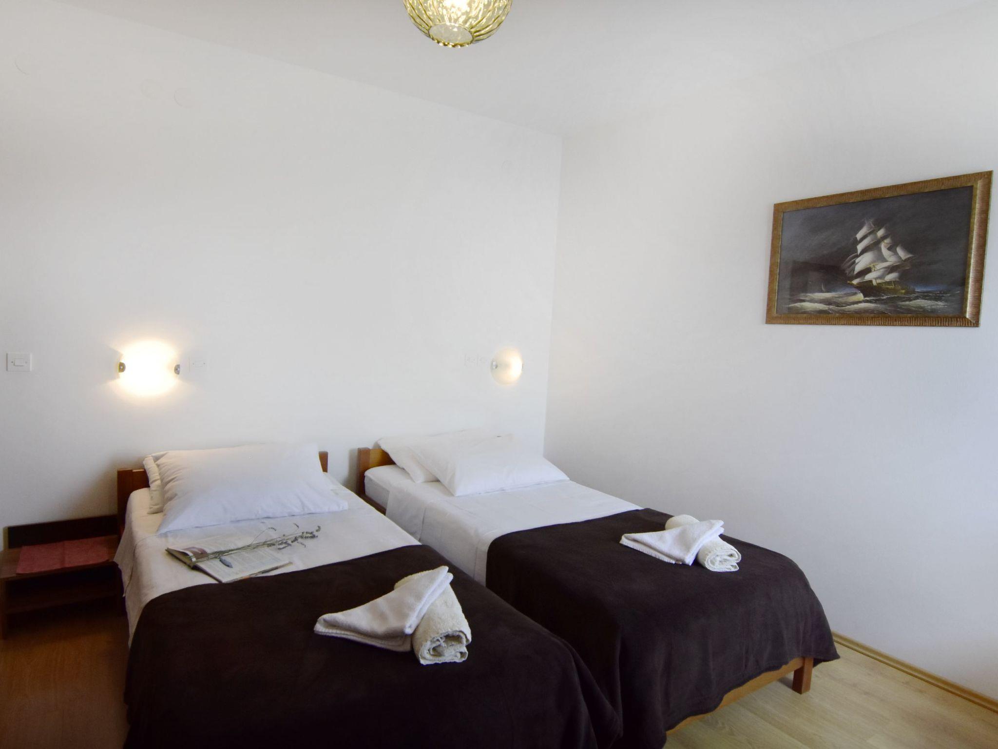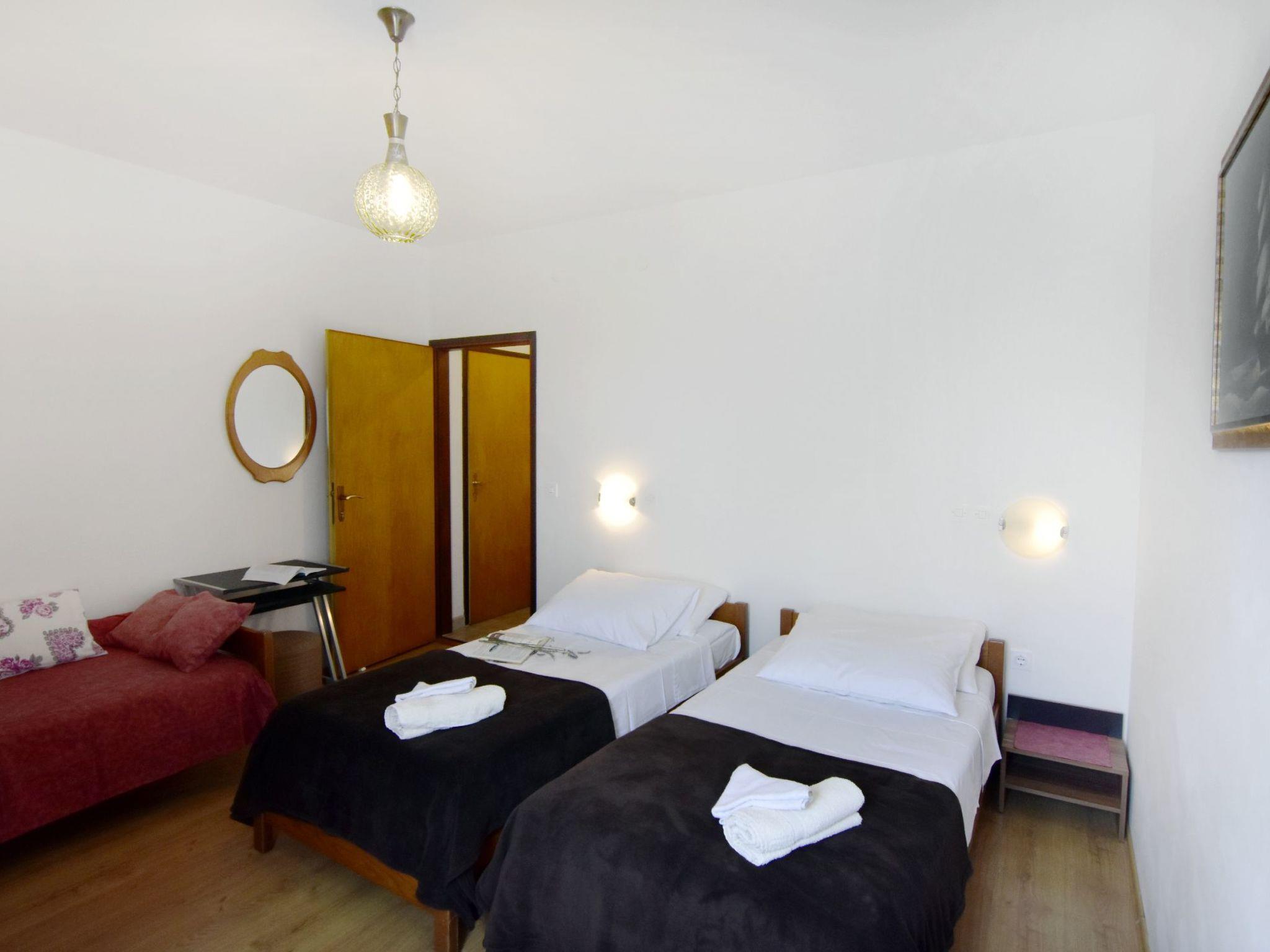 Innen bietet die Wohnung eine schlichte und komfortable Einrichtung mit drei einladenden Schlafzimmern, die für erholsamen Schlaf sorgen. Das erste Schlafzimmer ist mit einem Doppel- und einem Einzelbett ausgestattet, das zweite bietet drei Einzelbetten, und im letzten Zimmer finden sich zwei weitere Einzelbetten, wobei die Bettwäsche inbegriffen ist. Zusätzlich verfügt die Wohnung über zwei Badezimmer, einschließlich moderner Annehmlichkeiten wie Duschkabinen, Waschmaschine und Haartrockner, wobei für jede Person zwei Handtücher vorhanden sind.