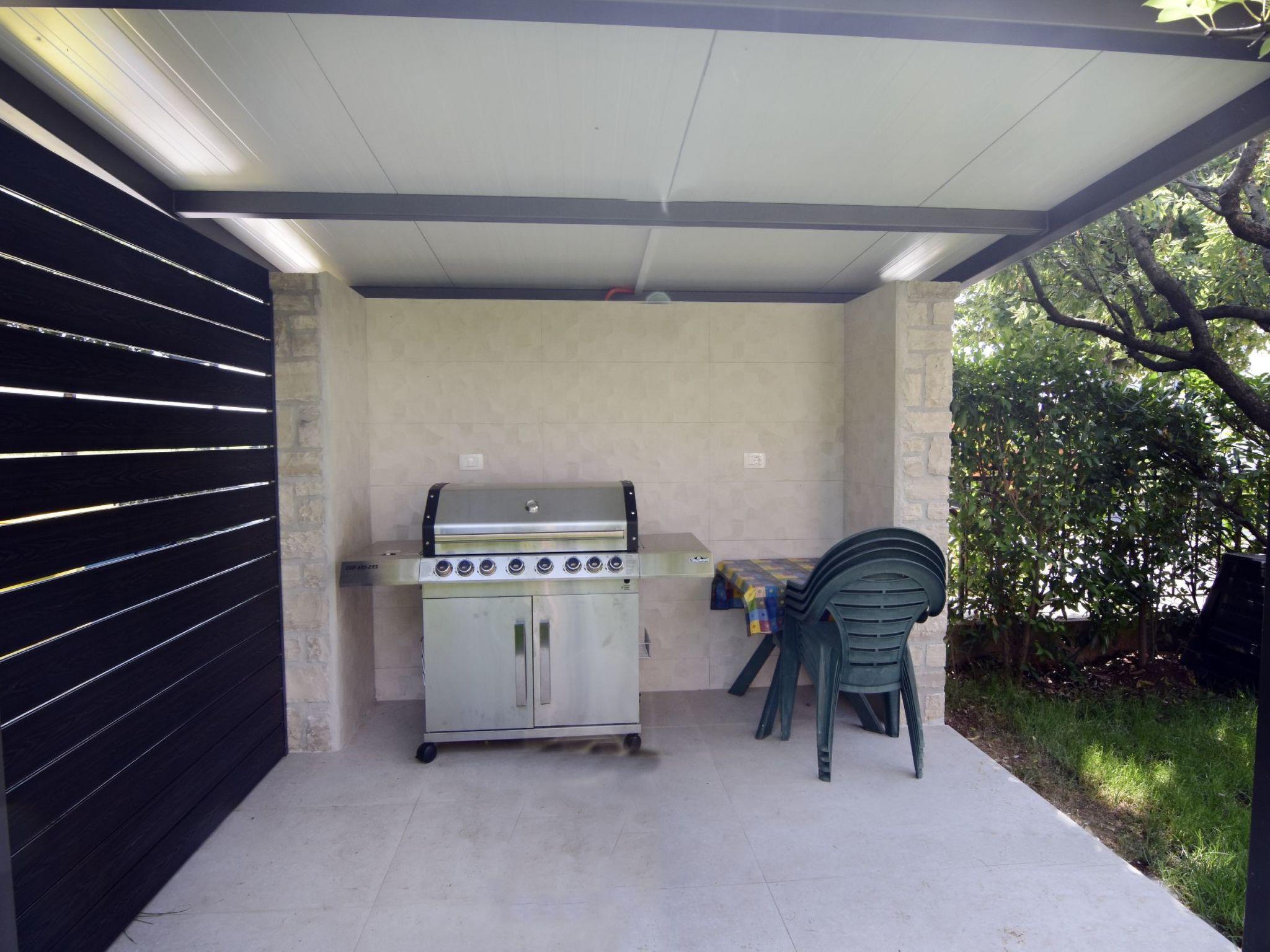 Die Küche ist komplett ausgestattet mit einem 3-Flammen-Gasherd und einer Elektroplatte, Kühlschrank mit Gefrierfach, Mikrowelle, Filterkaffeemaschine, Wasserkocher, Toaster und Küchenutensilien. Im Essbereich finden Sie einen Tisch und 8 Stühle, eine Klimaanlage, einen Flachbild-Sat-TV sowie kostenlosen WLAN-Zugang zur überdachten Terrasse mit Tisch und Stühlen.