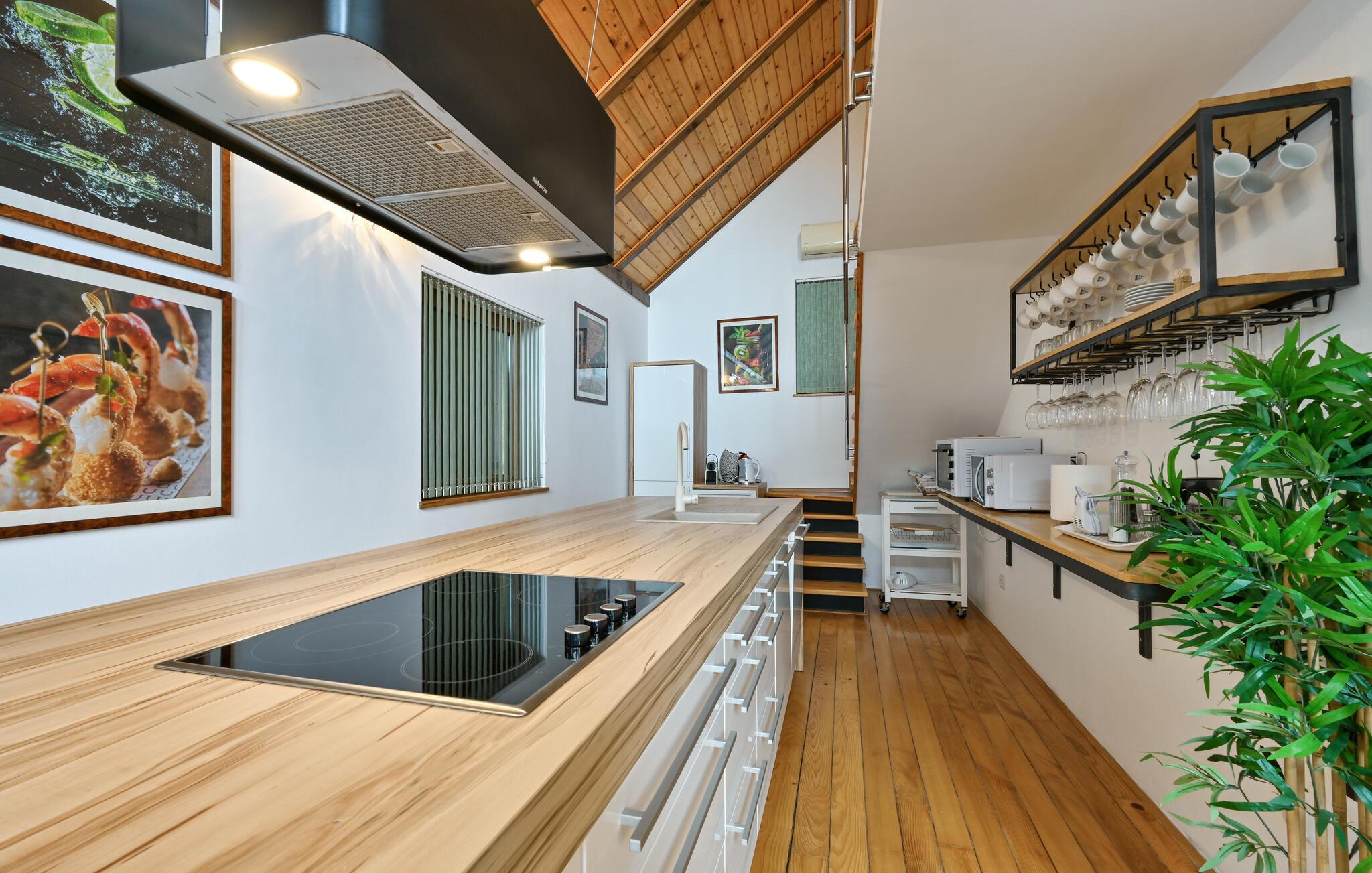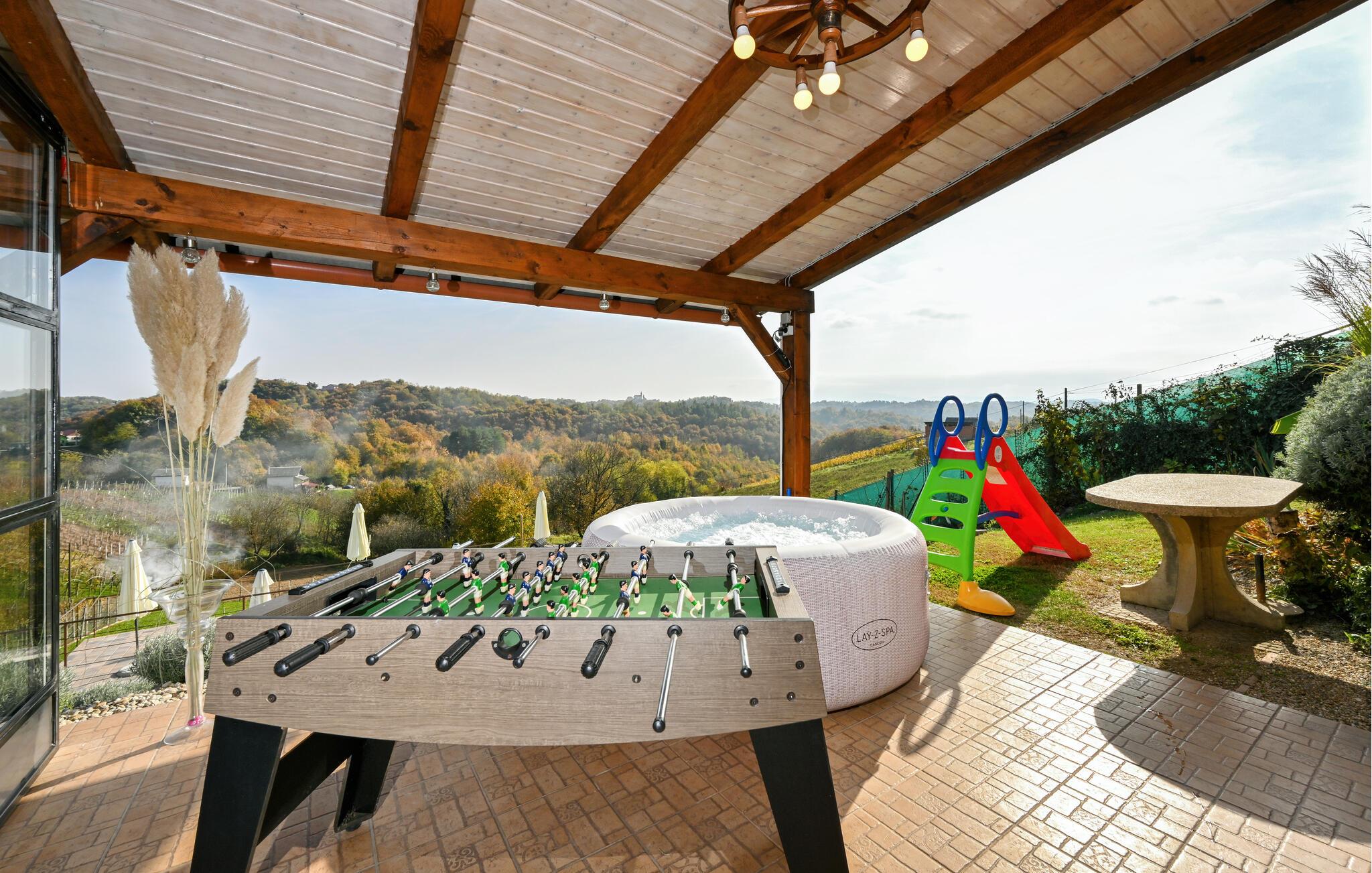 Dieses großartige Haus bietet Ihnen und Ihrer Familie ein luxuriöses Urlaubserlebnis auf mehreren Etagen. Der elegante Wohnbereich mit hoher Decke und stilvoller Einrichtung schafft ein lichtdurchflutetes, einladendes Ambiente. Durch die großen Fensterfronten genießen Sie den wunderschönen Ausblick auf die Natur. Erleben Sie pure Entspannung im eigenen Pool, der Sauna oder der Hydromassage. Auf der großzügigen Terrasse mit Spielgeräten können Sie zusammen kochen und Ihre Mahlzeiten in der voll ausgestatteten Sommerküche oder am Grill zubereiten.