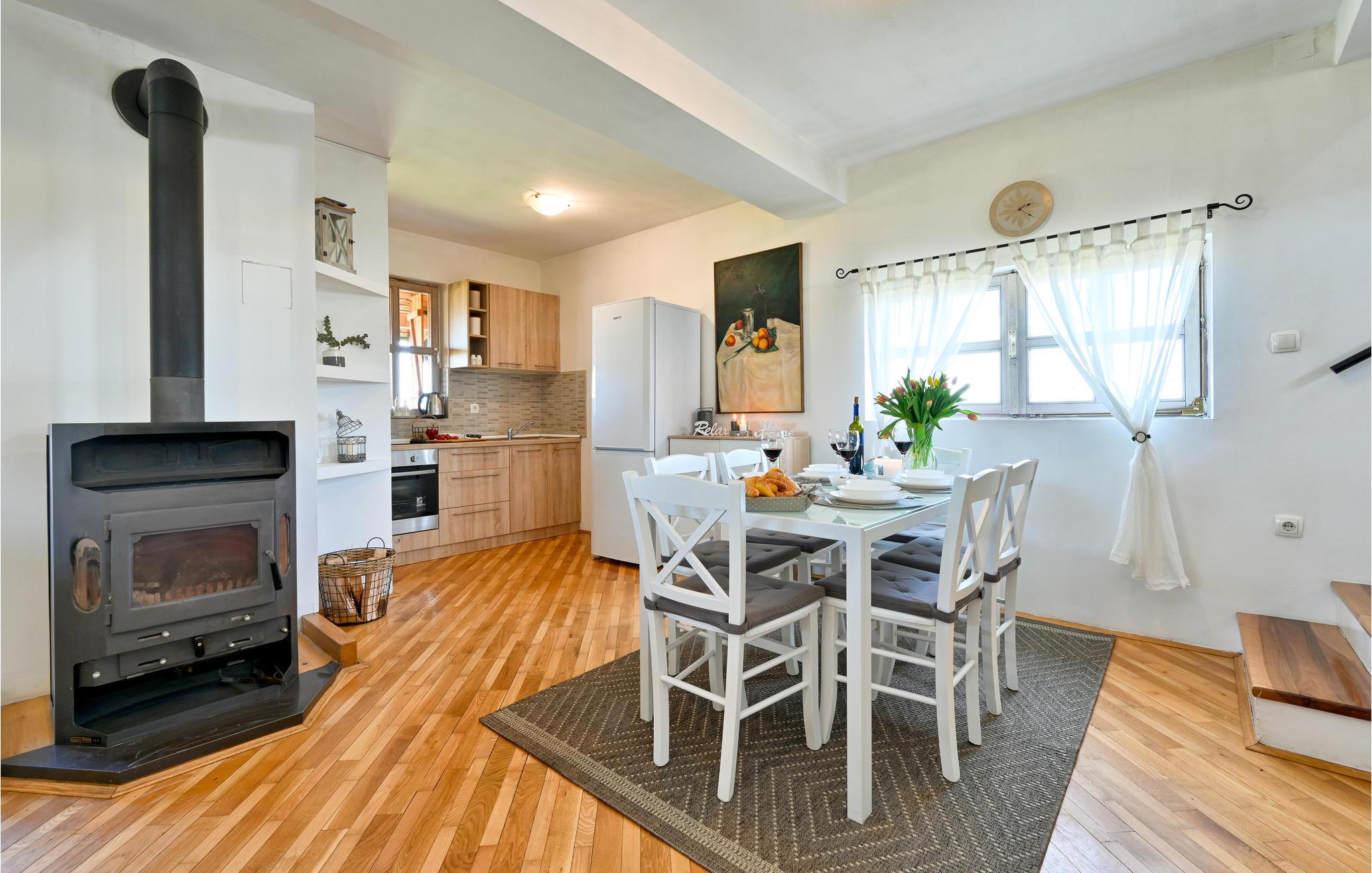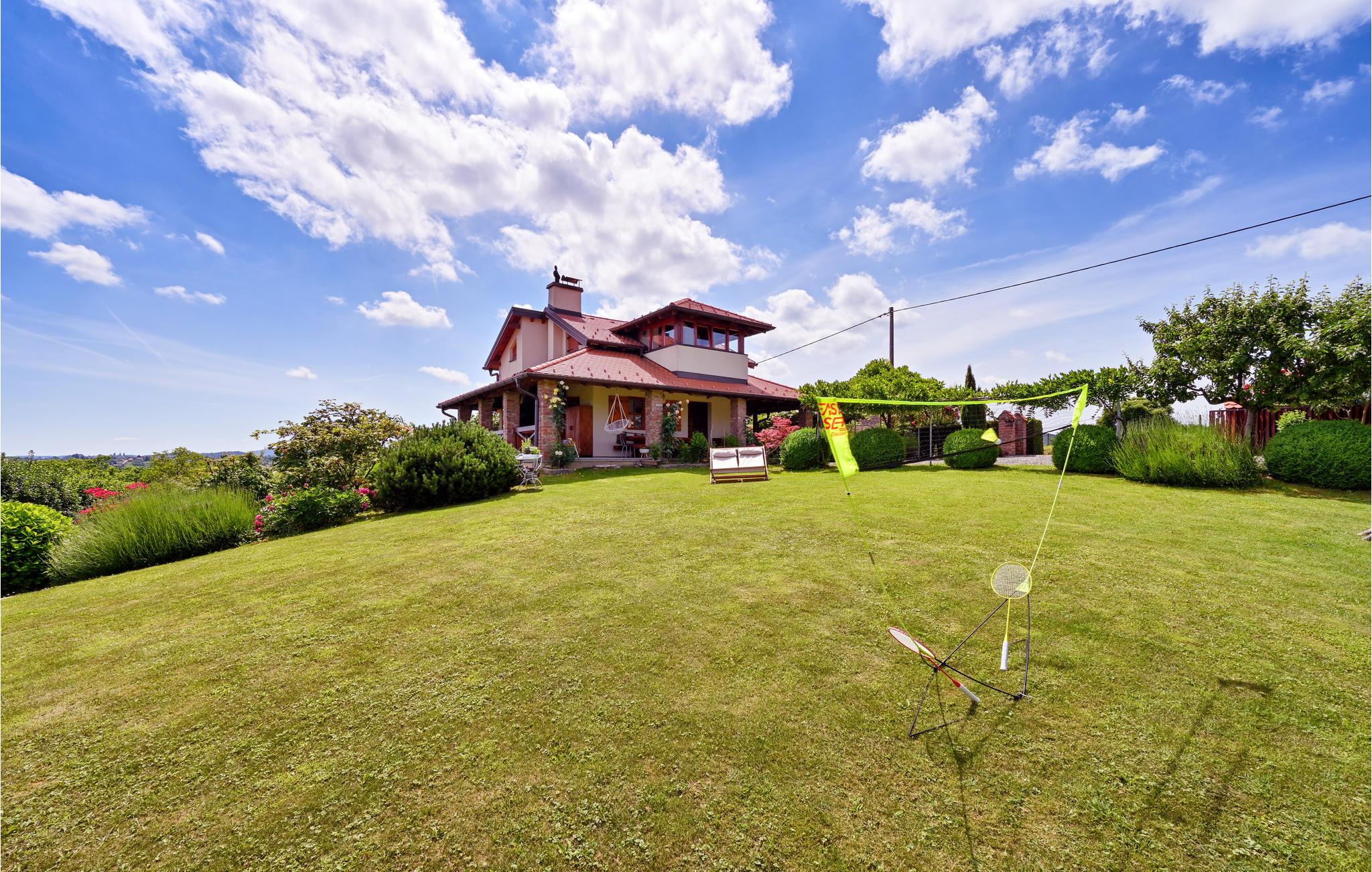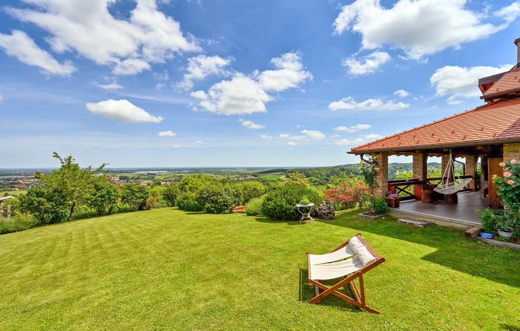 Nicht weit von Varaždin, auf einem kleinen Hügel, liegt dieses schöne Ferienhaus mit schöner Aussicht und einem schönen Garten mit Obstgarten. Verbringen Sie einen entspannten und ruhigen Urlaub in diesem schönen Haus, das für den Aufenthalt mit Kindern und Haustieren geeignet ist. Des Weiteren ist diese Unterkunft mit allem ausgestattet, was Sie für einen entspannten Aufenthalt benötigen. Im Innenraum erwartet Sie eine Mischung aus rustikalem und modernem Design, wobei vor allem beim Komfort nicht gespart wurde. Hier können Sie entspannte Abende beim Kamin verbringen oder auf den überdachten Balkon im ersten Stock zum Kartenspielen oder Frühstücken, während Sie Ihren Blick über die Landschaft schweifen lassen. Im Erdgeschoss finden Sie auch eine überdachte jedoch offene Terrasse mit Außenküche und Grill. Des Weiteren gibt es auf dem eingezäunten Grundstück auch Aktivitäten für die jungen Gäste, darunter ein Klettergerüst, ein Trampolin, Fußballtore und für die ganze Familie zusammen ein Badminton- und Volleyballnetz.
