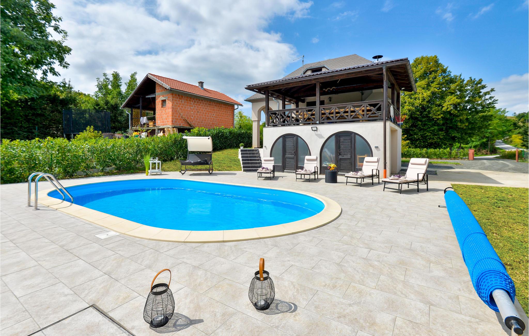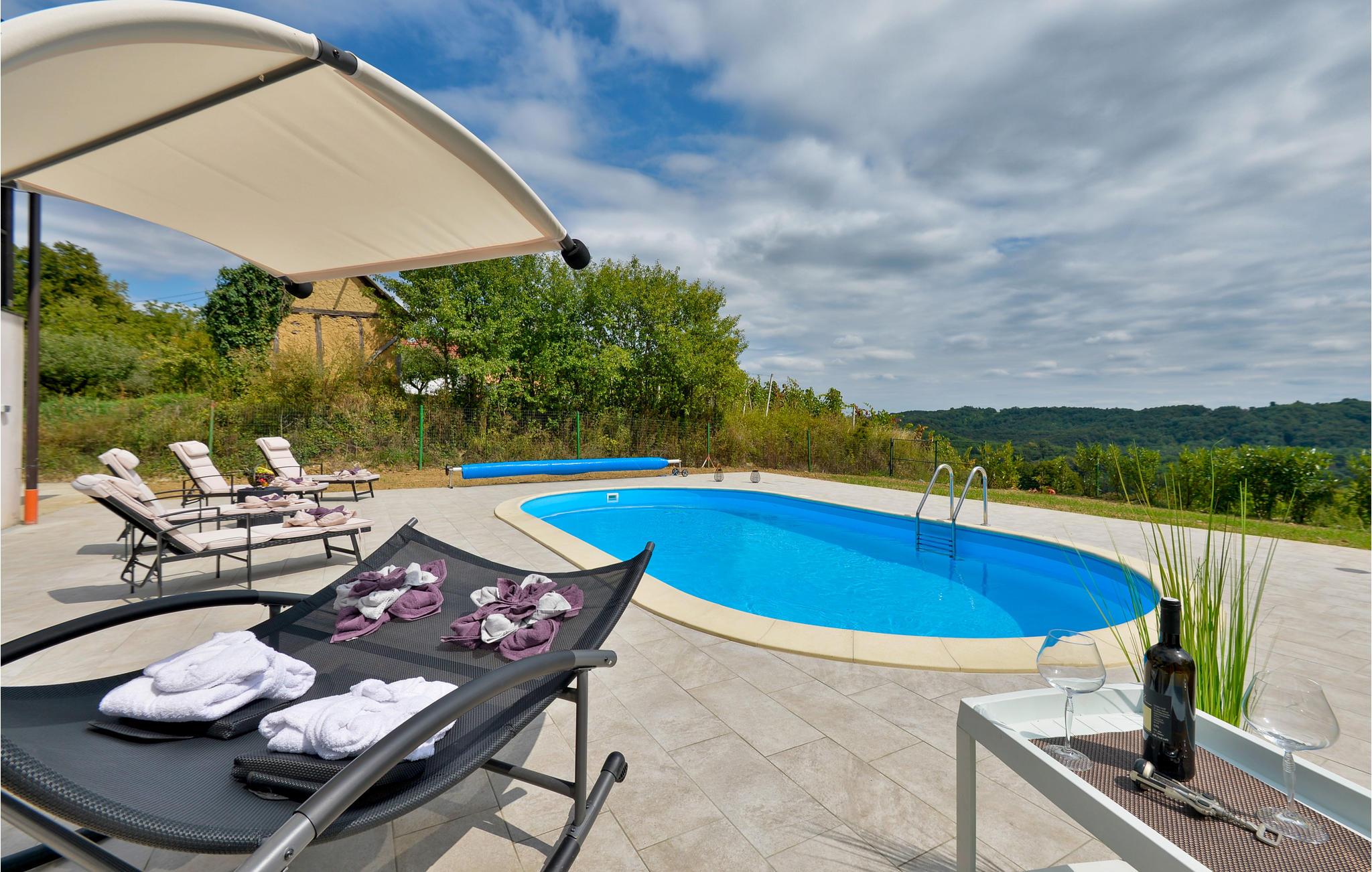 Genießen Sie das Leben im Freien und die lauen Sommerabende auf der offenen Terrasse bei Spezialitäten vom Grill und erfrischen Sie sich im Pool, wann immer Ihnen danach ist. Für Ihre Kinder gibt es ein Trampolin und andere Spielgeräte. Lassen Sie den Blick über die grünen Hügel und in die Ferne schweifen, die Aussicht von hier ist wundervoll.