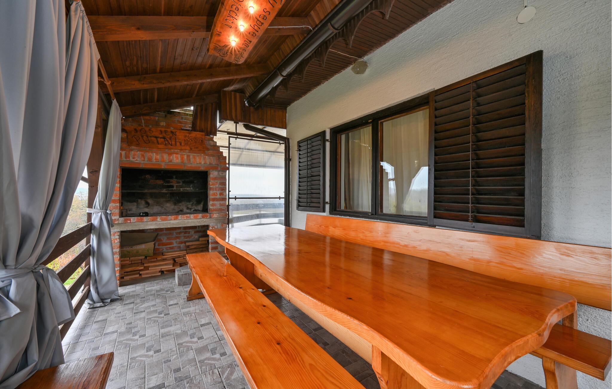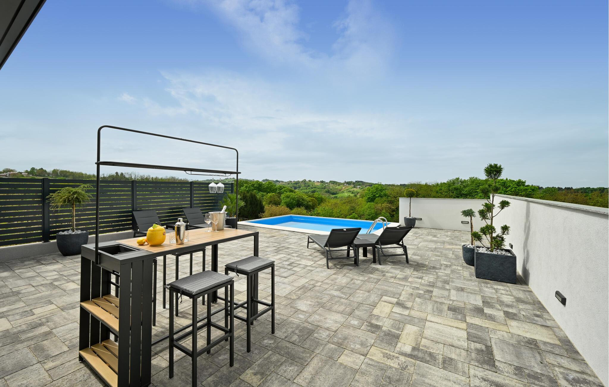 Starten Sie den Tag mit einem ausgiebigen Frühstück unter freiem Himmel. Schließen Sie die Augen und genießen Sie das beruhigende Rauschen der Bäume, während Sie auf einer der bequemen Sonnenliegen die Seele baumeln lassen. Erfrischen Sie sich im Pool und schweifen Sie mit Ihrem Blick über die idyllische Landschaft. Am Abend laden die überdachte Terrasse und der Grillbereich zu geselligen Stunden ein.