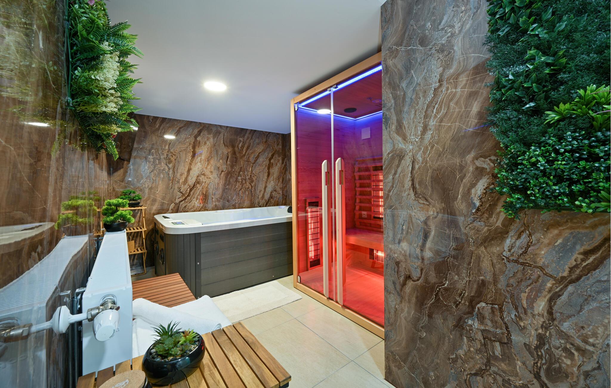 Dieses mit allen Annehmlichkeiten ausgestattete Ferienhaus in ruhiger Lage verspricht pure Erholung. Lassen Sie Ihrer Kreativität in der großzügigen Küche freien Lauf und zaubern Sie gemeinsam kulinarische Highlights. Genießen Sie gesellige Abende am Esstisch oder am Kamin und verwöhnen Sie sich danach mit einem Saunagang oder einem entspannenden Bad im Whirlpool.