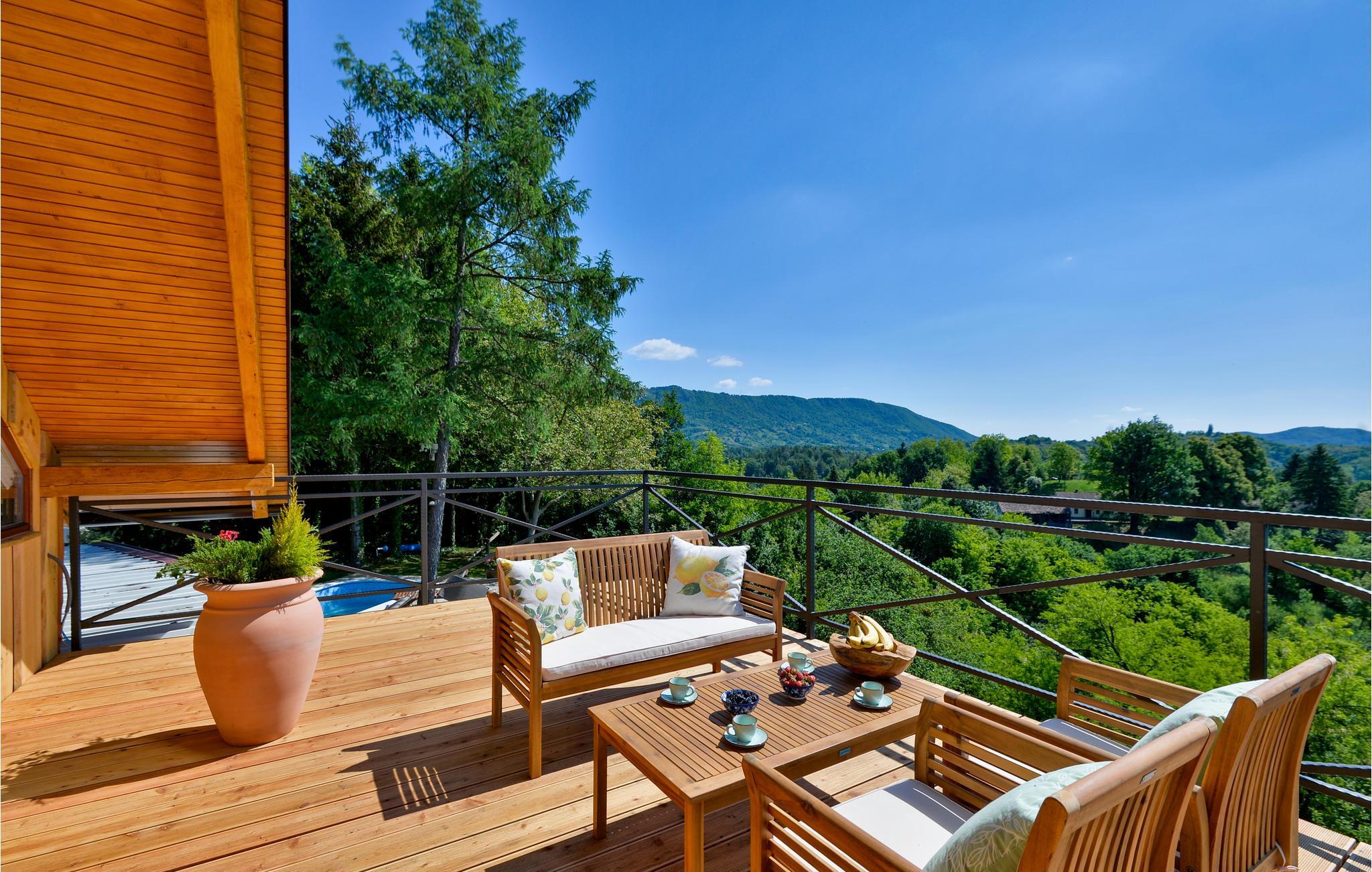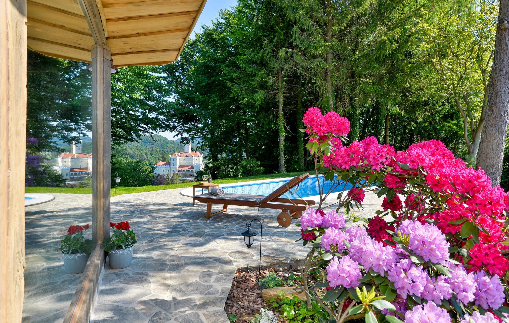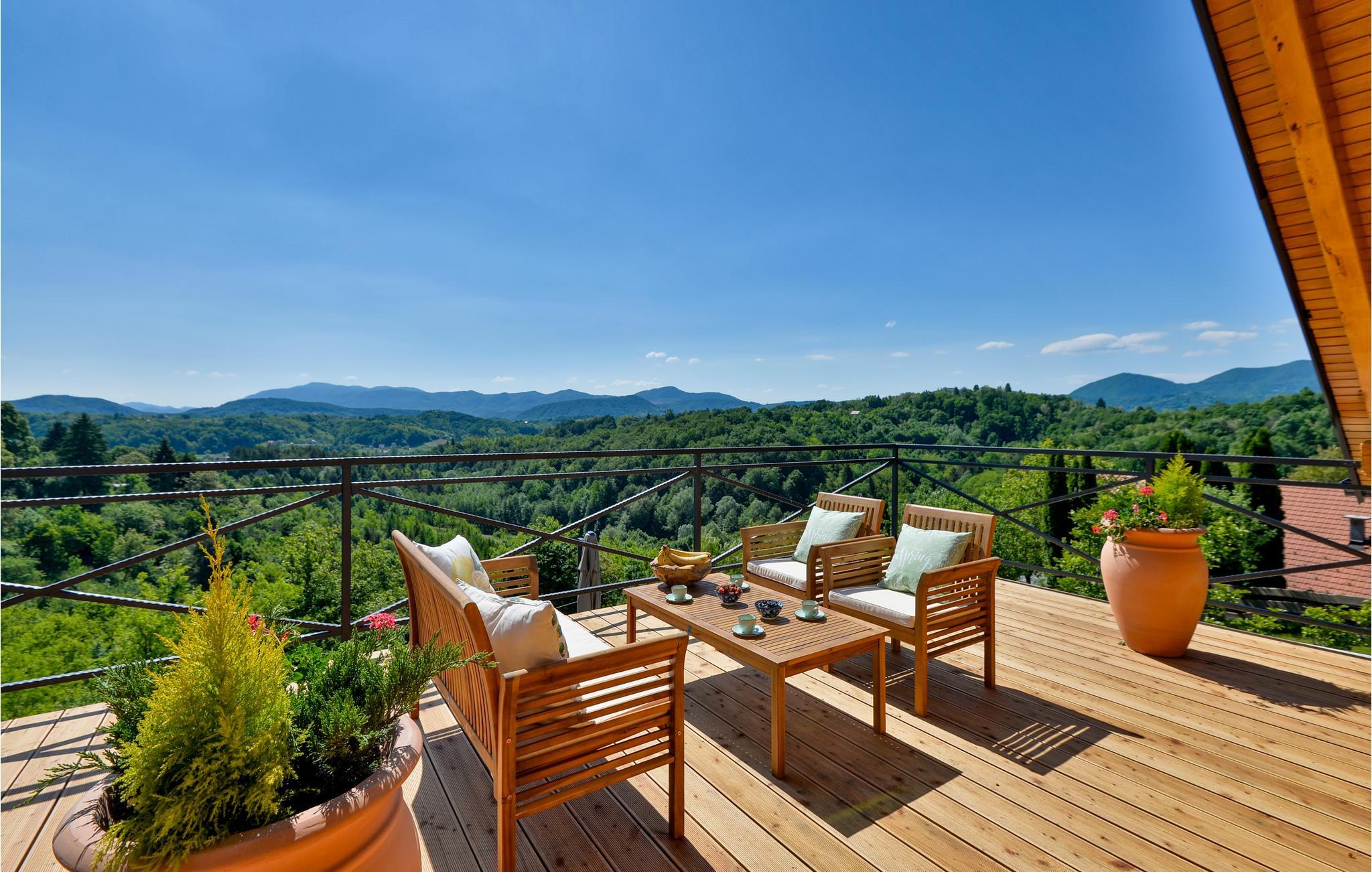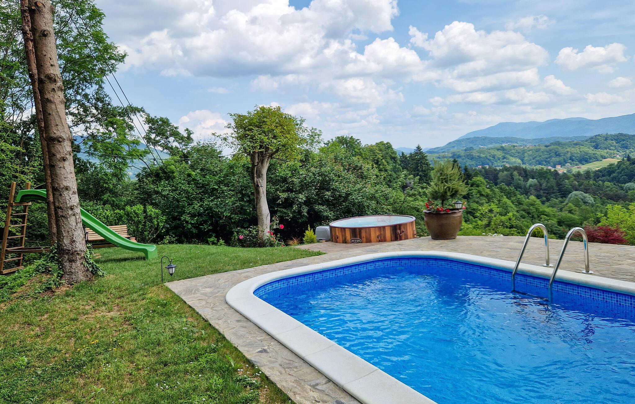 Auf einem Hügel neben dem Schloss Trakošcan erwartet Sie dieses schöne Ferienhaus mit Pool und Indoor-Wellnessbereich. Das Haus für 5 Personen besticht durch seine erhöhte Lage, von der sich eine herrliche Aussicht auf das nahe gelegene Schloss und den Waldpark bietet. Dadurch ist es ein ideales Reiseziel für naturliebende Familien. Der Wellnessbereich mit Whirlpool und Sauna befindet sich im Erdgeschoss, was dieses Haus auch im Winter interessant macht, während der Außenpool im Sommer für Erfrischung sorgt. Es gibt ein Wohnzimmer mit Küche und Essbereich sowie ein Badezimmer im Erdgeschoss. Zwei Schlafzimmer, eine Toilette und eine Terrasse mit Landschaftsblick erwarten Sie im Obergeschoss. Ein Schlafzimmer hat die Mindestdeckenhöhe von ca. 120 cm.