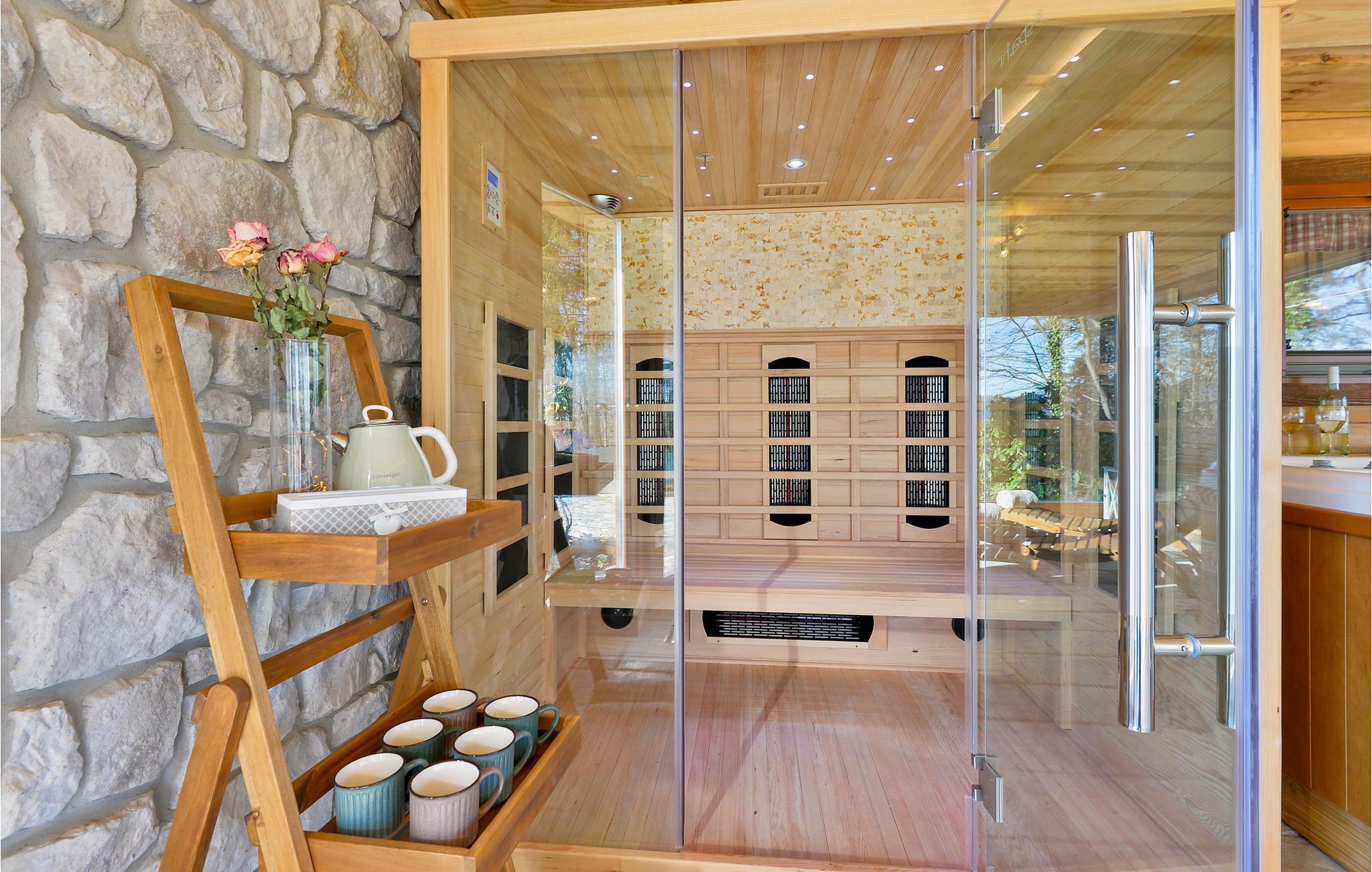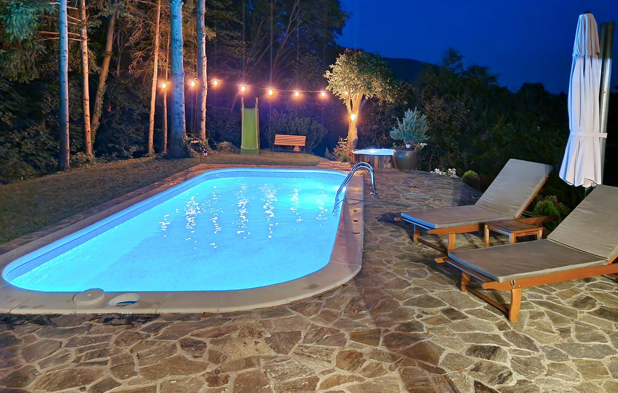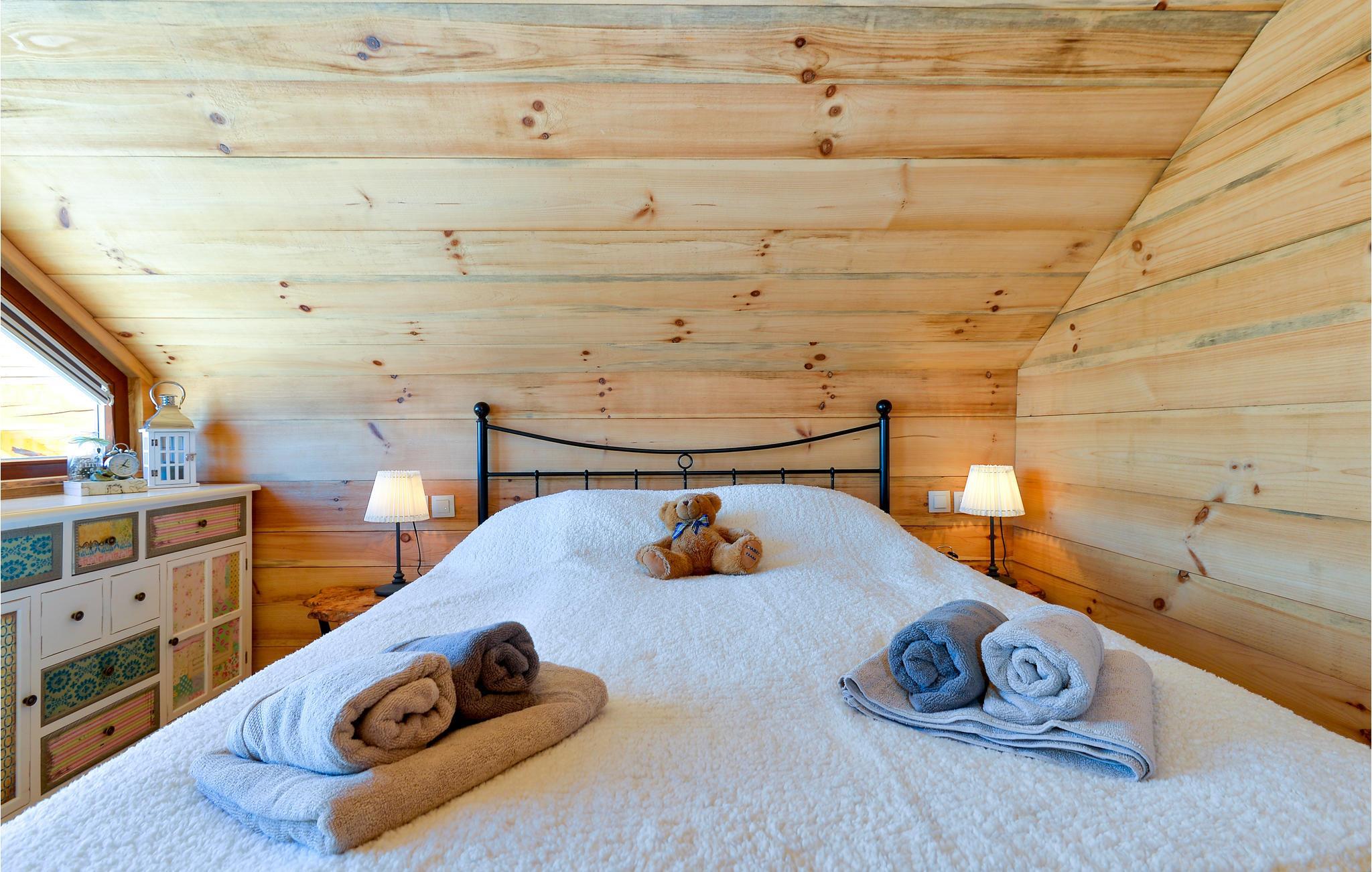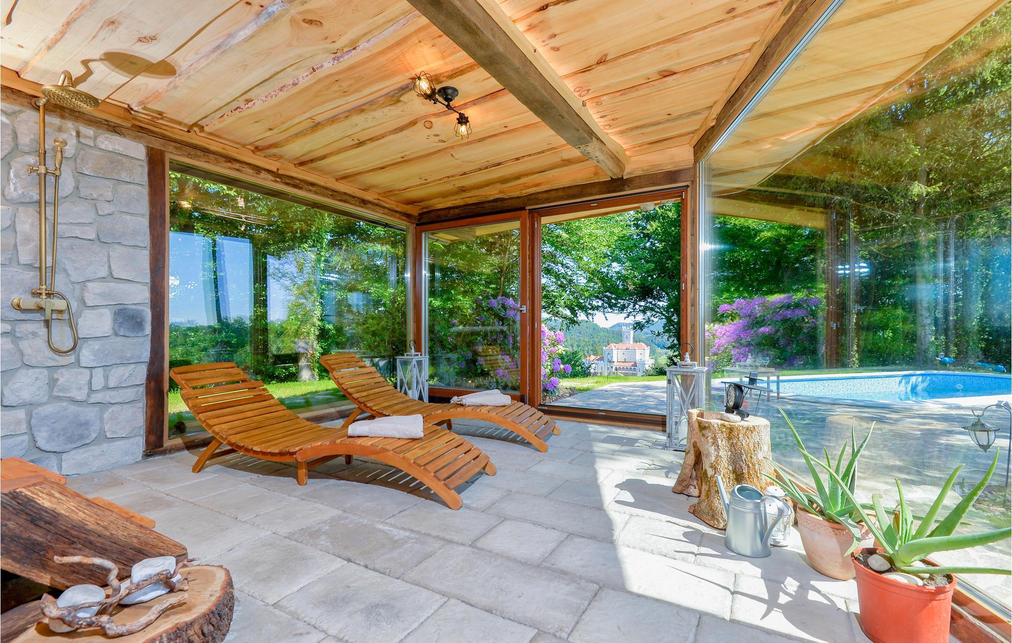 Auf einem Hügel neben dem Schloss Trakošcan erwartet Sie dieses schöne Ferienhaus mit Pool und Indoor-Wellnessbereich. Das Haus für 5 Personen besticht durch seine erhöhte Lage, von der sich eine herrliche Aussicht auf das nahe gelegene Schloss und den Waldpark bietet. Dadurch ist es ein ideales Reiseziel für naturliebende Familien. Der Wellnessbereich mit Whirlpool und Sauna befindet sich im Erdgeschoss, was dieses Haus auch im Winter interessant macht, während der Außenpool im Sommer für Erfrischung sorgt. Es gibt ein Wohnzimmer mit Küche und Essbereich sowie ein Badezimmer im Erdgeschoss. Zwei Schlafzimmer, eine Toilette und eine Terrasse mit Landschaftsblick erwarten Sie im Obergeschoss. Ein Schlafzimmer hat die Mindestdeckenhöhe von ca. 120 cm.