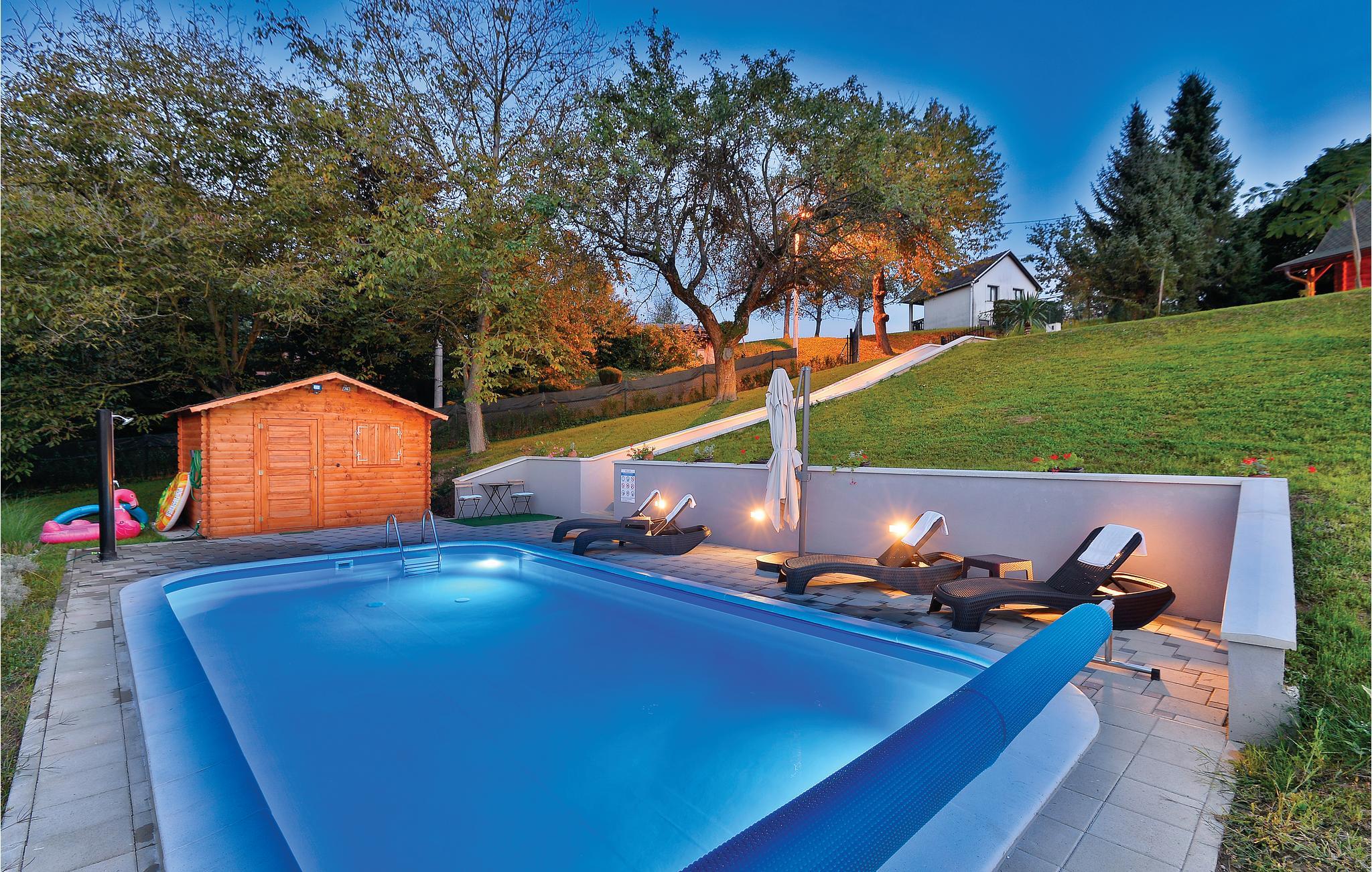 Etwas abseits von Varazdinske Toplice befindet sich dieses sorgfältig eingerichtete Ferienhaus aus Holz. Auf dem großen Grundstück befindet sich der Pool, der über einen Wasser-Geysir und eine UV-Wasseraufbereitung verfügt Sie finden hier ein reichhaltiges Spielangebot für Kinder und eine Terrasse vor, , auf der Sie im Schatten entspannen können. Das Innere des Hauses ist schön und modern eingerichtet und das Haus selbst ist mit allen Annehmlichkeiten ausgestattet, die für einen unbeschwerten und entspannten Urlaub benötigt werden. Das Erdgeschoss besteht aus einem Wohnzimmer mit Blick auf die Terrasse, Küche und Essbereich und einem Badezimmer. Im ersten Stock wo die Mindestdeckenhöhe ca. 60 cm beträgt, befinden sich zwei Schlafzimmer, eine Galerie und ein Badezimmer. Nur ca. einen Kilometer vom Haus entfernt befinden sich Varazdinske toplice, wo Sie die Vorteile des Thermalwassers, Wellnessangebote, Sportanlagen und Spaziergänge in der Natur genießen können. Während Ihres Aufenthaltes empfehlen wir Ihnen einen Besuch der schönen Stadt Varazdin, deren monumentales und künstlerisches Erbe mit ihrer üppigen Barockarchitektur sowie der Harmonie der Plätze und der einzigartigen romantischen Gassen Sie begeistern werden. Verpassen Sie nicht einen Besuch des Engelsmuseums.