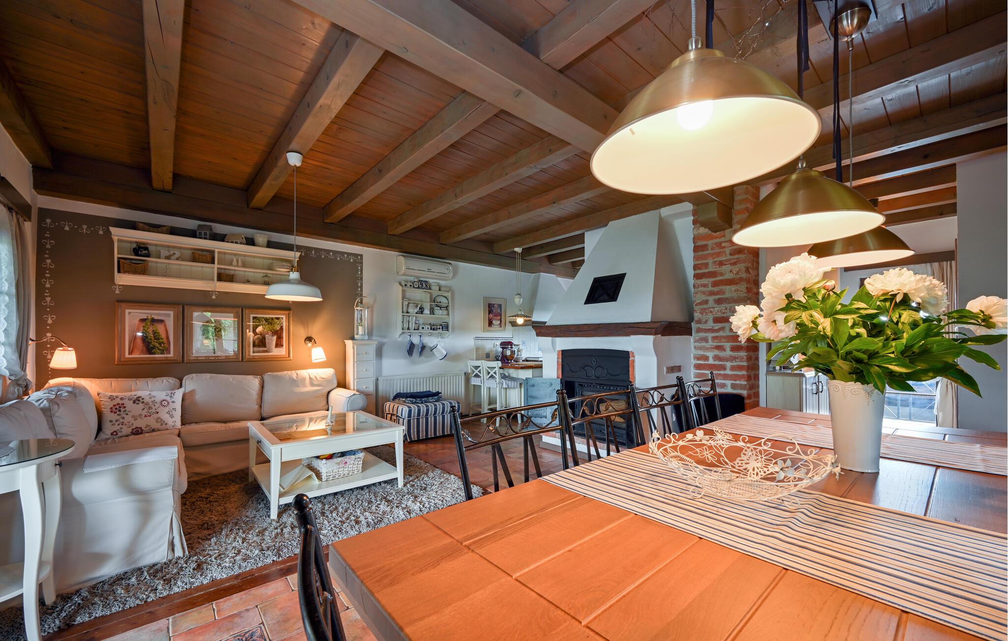 Verbringen Sie einen unvergesslichen Urlaub in einem Haus, das rustikalen Charme mit moderner Behaglichkeit auf harmonische Weise vereint. Die großzügig gestalteten Räume bestechen durch charakteristische Holzbalkendecken, naturbelassenes Mauerwerk und hochwertige Fliesen, die zusammen eine warme, einladende Atmosphäre schaffen. Vertiefen Sie sich in ein gutes Buch auf dem gemütlichen Sofa, bereiten Sie sich ein schmackhaftes Essen in der modernen Küche zu oder verbringen Sie einen unterhaltsamen Spieleabend am großen Esstisch.