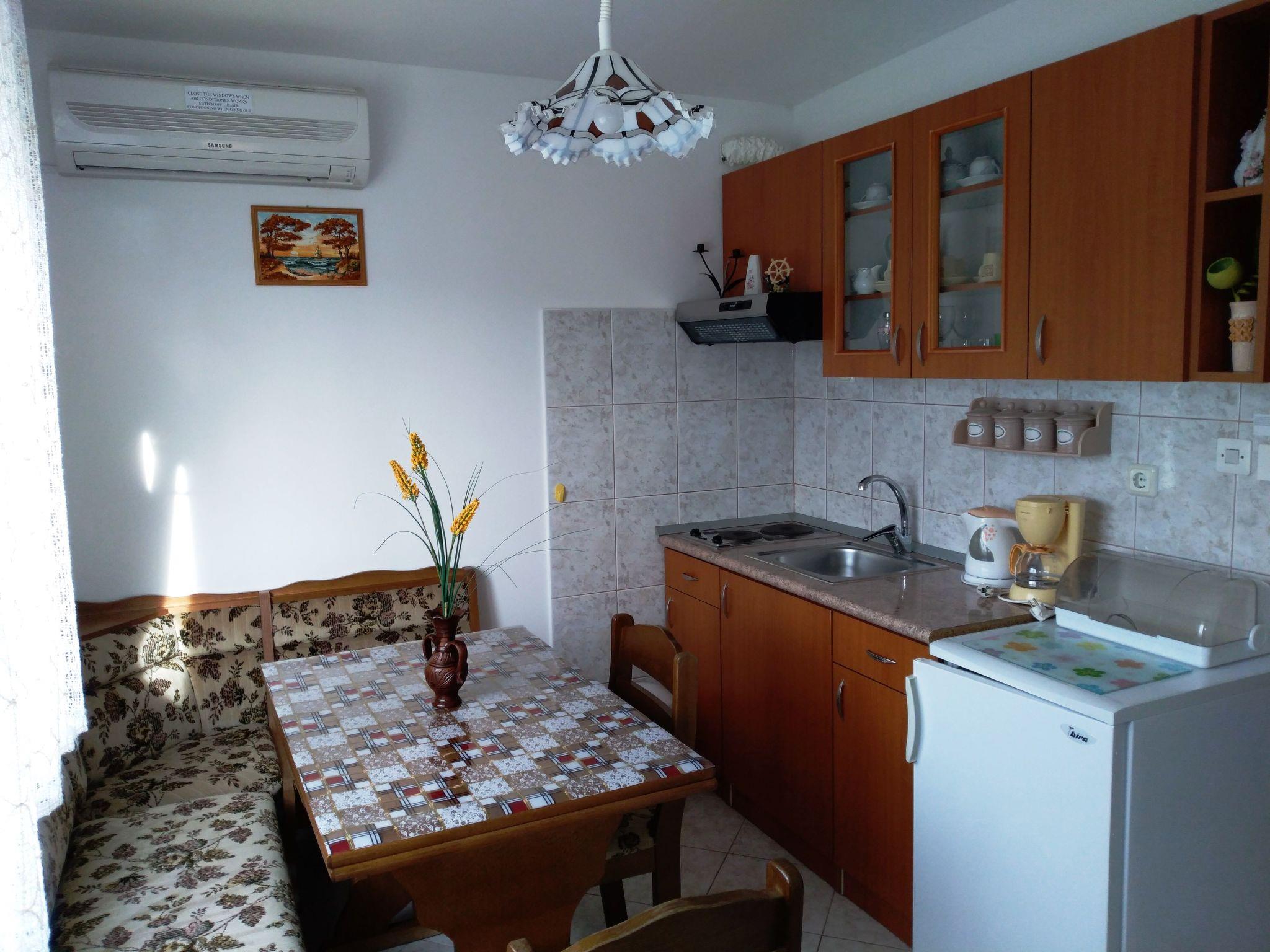 Im Inneren verfügt das Apartment über einen gut ausgestatteten Wohn-Küchenbereich. Hier finden die Gäste eine gemütliche Eckbank und einen Tisch mit einer voll ausgestatteten Küchenzeile vor. Kulinarisch Interessierte werden die Ausstattung mit Herd, Toaster, Kühlschrank und Kaffeemaschine zu schätzen wissen, um sich während des Aufenthalts köstliche Mahlzeiten zuzubereiten. Das Schlafzimmer ist ein gemütlicher Rückzugsort mit einem Doppelbett und einem Schlafsofa, das verschiedene Schlafmöglichkeiten bietet. Außerdem gibt es einen Fernseher zur Unterhaltung und einen kleinen Tisch mit zwei Stühlen, die für ein komfortables und angenehmes Raumerlebnis sorgen.