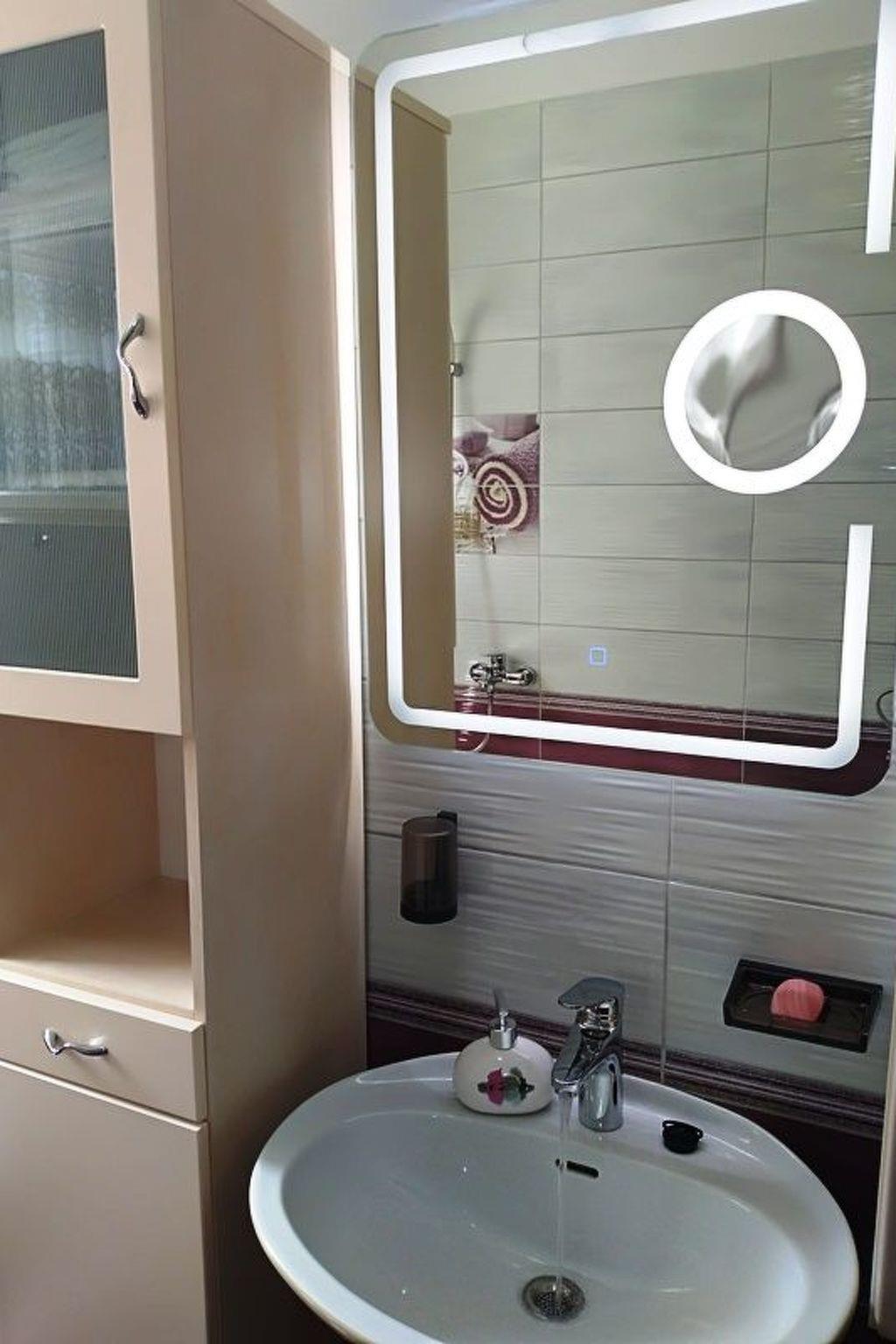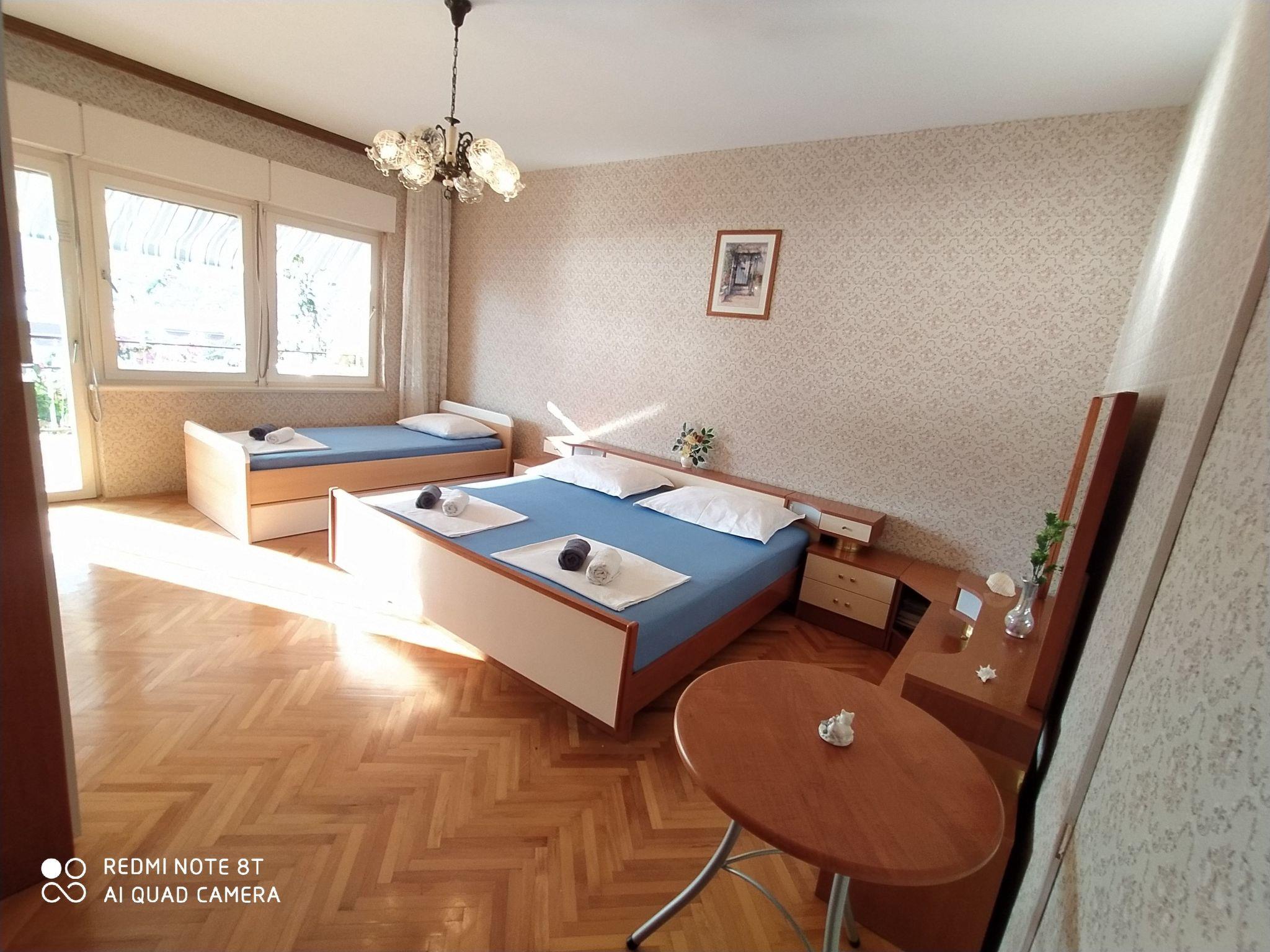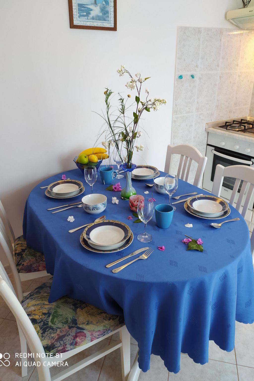 Diese 100 m² große Wohnung bietet Platz für sechs Personen. Sie verfügt über eine Wohnküche mit Tisch, Stühlen und Küchenzeile, die mit Herd, Backofen, Kühlschrank und Kaffeemaschine ausgestattet ist. Es gibt drei Schlafzimmer, die alle Balkon mit Meerblick haben. Das erste Schlafzimmer verfügt über ein Doppel- und ein Einzelbett. Das zweite hat ein Doppelbett und ein Schlafsofa. Im dritten steht ein Einzelbett. Der Fernseher befindet sich in einem der Schlafzimmer. Das Badezimmer ist mit Badewanne und WC ausgestattet.