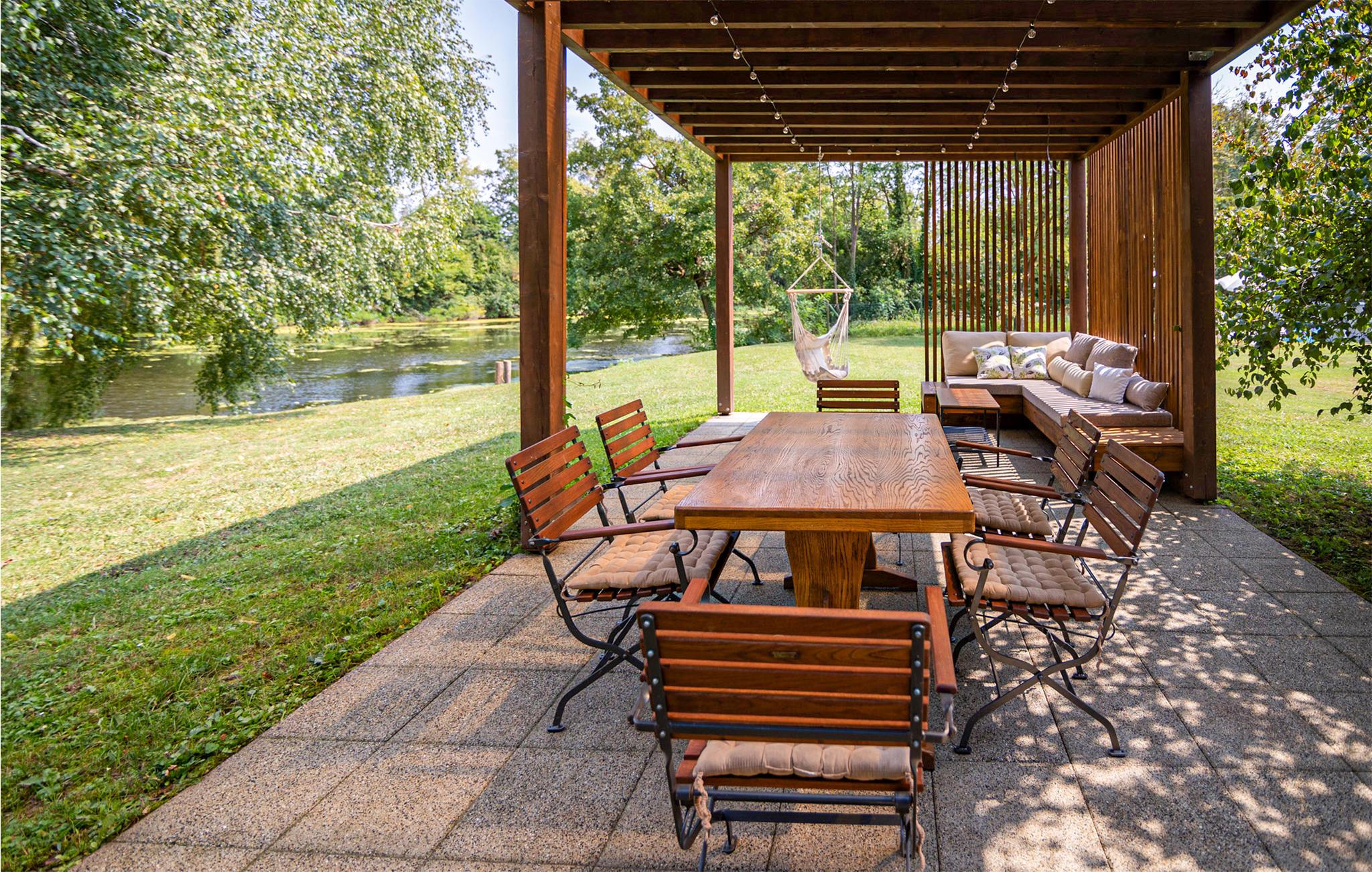 Genießen Sie auch Ihre Zeit auf der schönen Terrasse und auf dem riesigen Naturgrundstück mit mehreren familienfreundlichen Aktivitäten (beachten Sie bei Kindern jedoch die Nähe zum Wasser). Spielen Sie eine Runde Badminton, versammeln Sie sich zu einem spannenden Fußballmatch oder lassen Sie sich auf dem Badesteg nieder und erholen Sie sich beim beruhigenden Blick auf das sanft vorbeifließende Wasser.