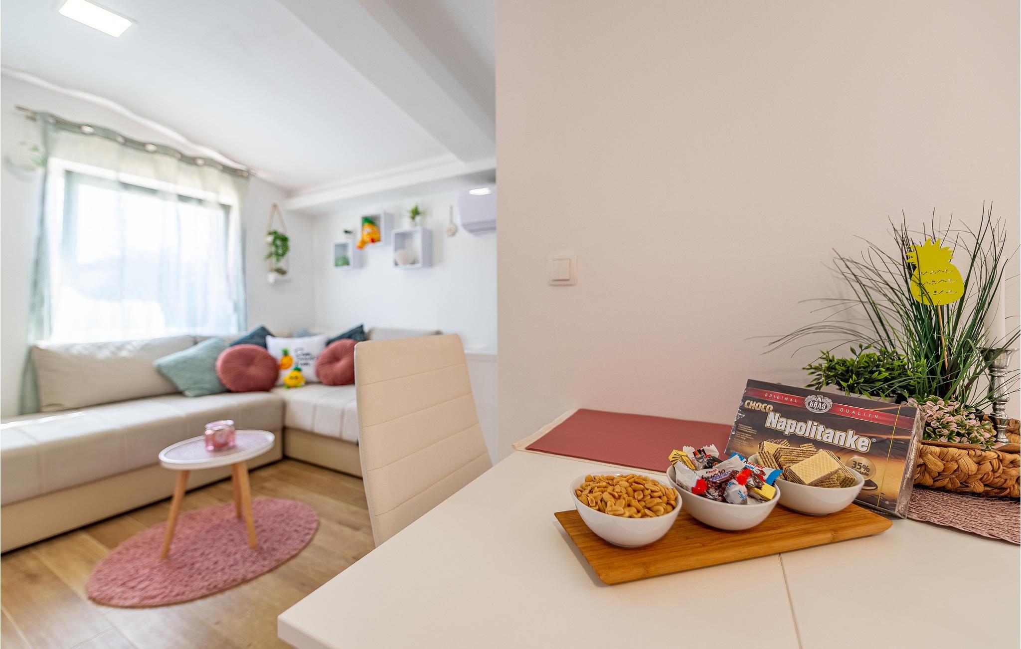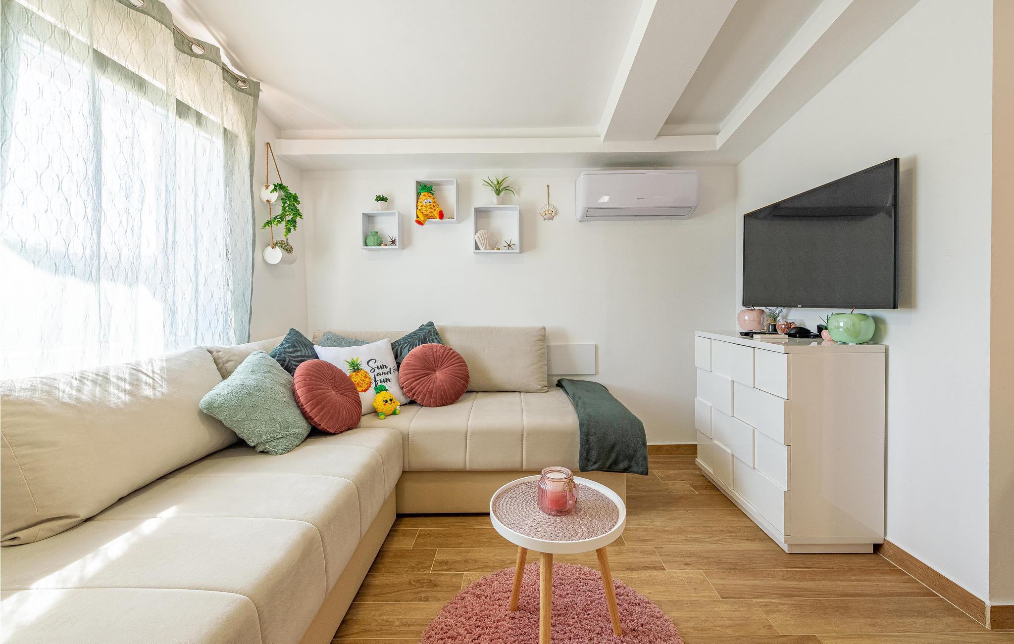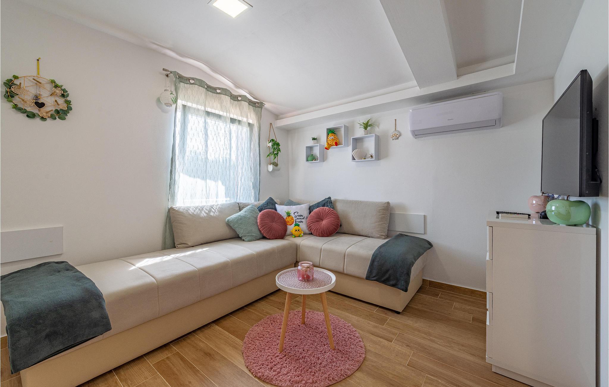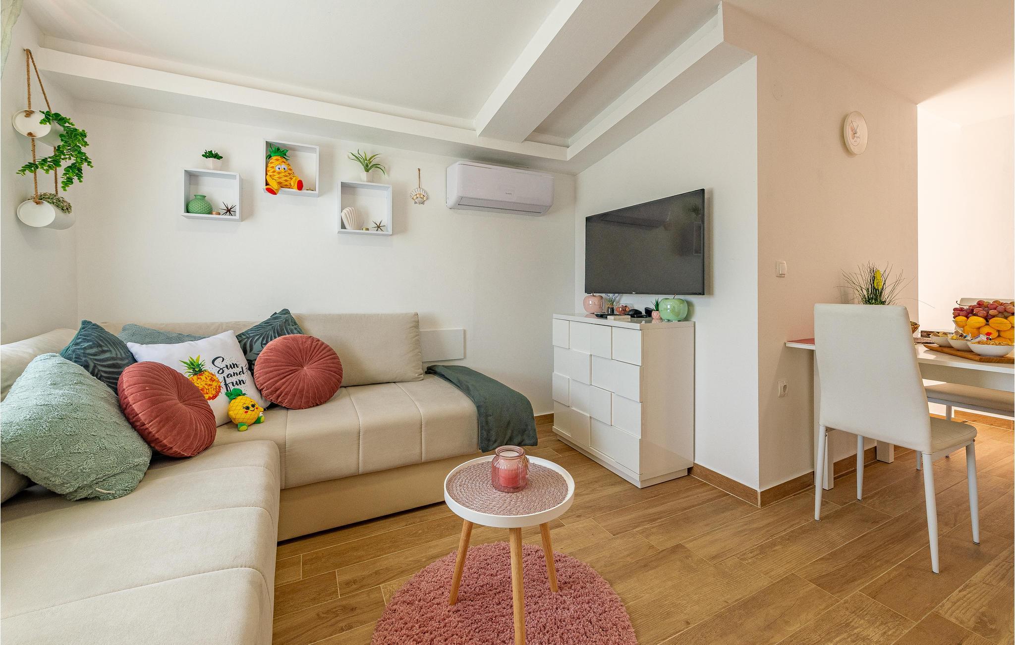 Die?Wohnung?begrüßt?ihre?Gäste?im?1. Stock eines?Hauses. Mit?ihrer?modernen?und?ansprechenden?Einrichtung?ist?sie?der ideale?Ort?für?einen?erholsamen?Urlaub?zu?jeder?Jahreszeit. Im Wohnzimmer befinden sich 2 Sofas. Eine Klimaanlage sorgt auch in heißen Sommern für angenehme Raumtemperaturen.?