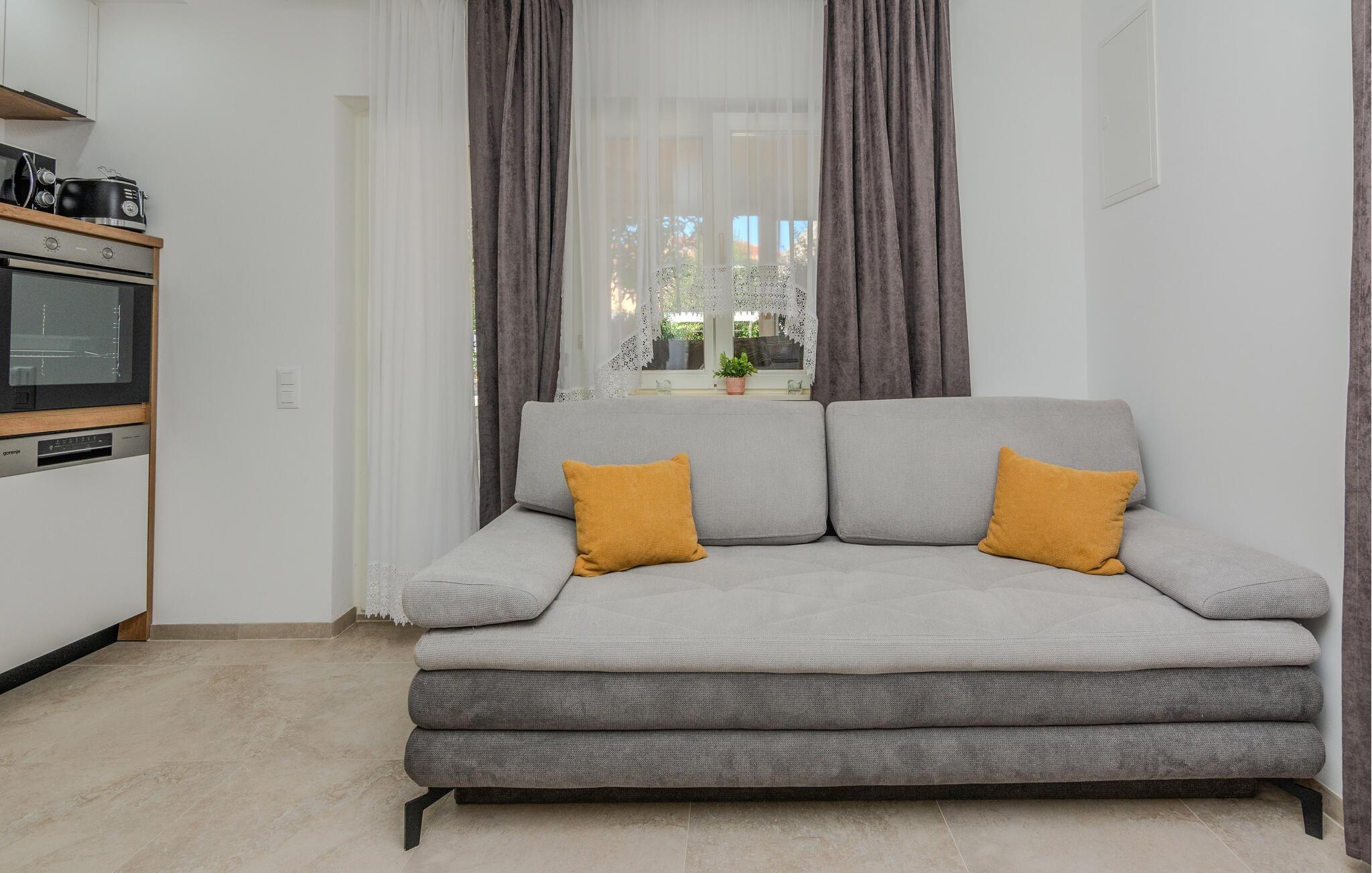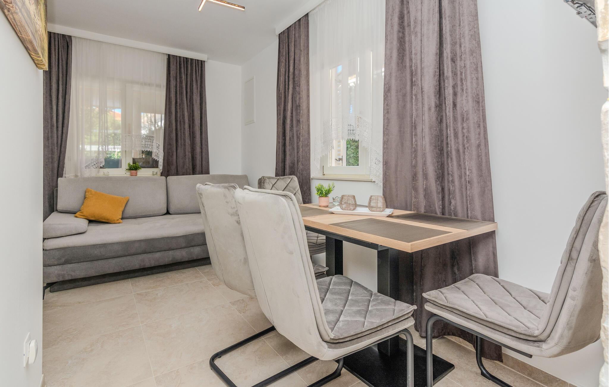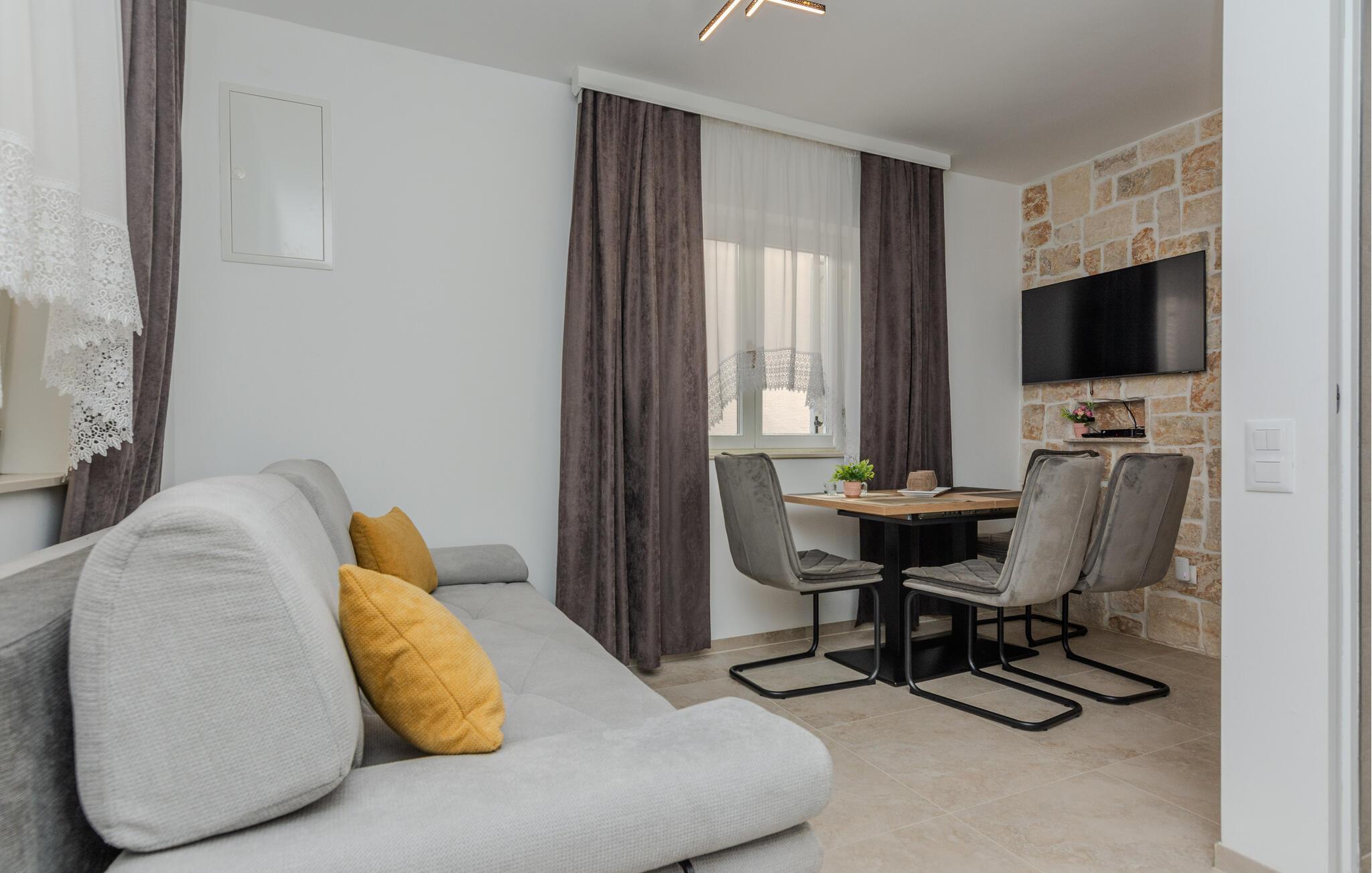 Willkommen in dieser einladenden Ferienwohnung in Vir, wo Sie ein entspanntes Urlaubserlebnis erwartet. Die Wohnung beeindruckt Sie mit einer geschmackvollen Einrichtung, die eine gemütliche und entspannte Atmosphäre schafft. Genießen Sie den offen gestalteten Wohnbereich, der fließend in eine gut ausgestattete Küche übergeht.