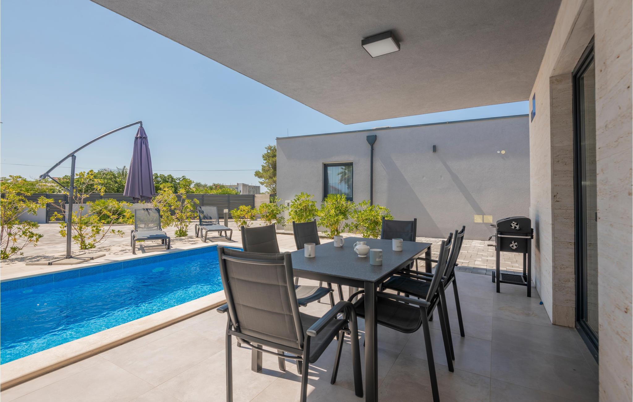 Vom Wohnzimmer aus gelangt man auf eine überdachte Terrasse mit Grill, vor der ein Swimmingpool mit ausschließlich für Sie bestimmten Liegestühlen zur Erfrischung und Entspannung dient.