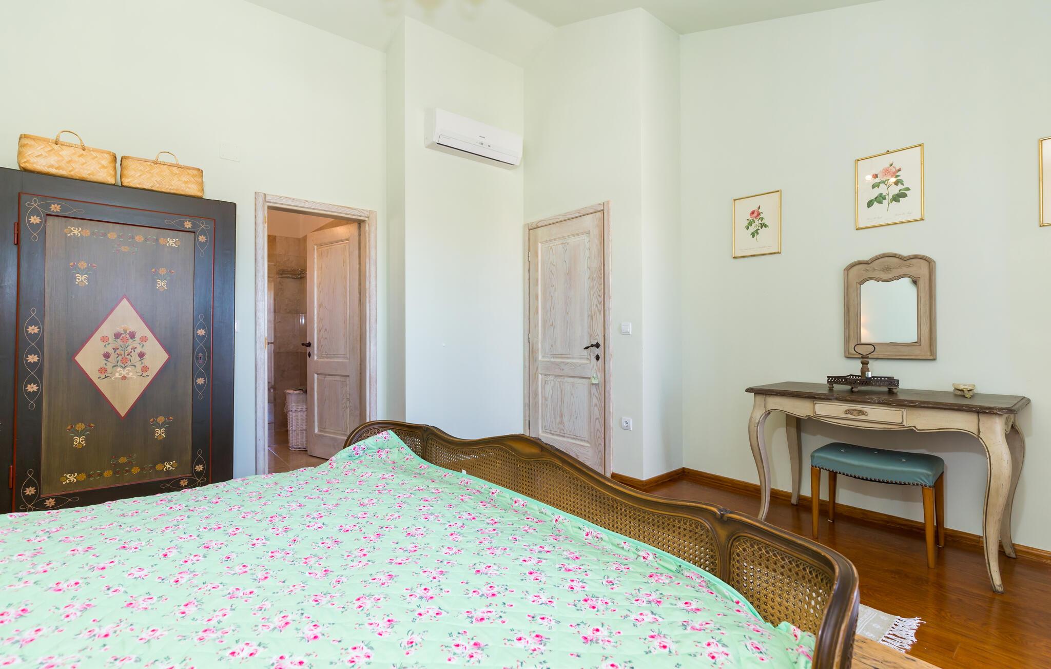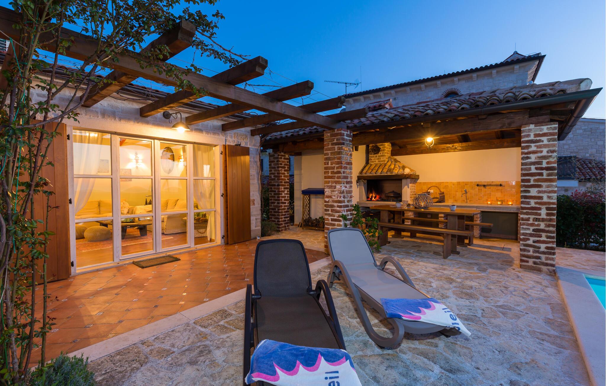 Treten Sie hinaus und genießen Sie ein ausgiebiges Frühstück im herrlichen Garten. Entspannen Sie auf den Sonnenliegen am einladenden Pool, erfrischen Sie sich im kristallklaren Wasser oder bereiten Sie in der überdachten Außenküche stimmungsvolle Barbecues zu. Verbringen Sie laue Sommerabende auf der Terrasse, während Ihr Blick über die friedliche Umgebung schweift.